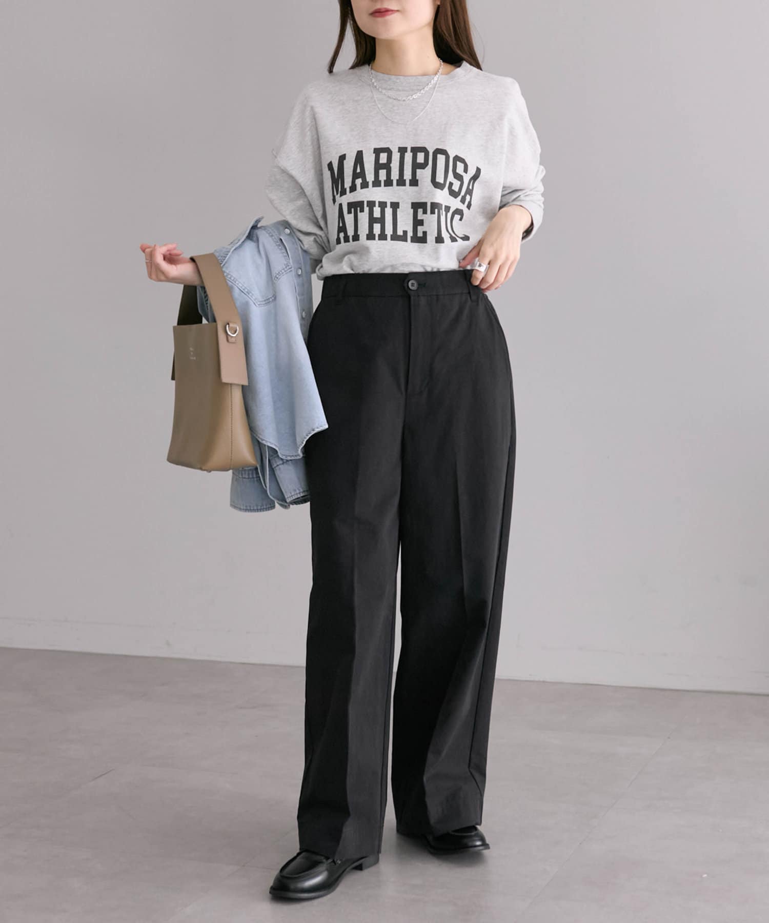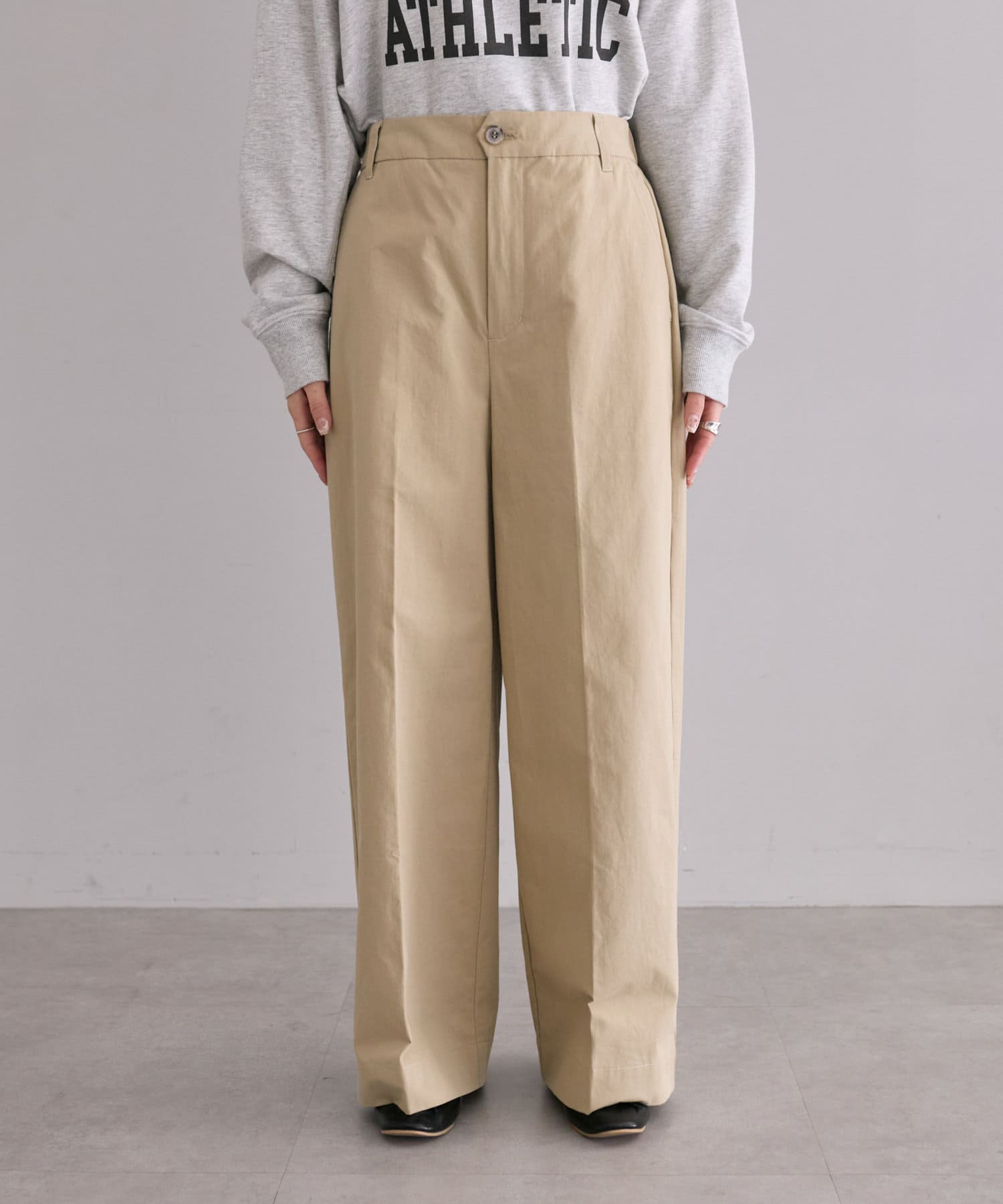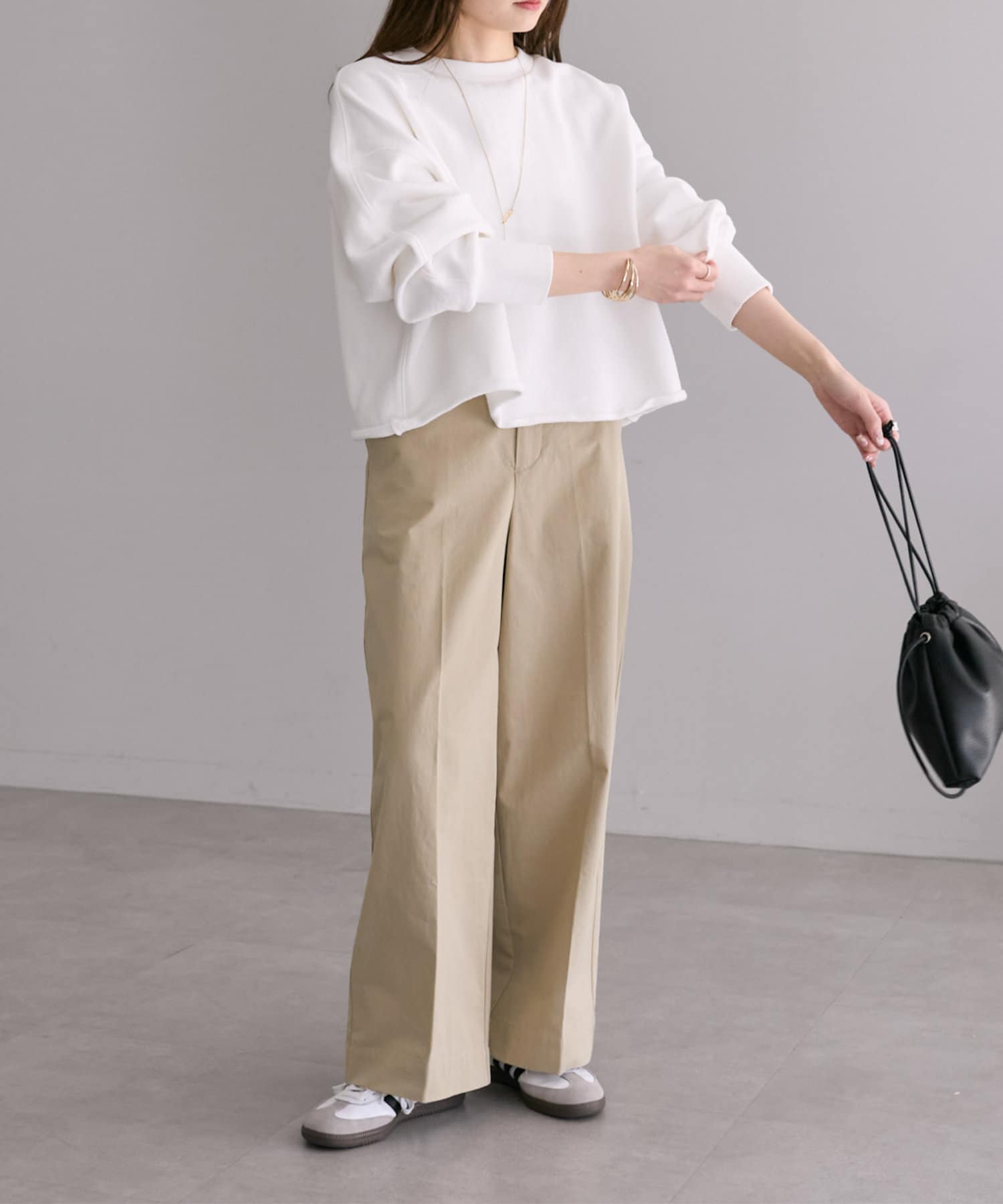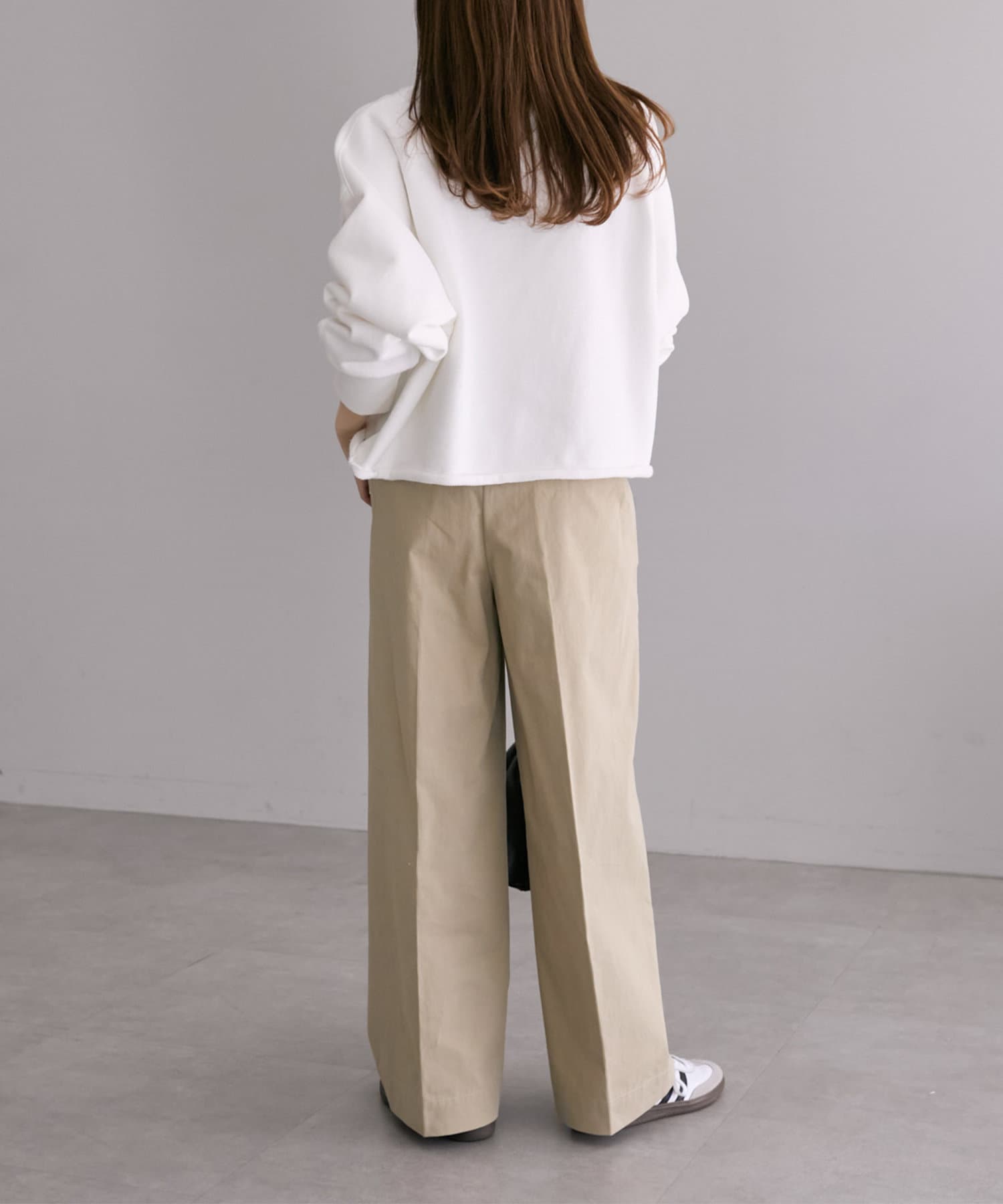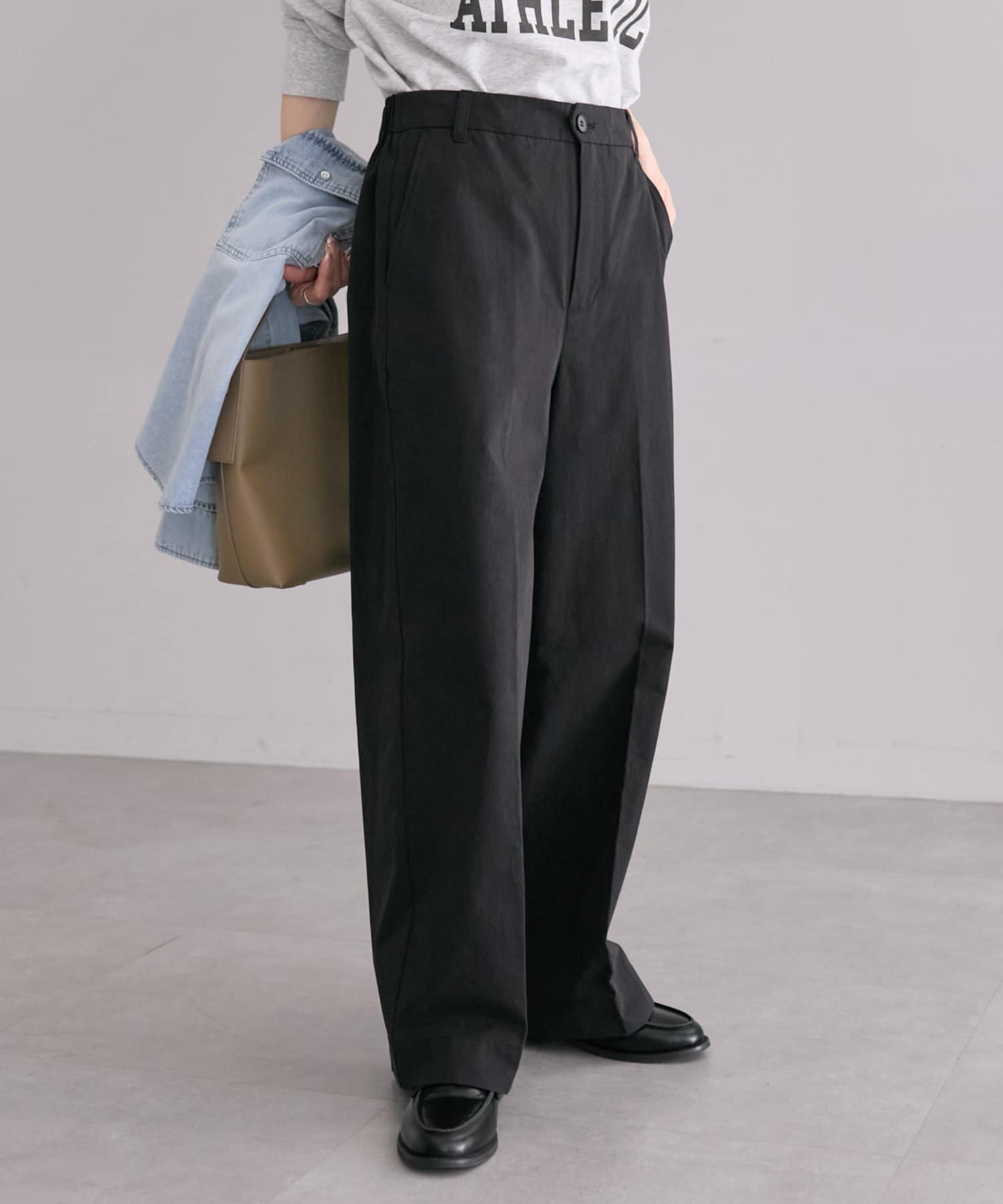 カジュアルにもきれいめにも活躍するセンタープレスパンツ。