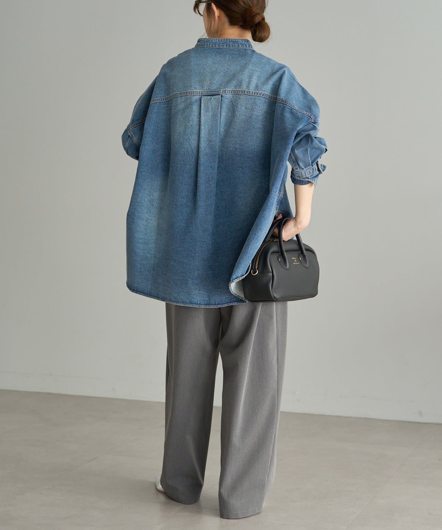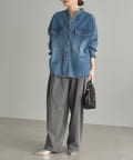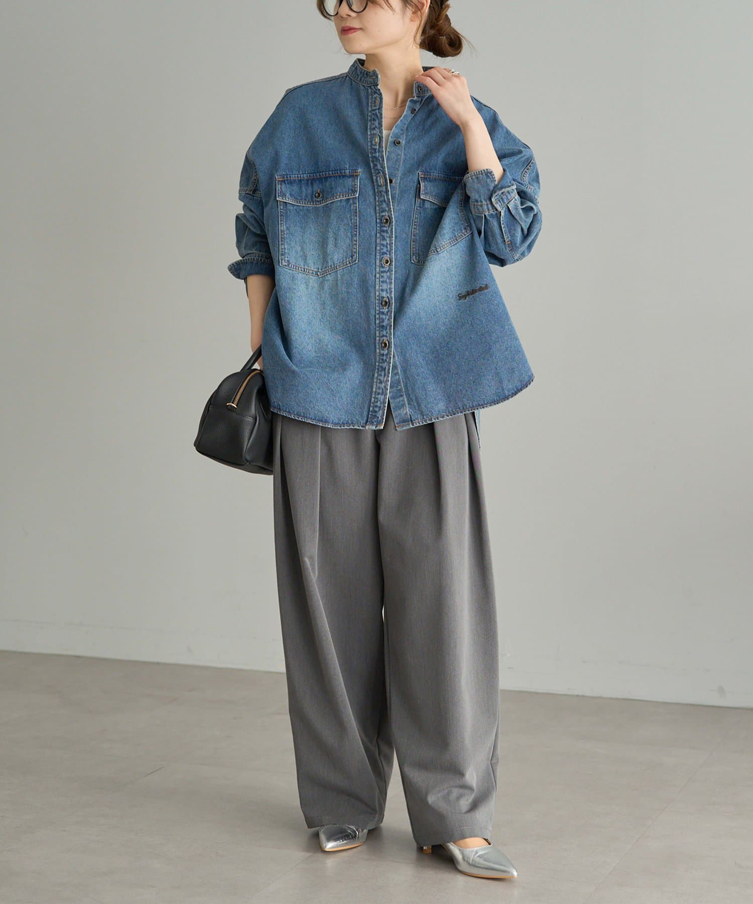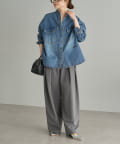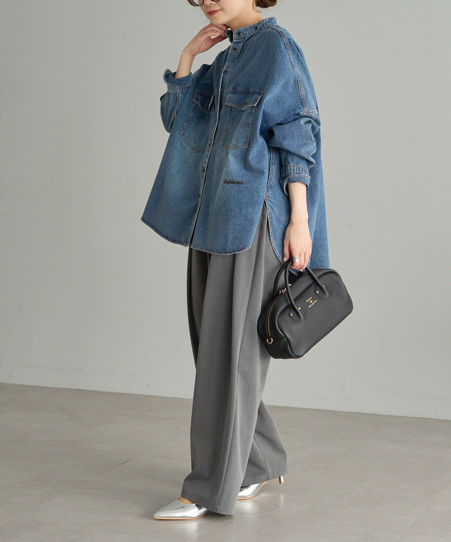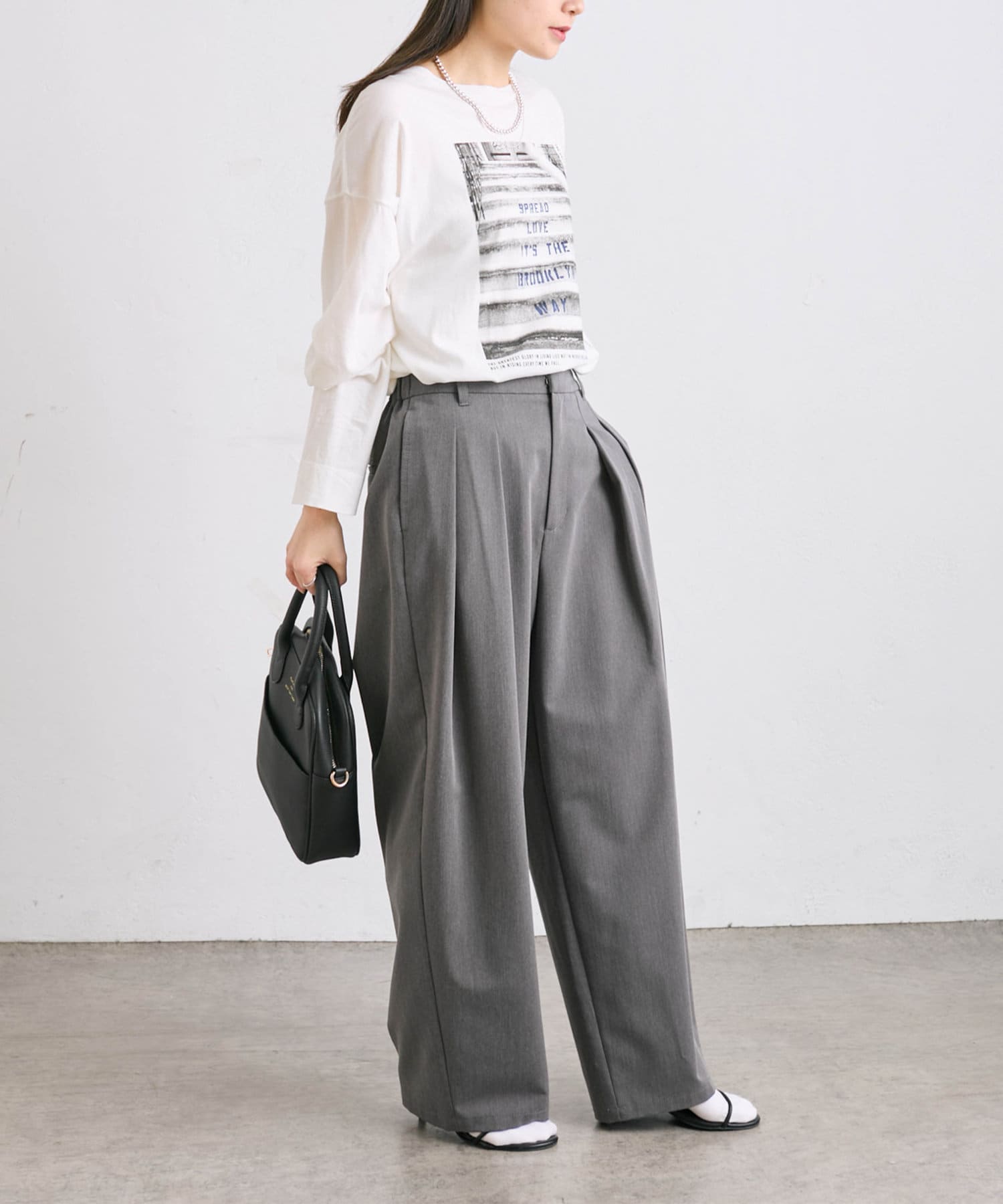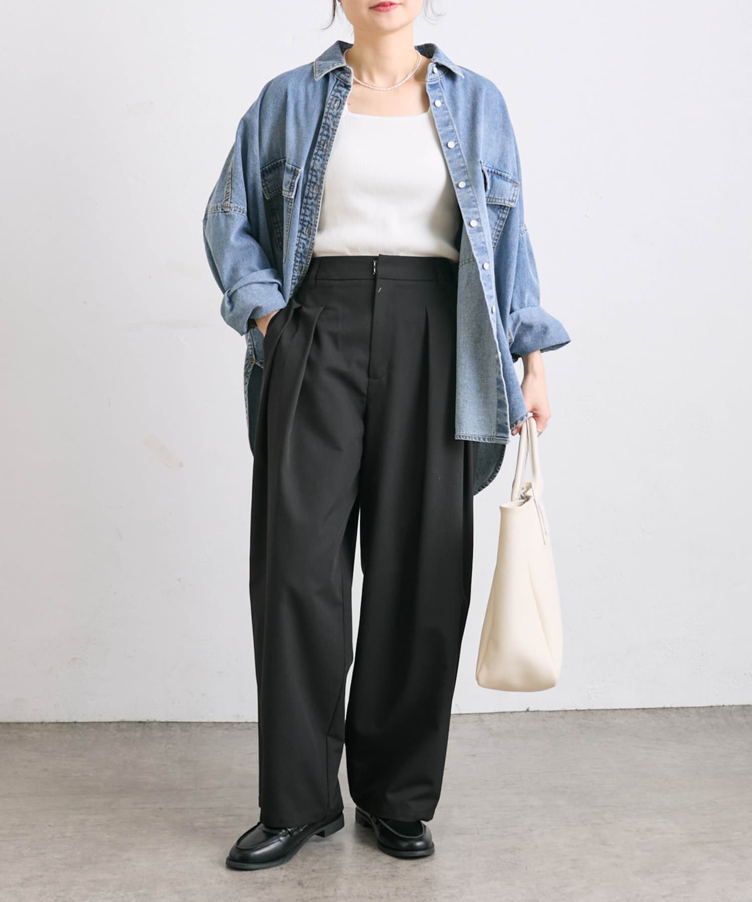 フロントタックのデザインとワイドシルエットでマニッシュな印象に仕上げた一着。