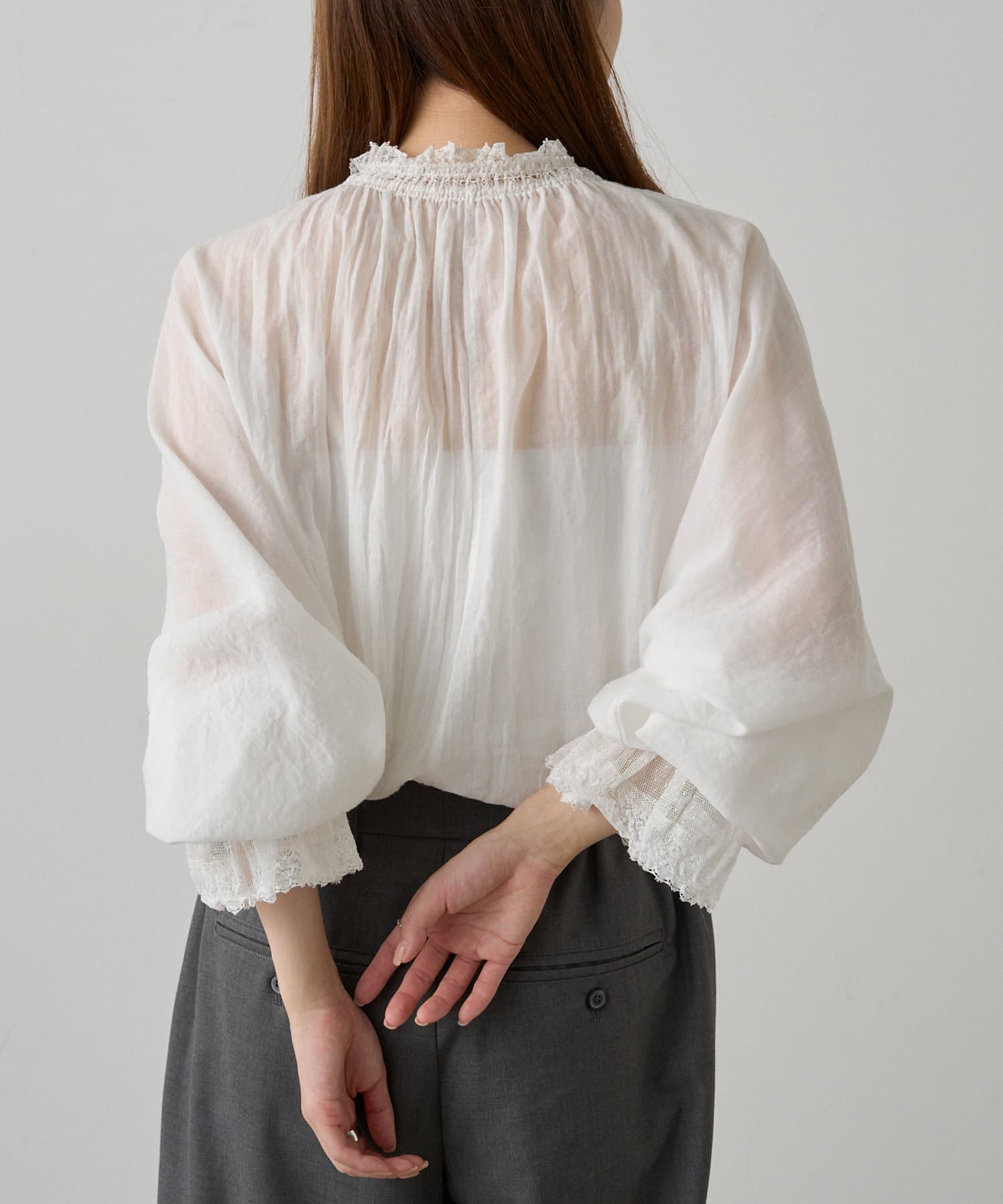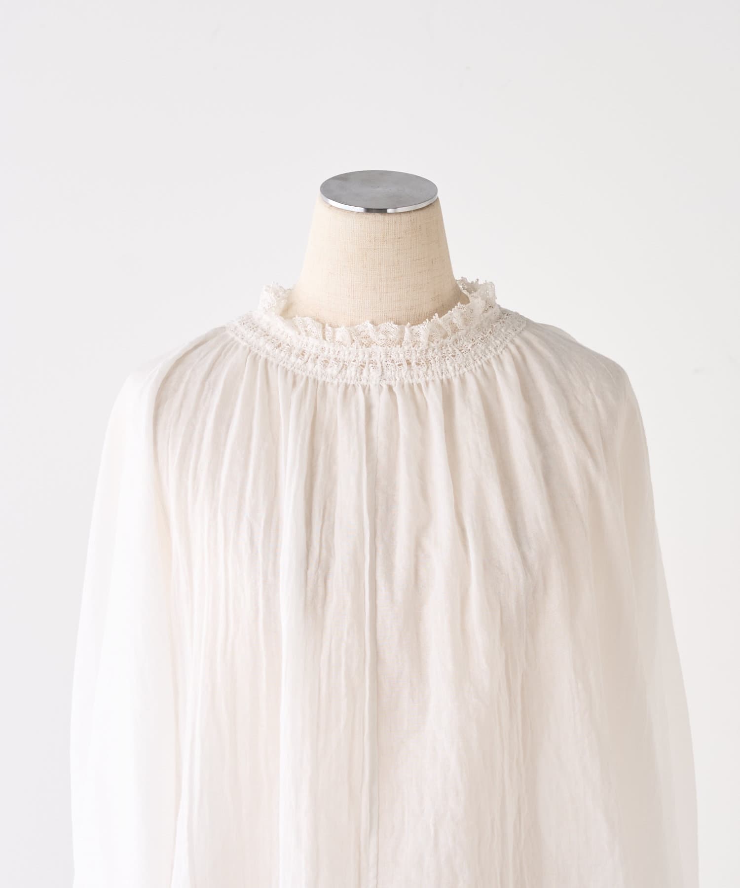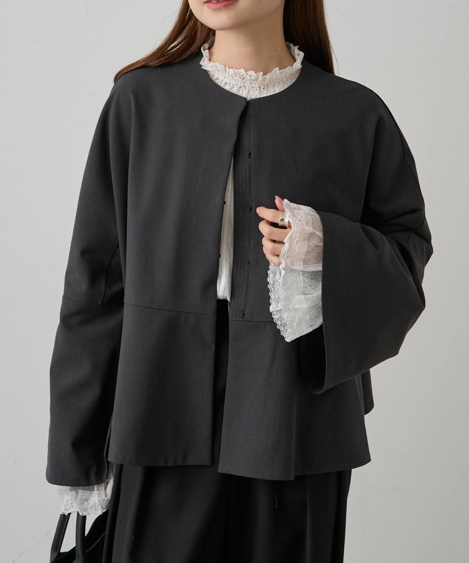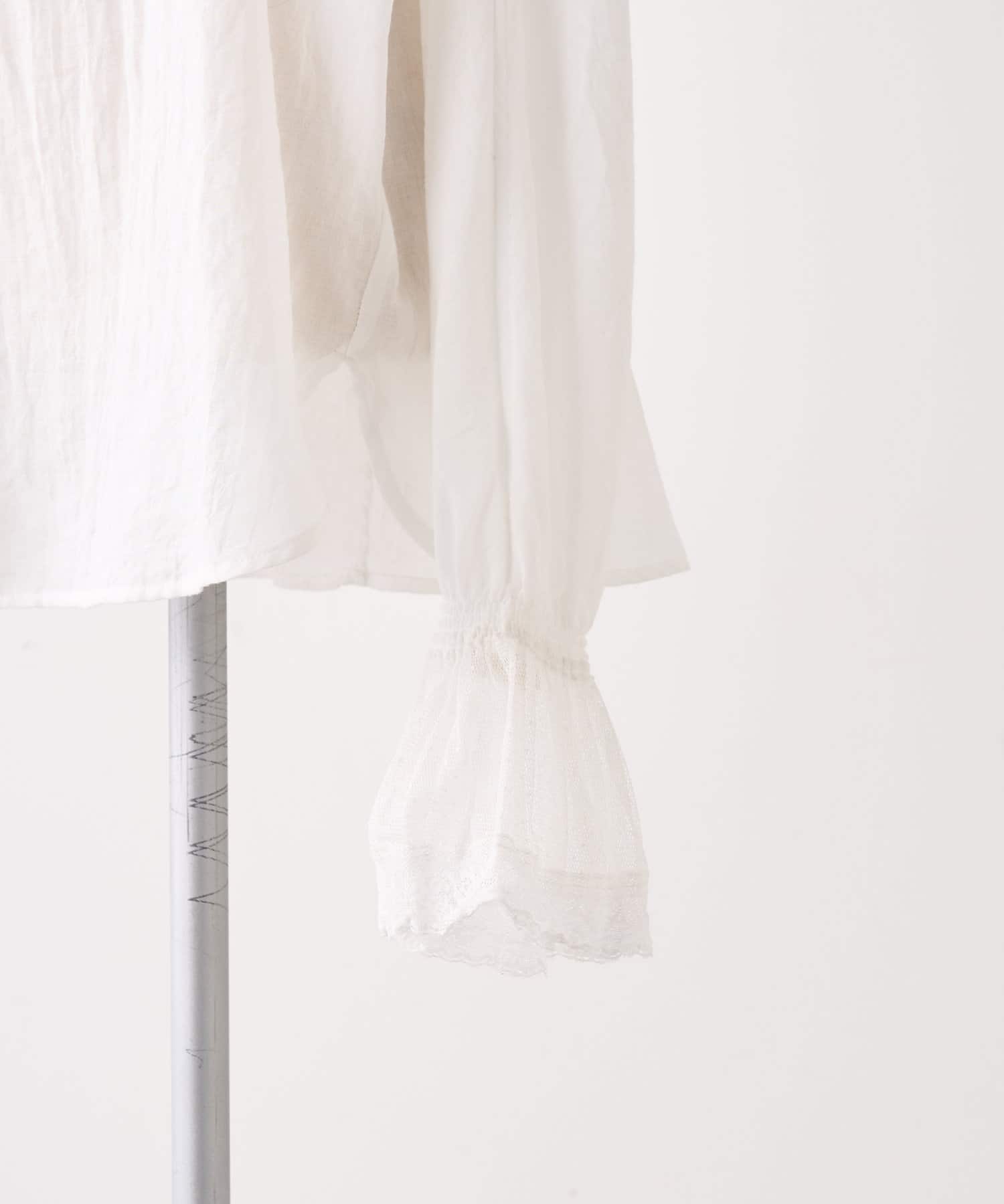 襟と袖それぞれ異なる日本製の繊細なレースを配し、