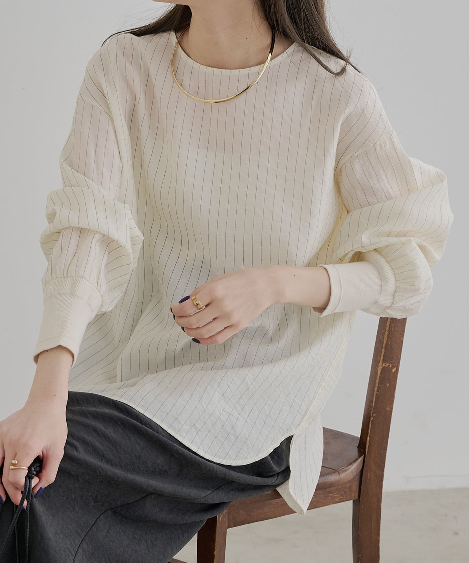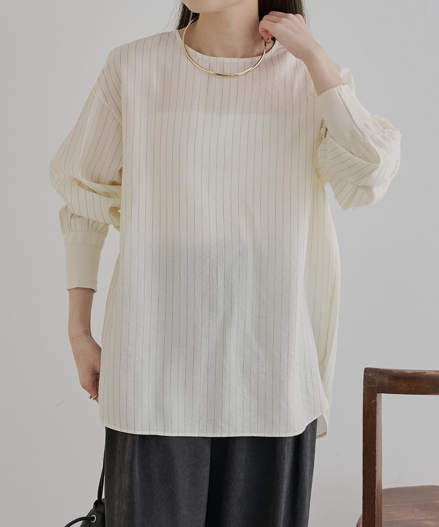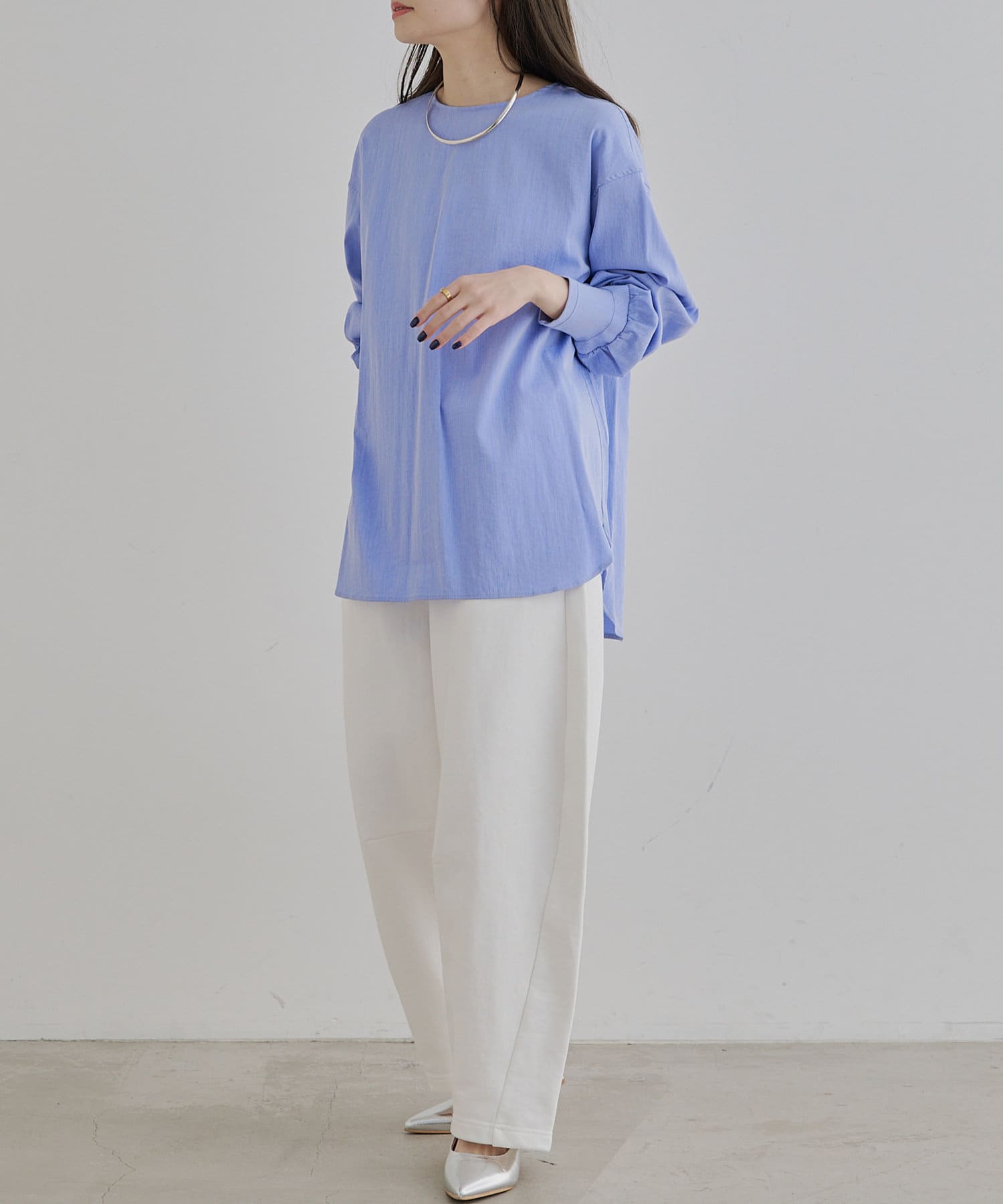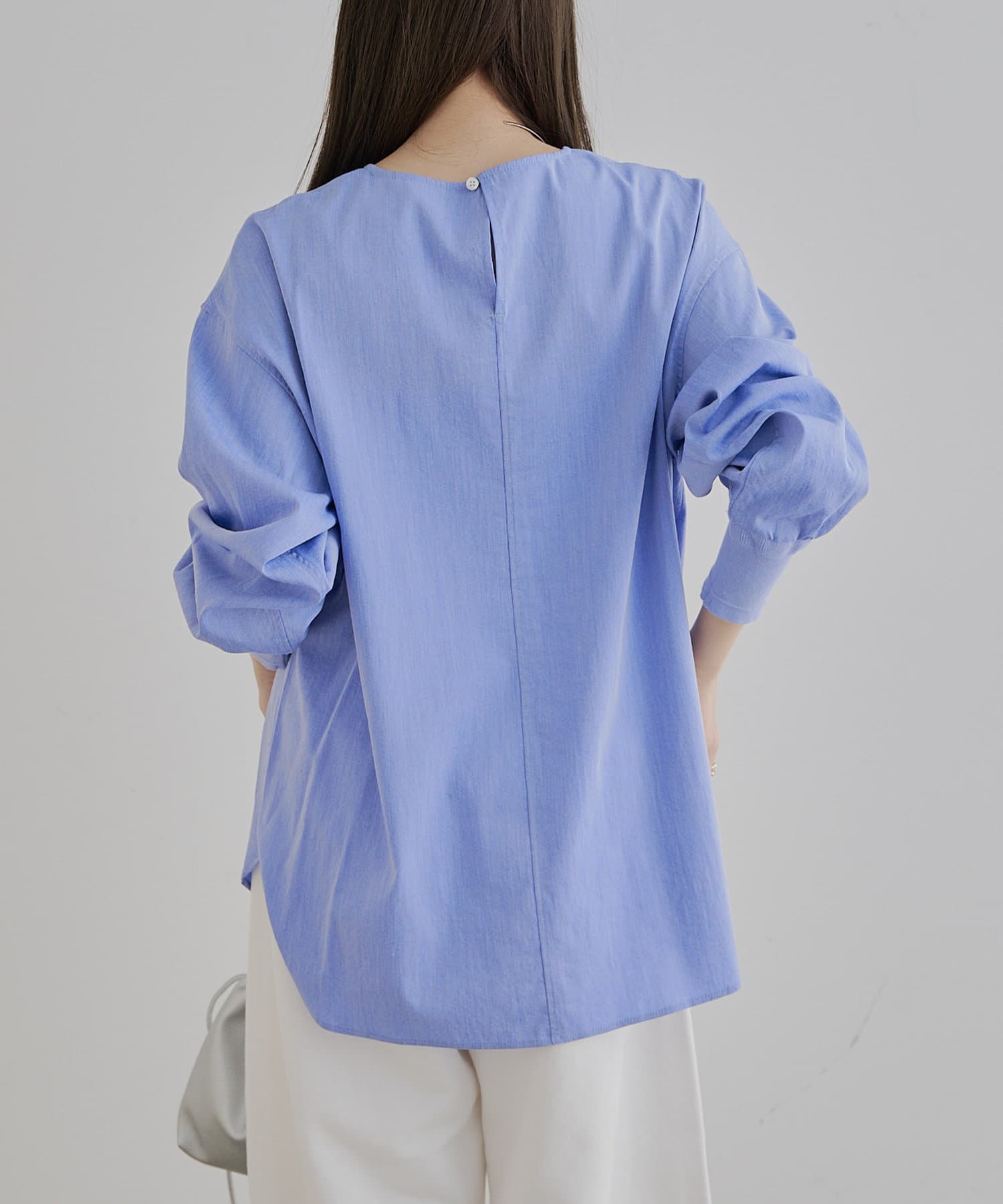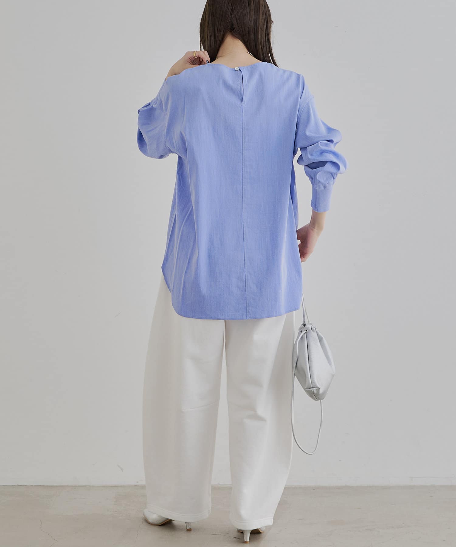 ブラウスとしてそのまま1枚着はもちろん、ベストやスウェット、カーディガンなどレイヤードスタイルが楽しめます。