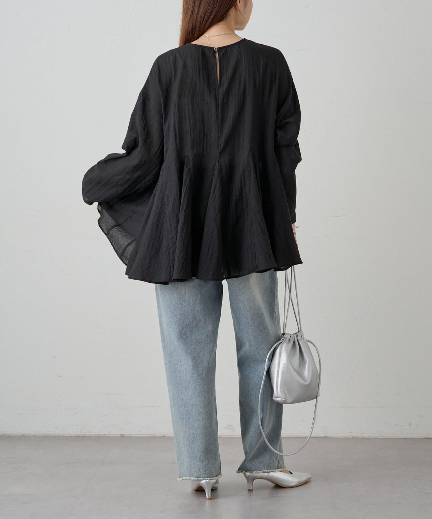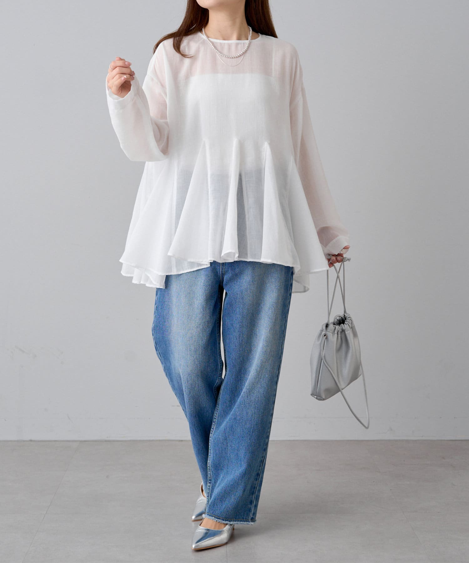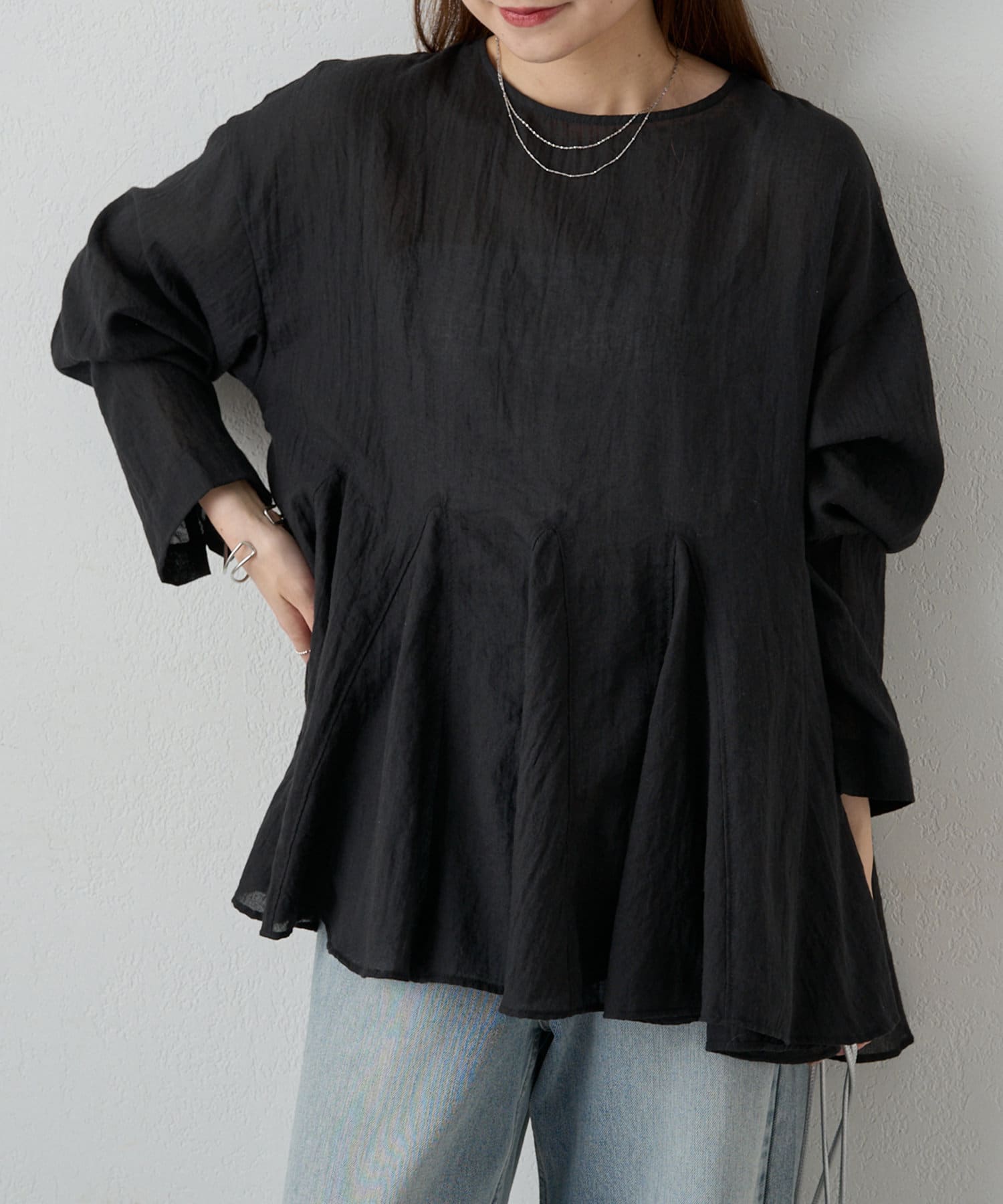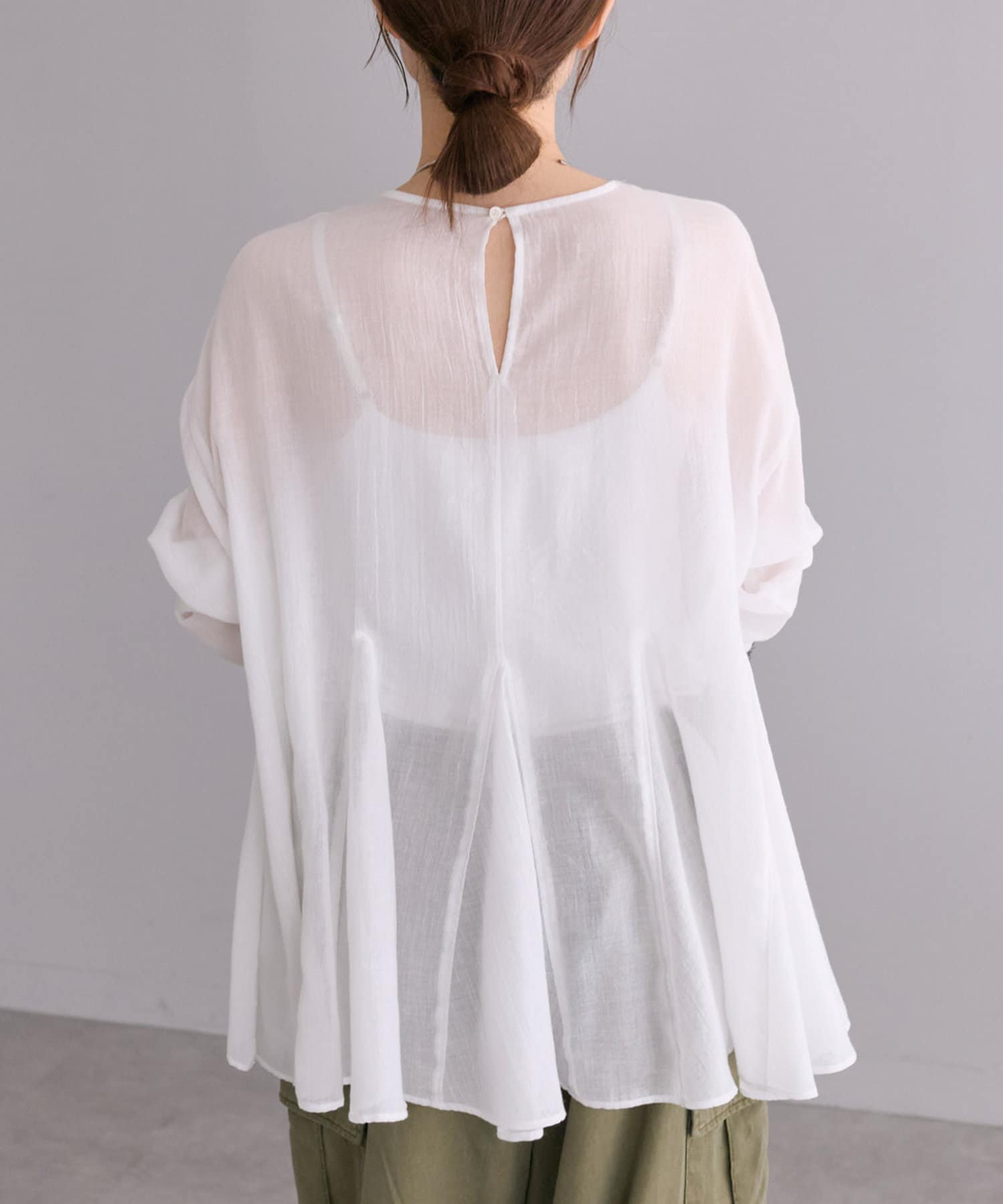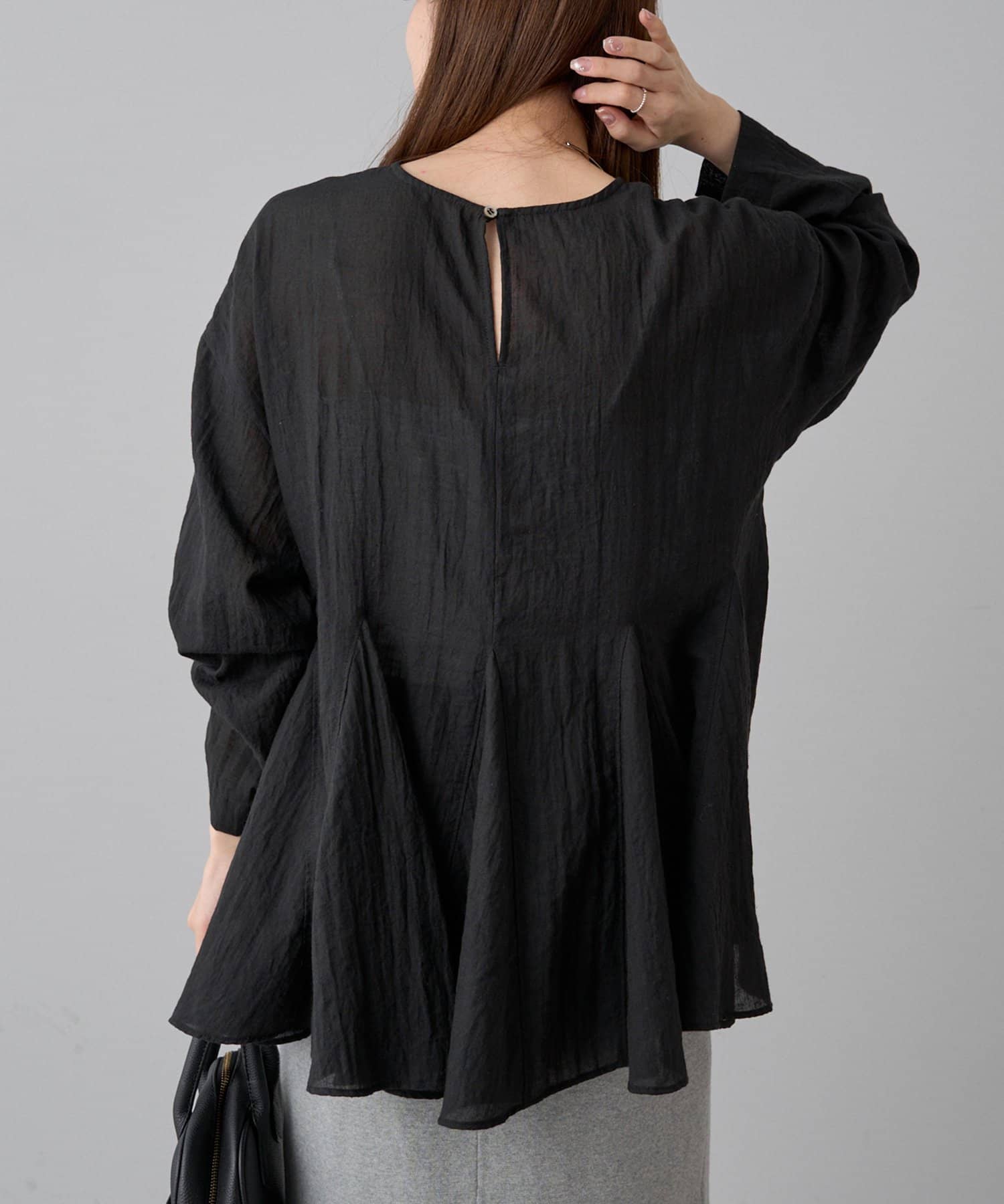 ウエスト部分の切り返しから裾に向かって広がっているフレアデザインのシアーブラウス。