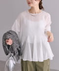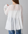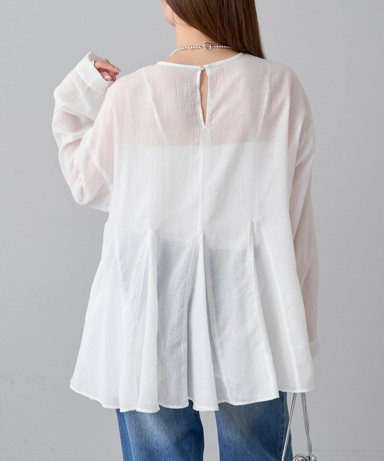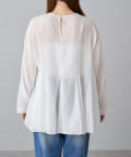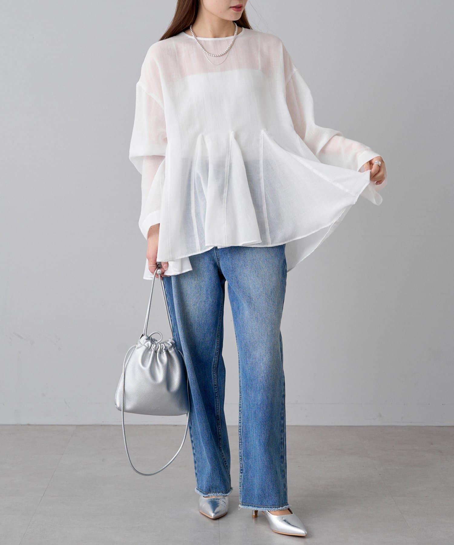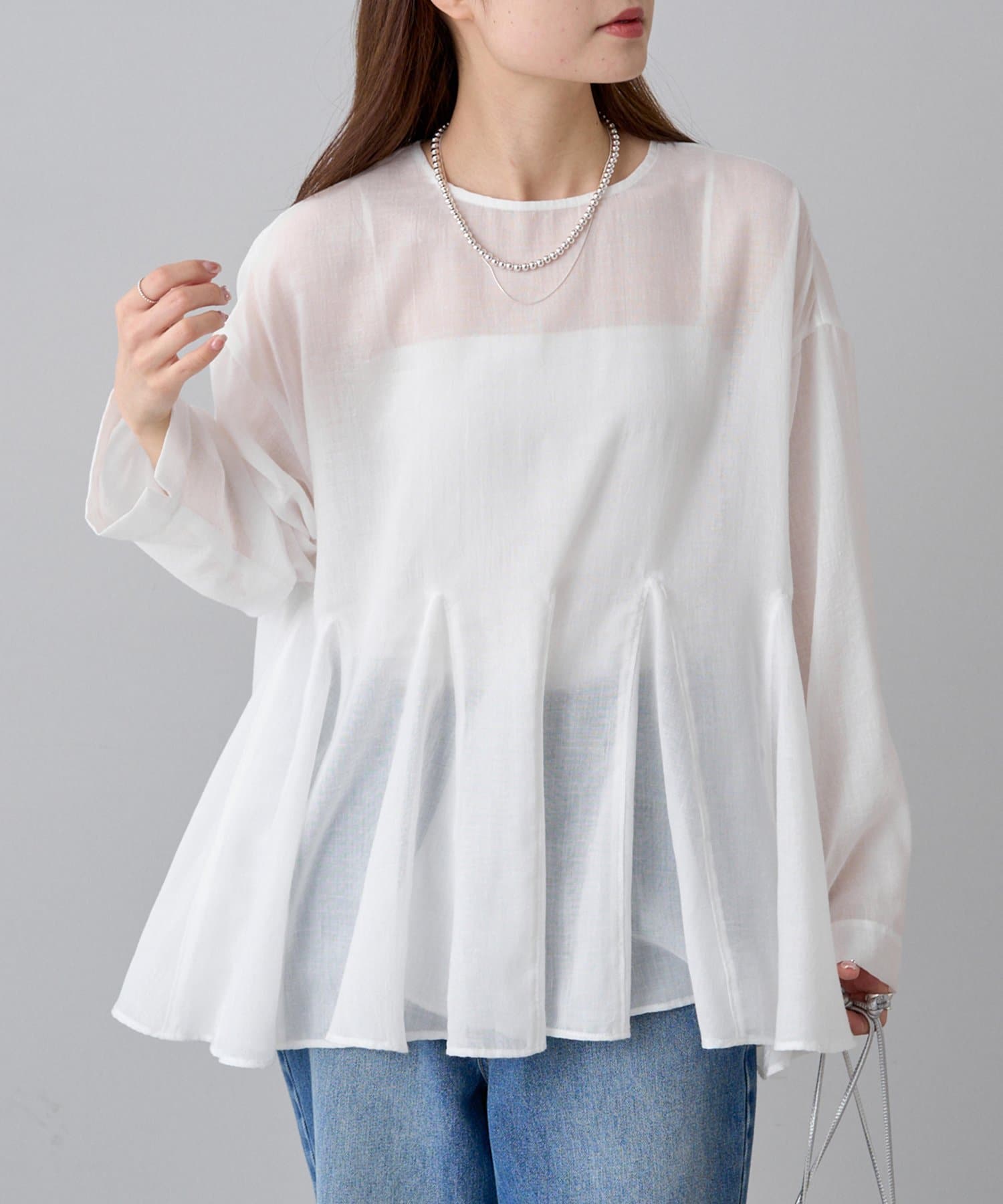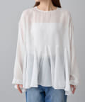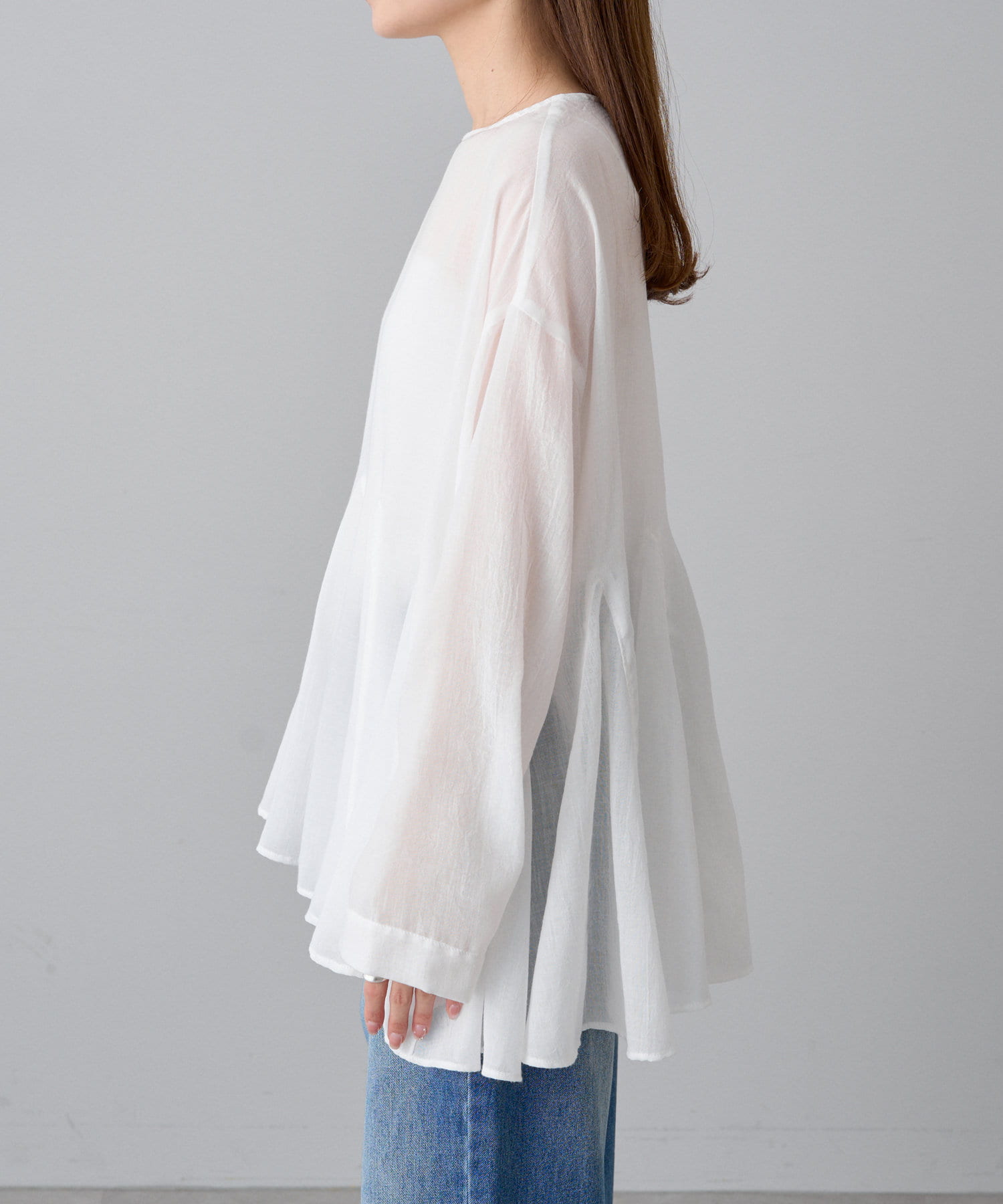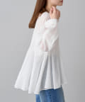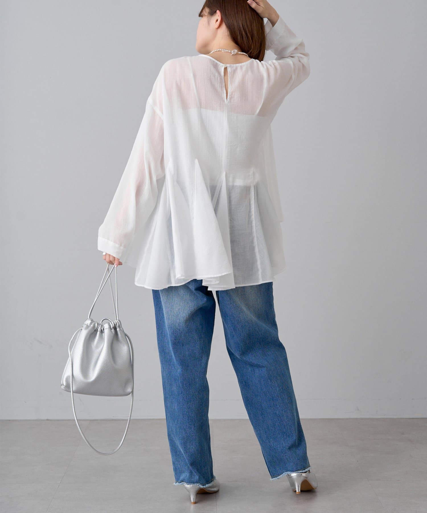 ウエスト部分の切り返しから裾に向かって広がっているフレアデザインのシアーブラウス。