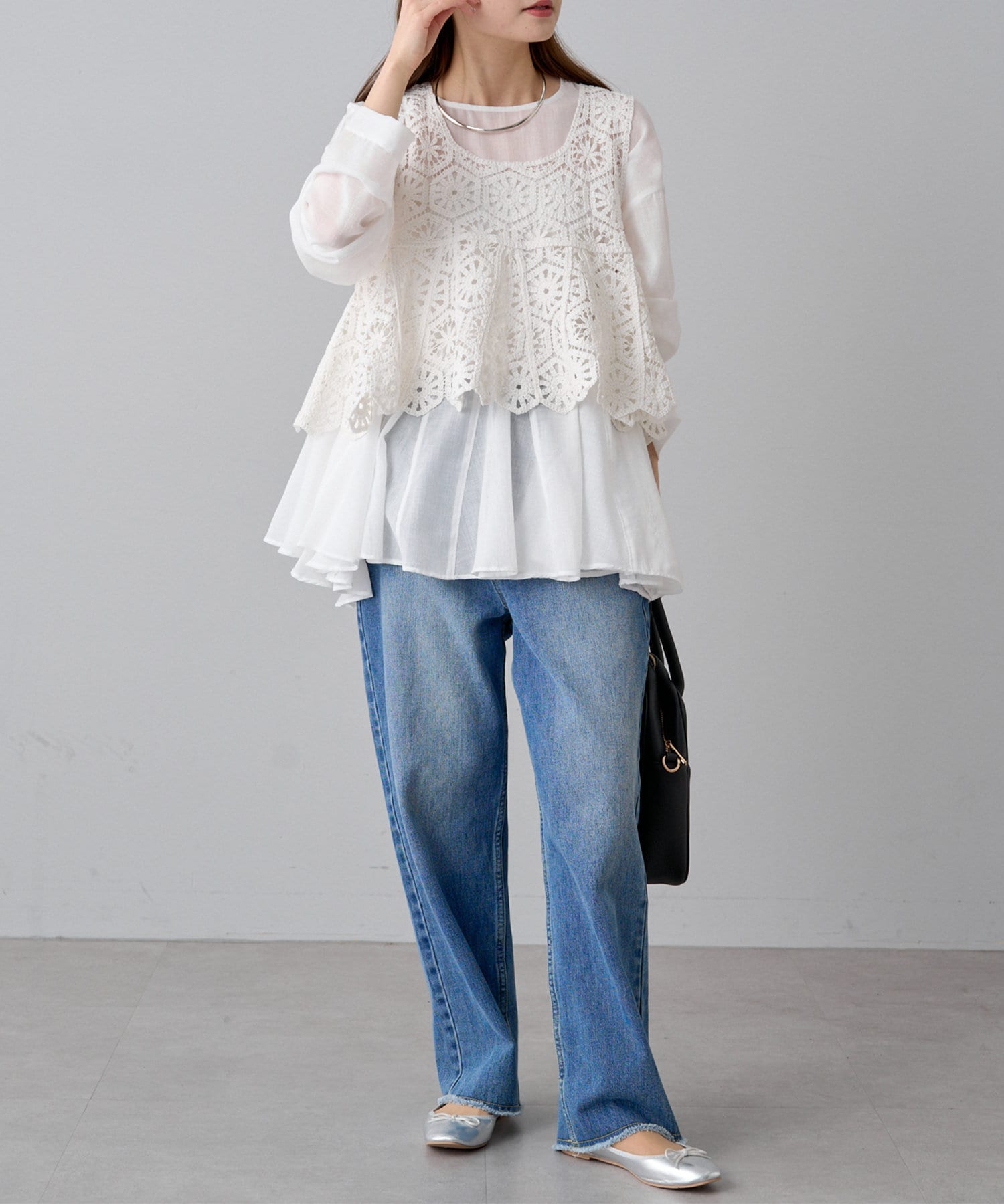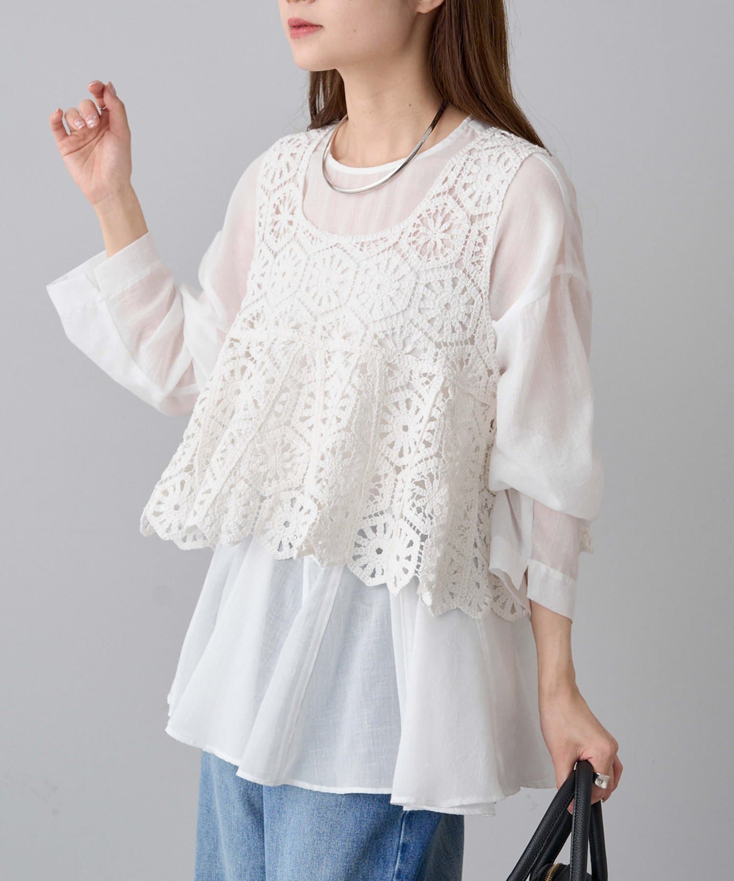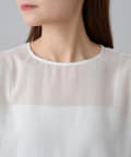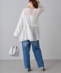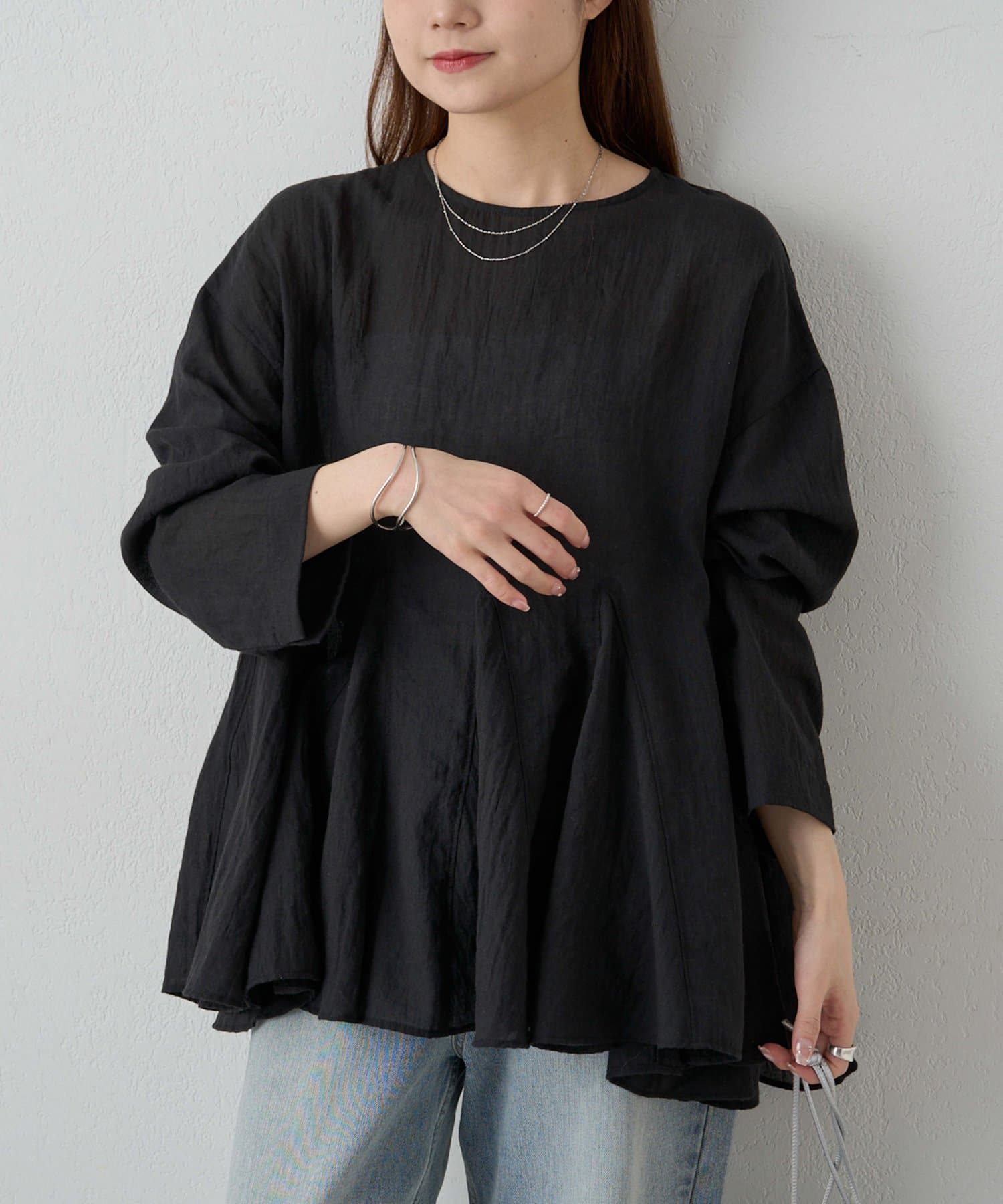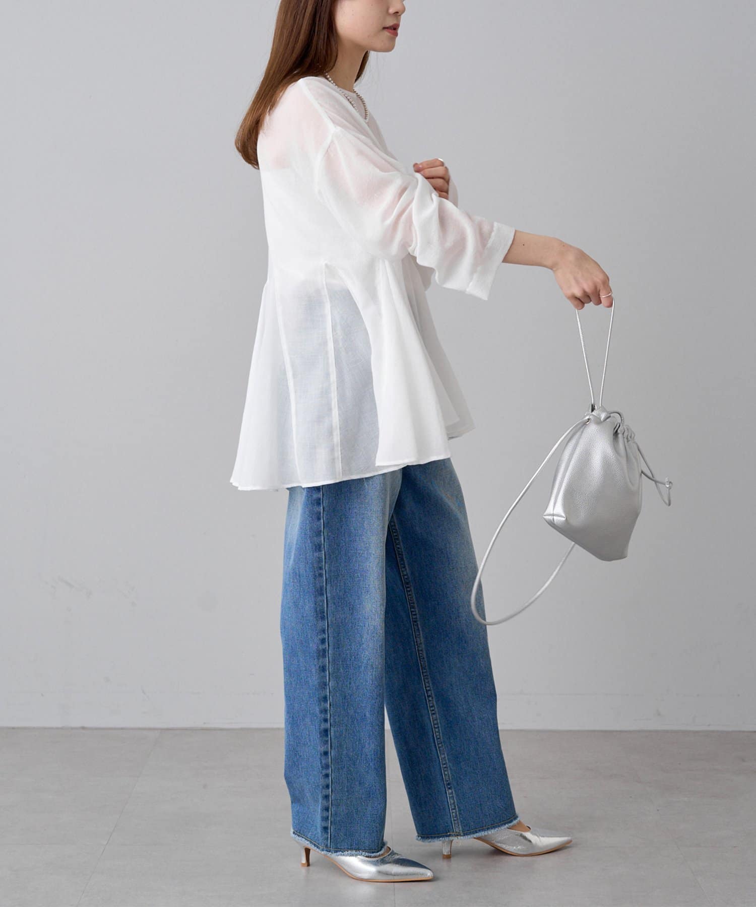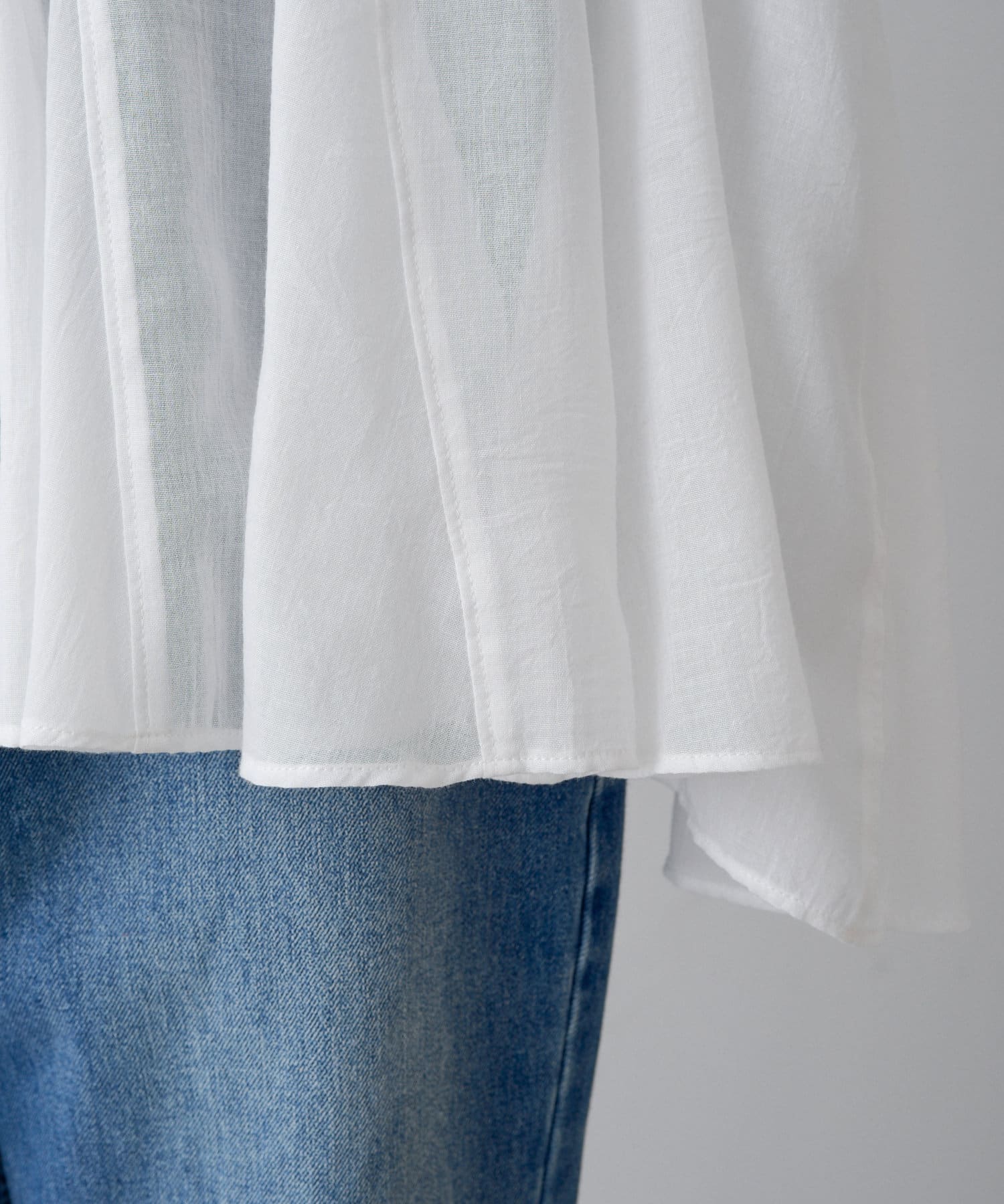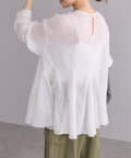 ウエスト部分の切り返しから裾に向かって広がっているフレアデザインのシアーブラウス。