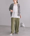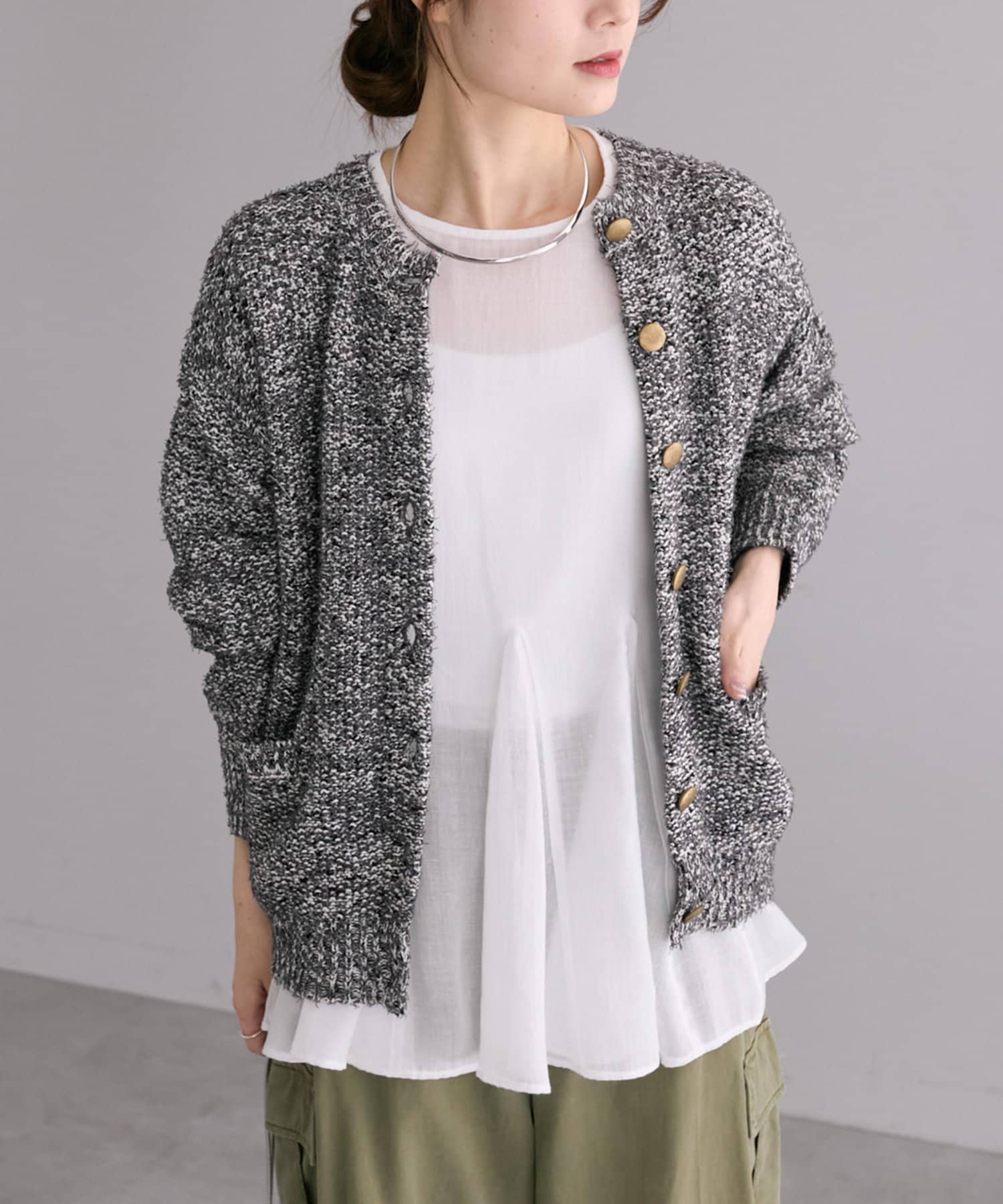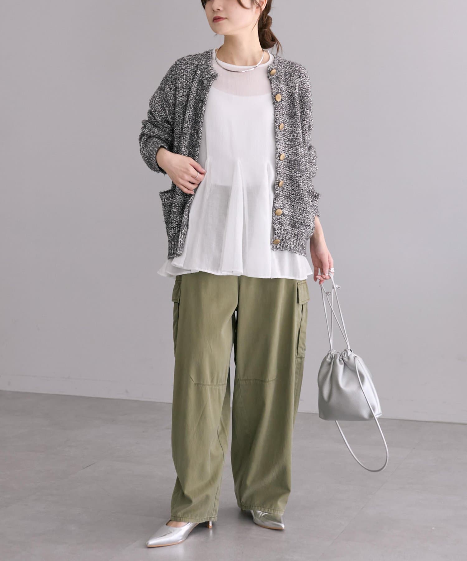 ヒップ回りに届く着丈で、フェミニンな印象を与えつつ腰回りをカバー。