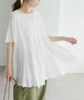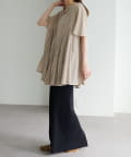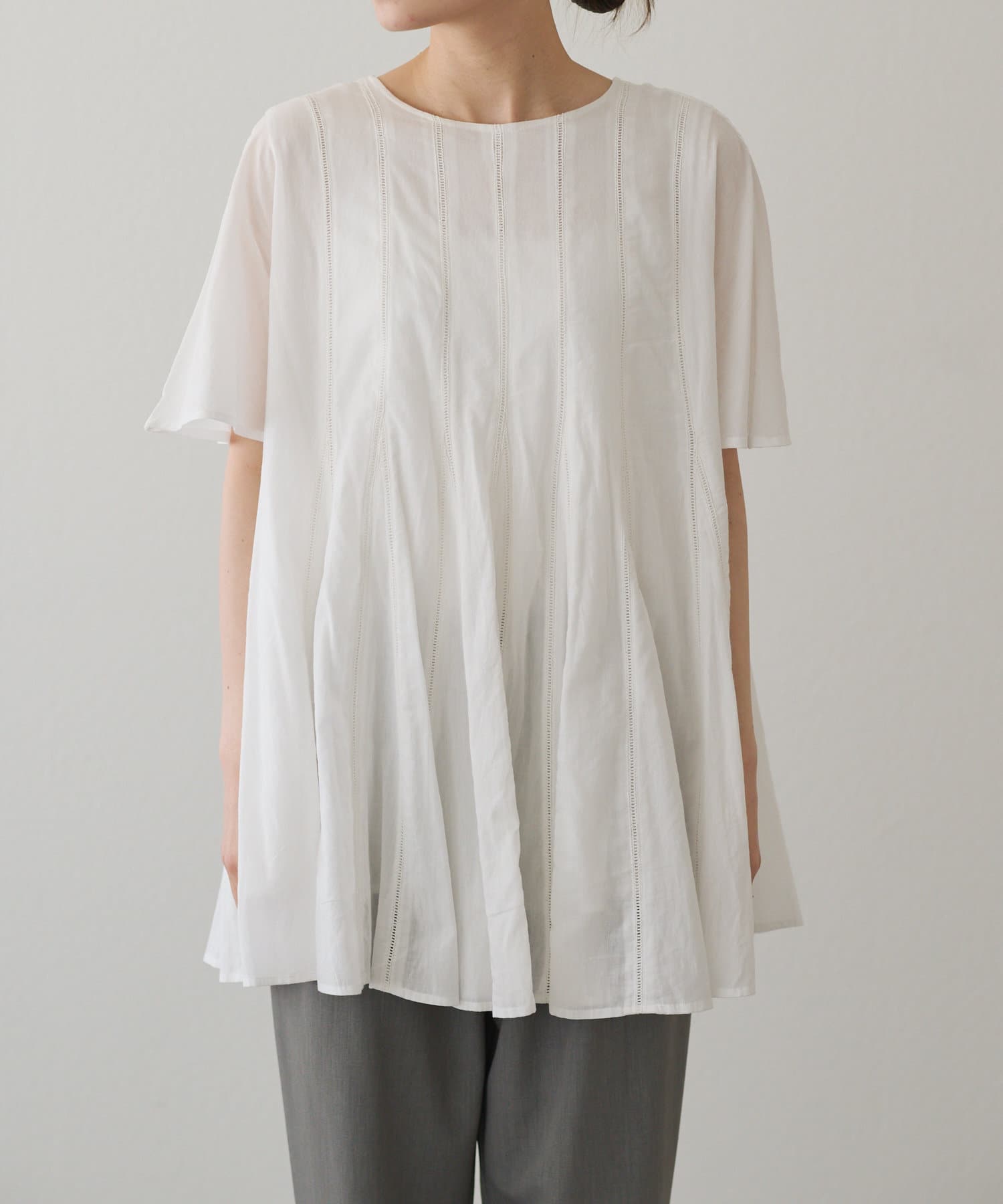 はしごレースを生地の切り替えに縦ラインで配置し、フレアなシルエットながら縦見え。