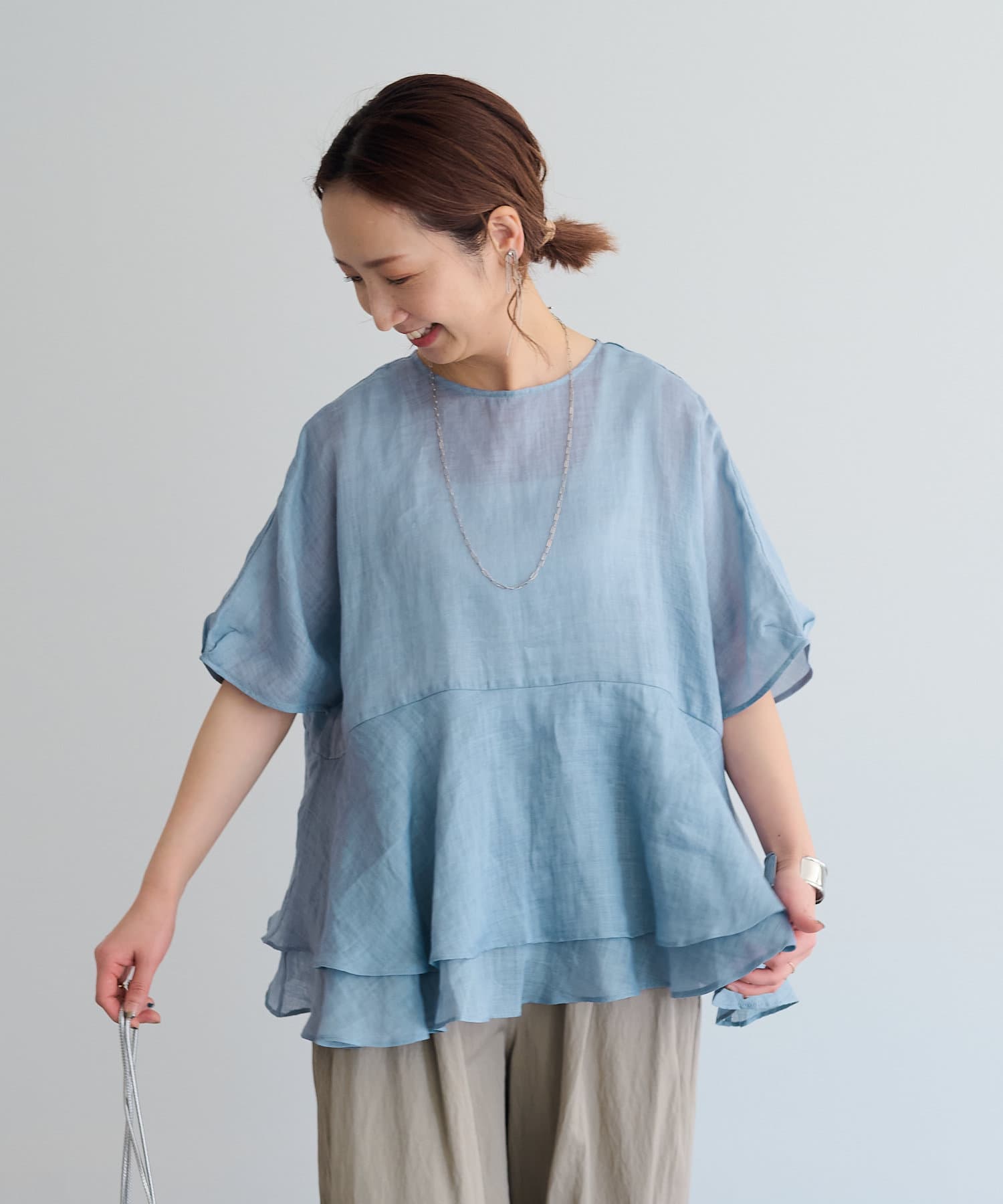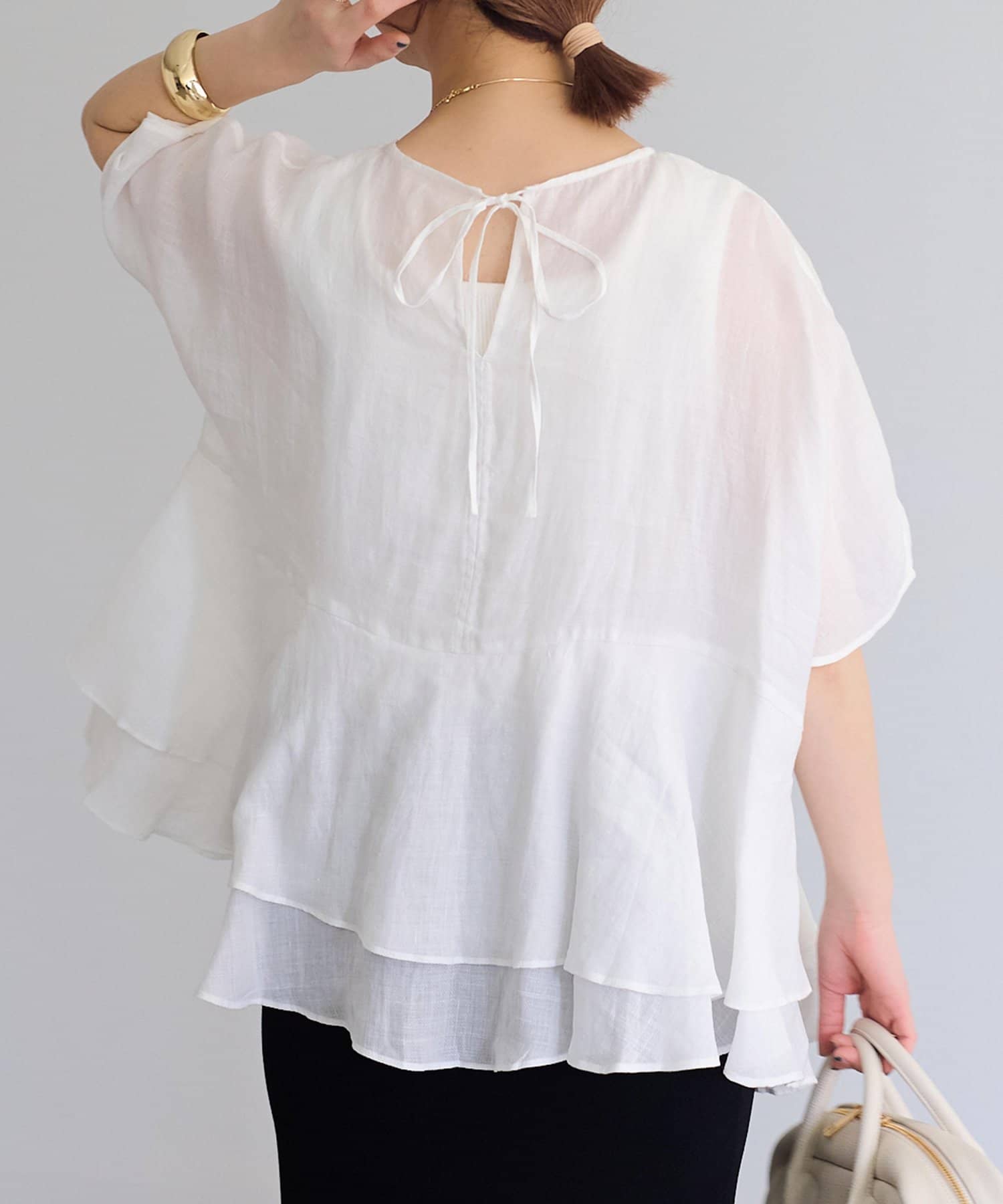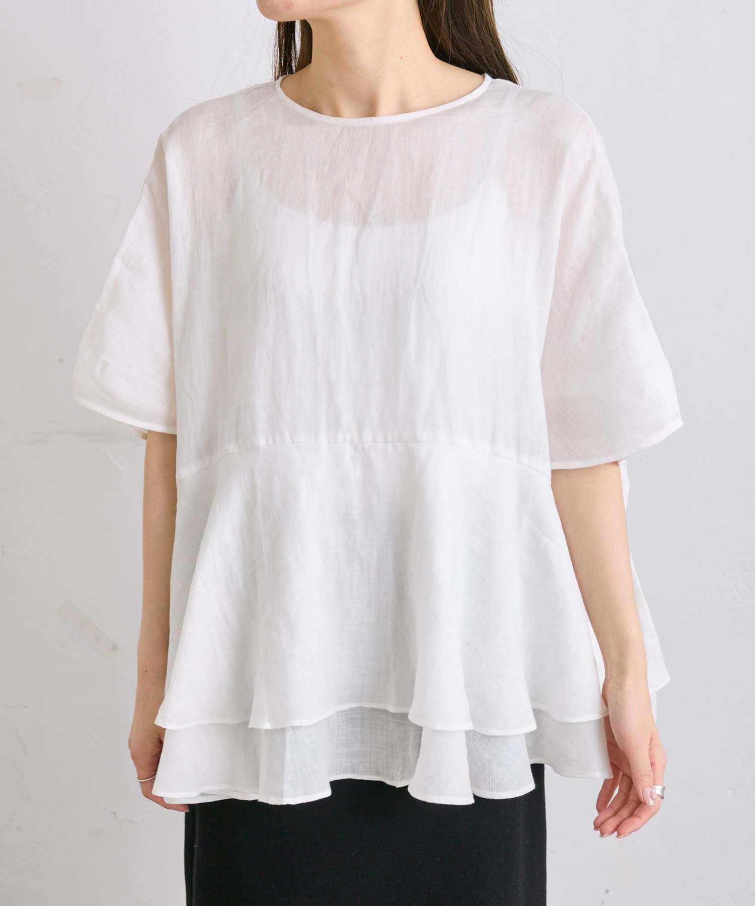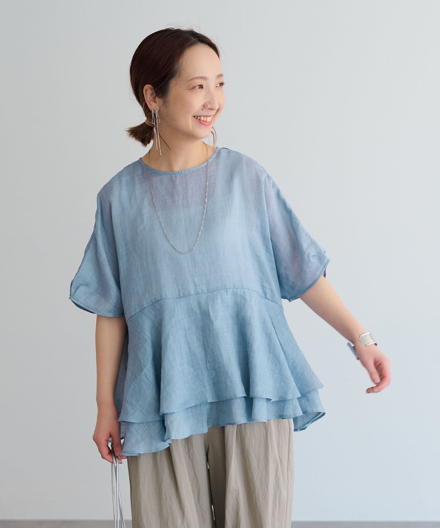 上品なシアー感と2段重ねのペプラムが軽やかな印象のブラウス。