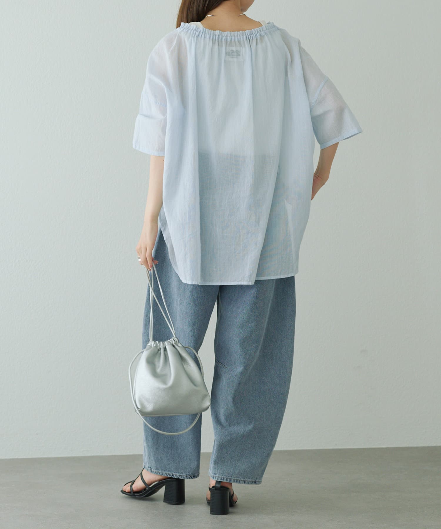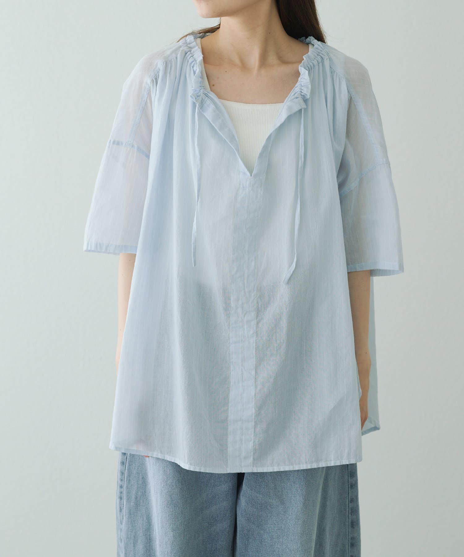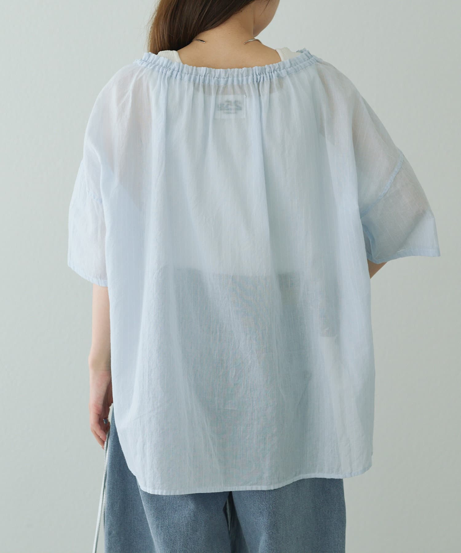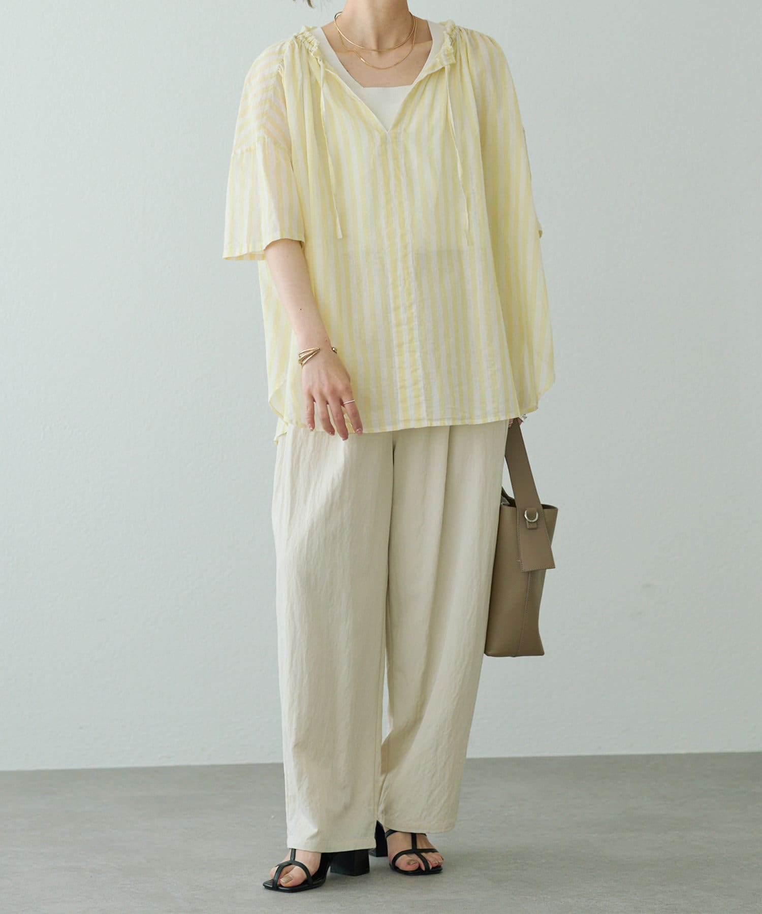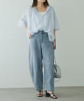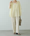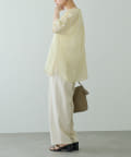 薄っすらと肌が透けるので、インナーにはハイゲージのニットタンクなどをきておくと安心です。