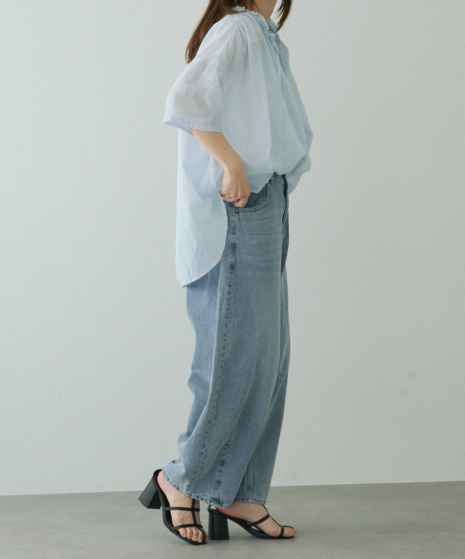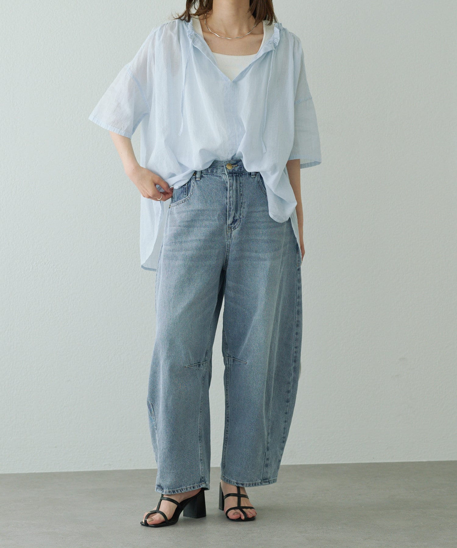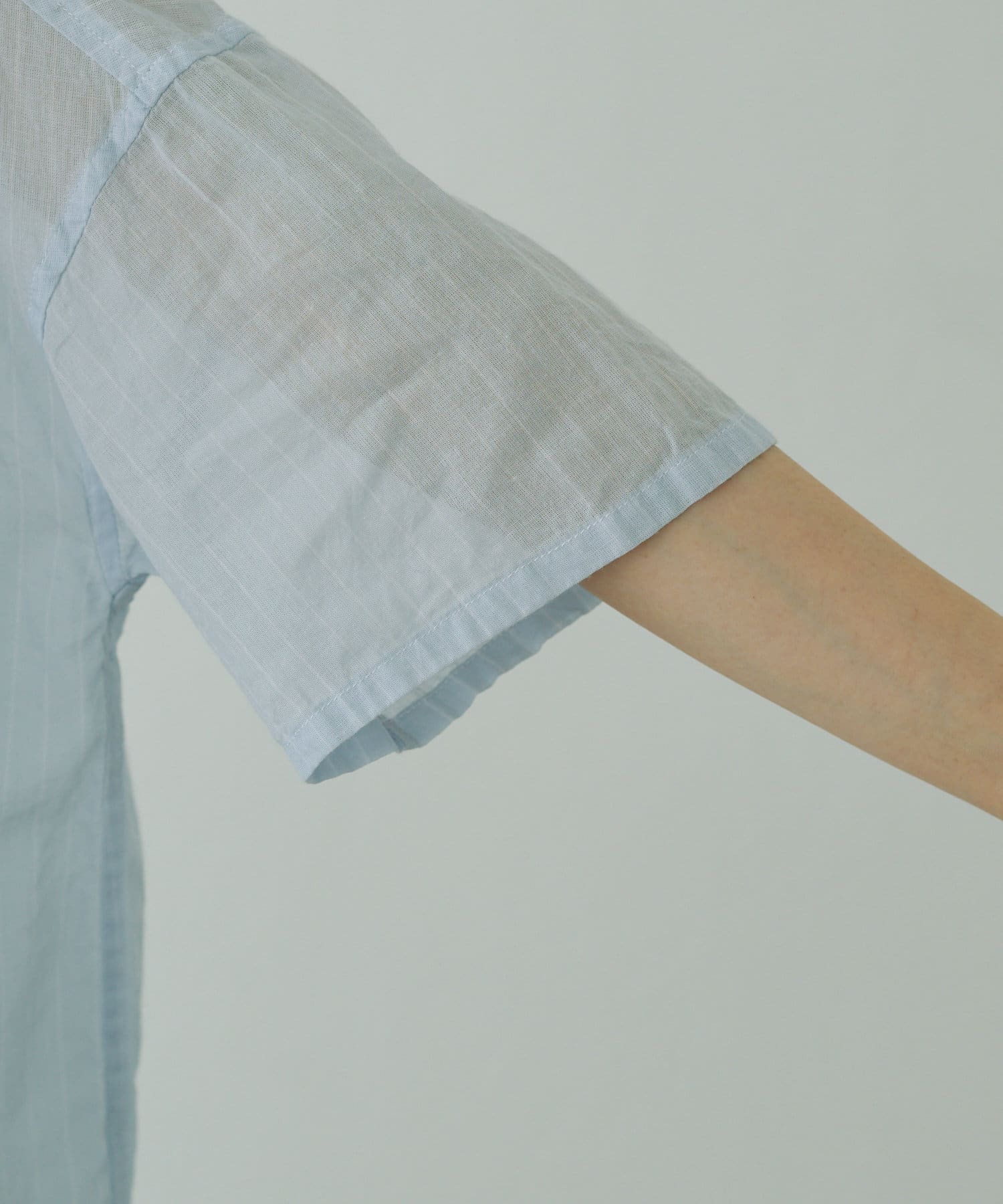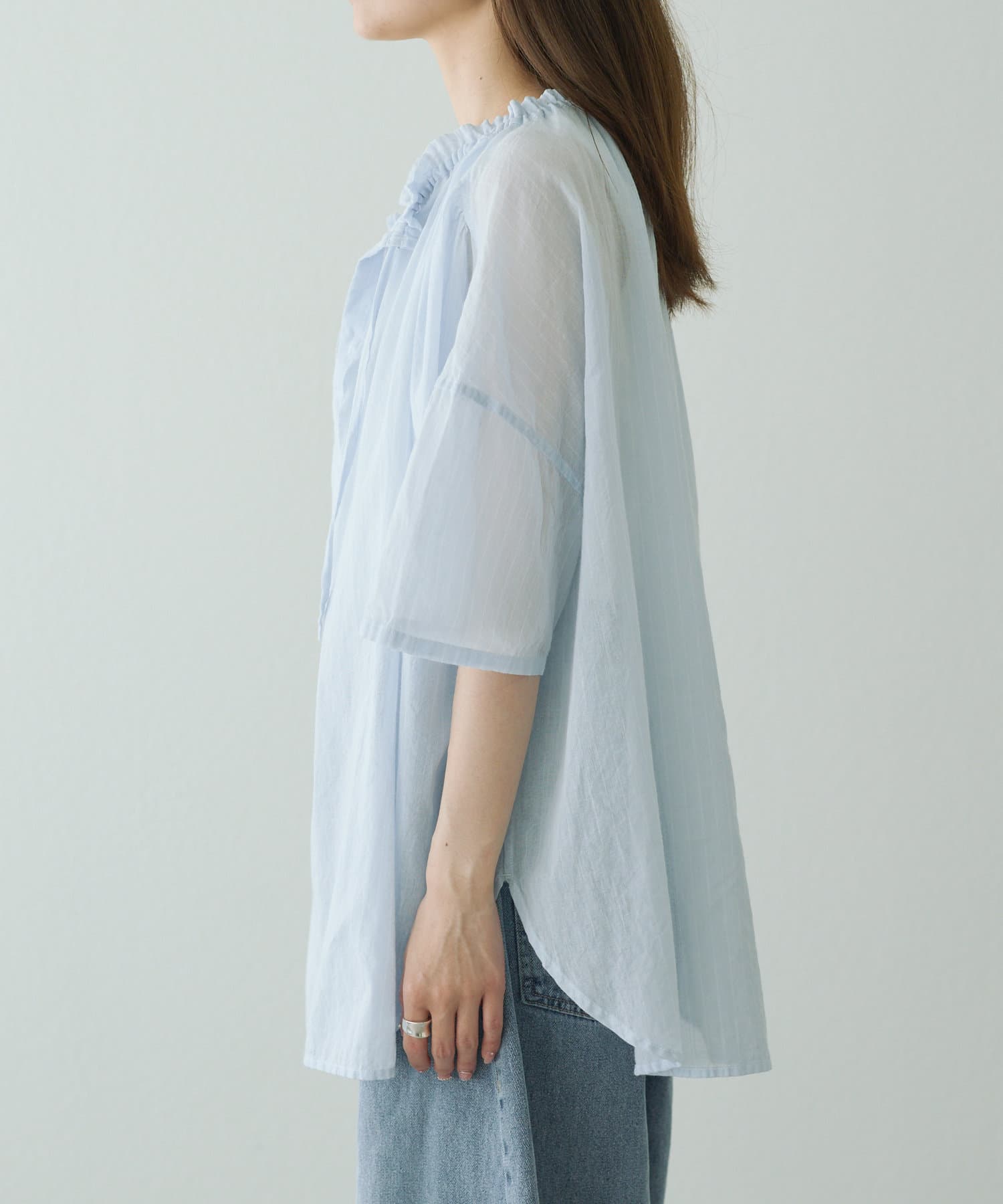 スキッパーのネックラインはノーカラーにすることで、すっきりと軽やかに仕上げました。