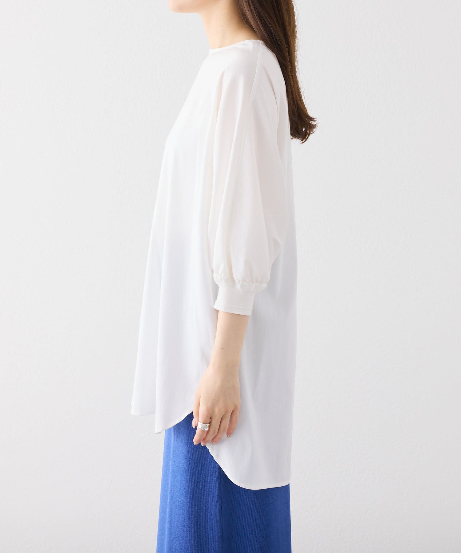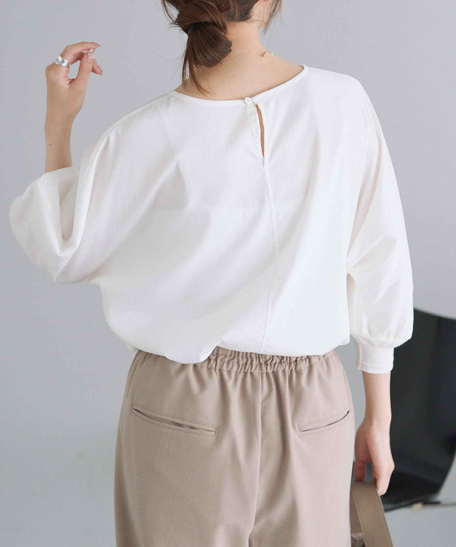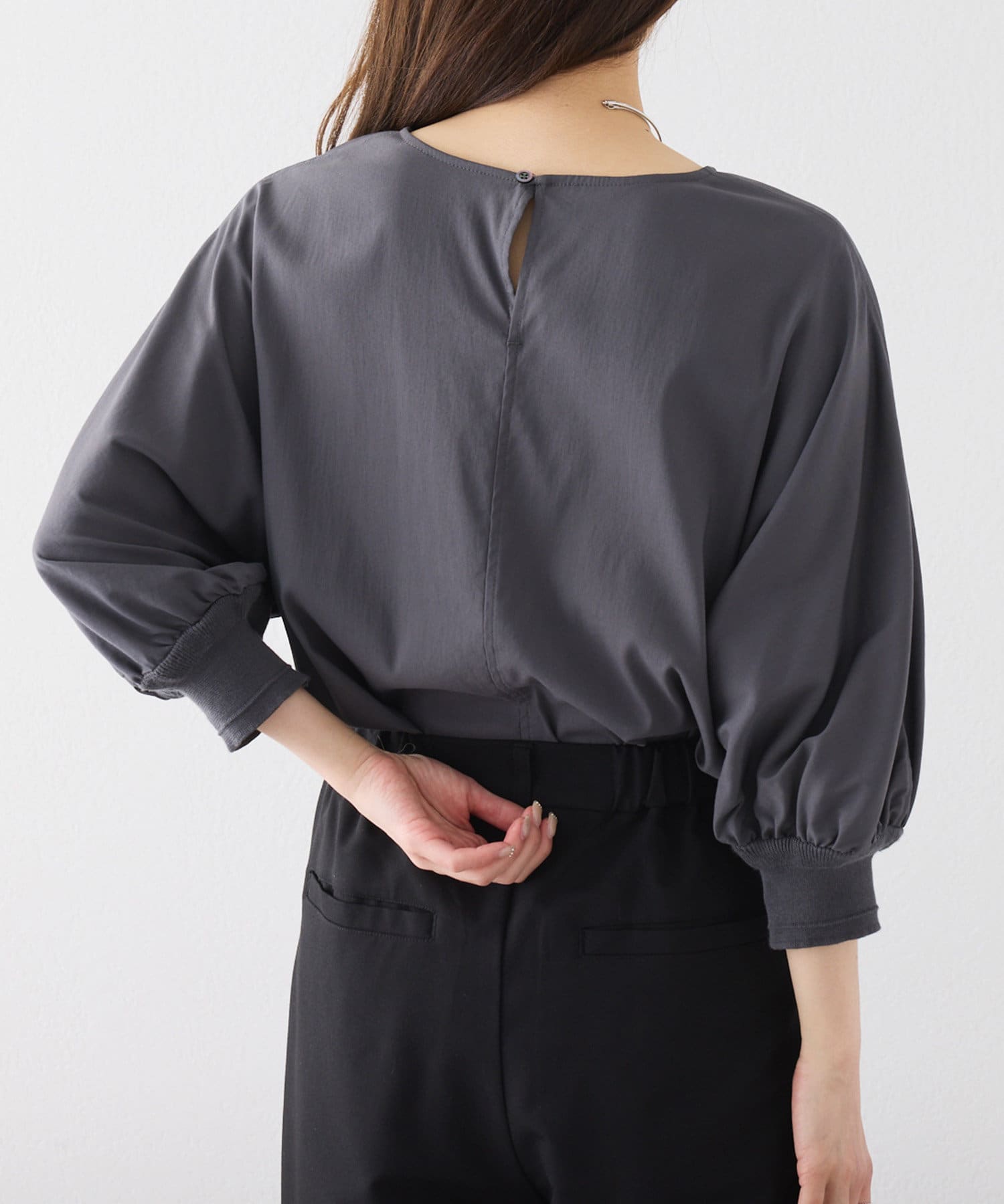 身体のラインを拾わないゆとりのある身幅や袖口に配したリブ、