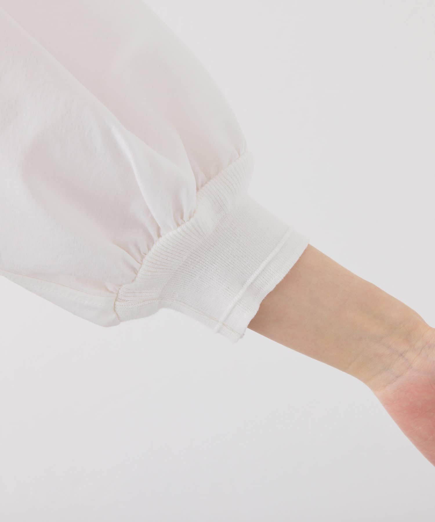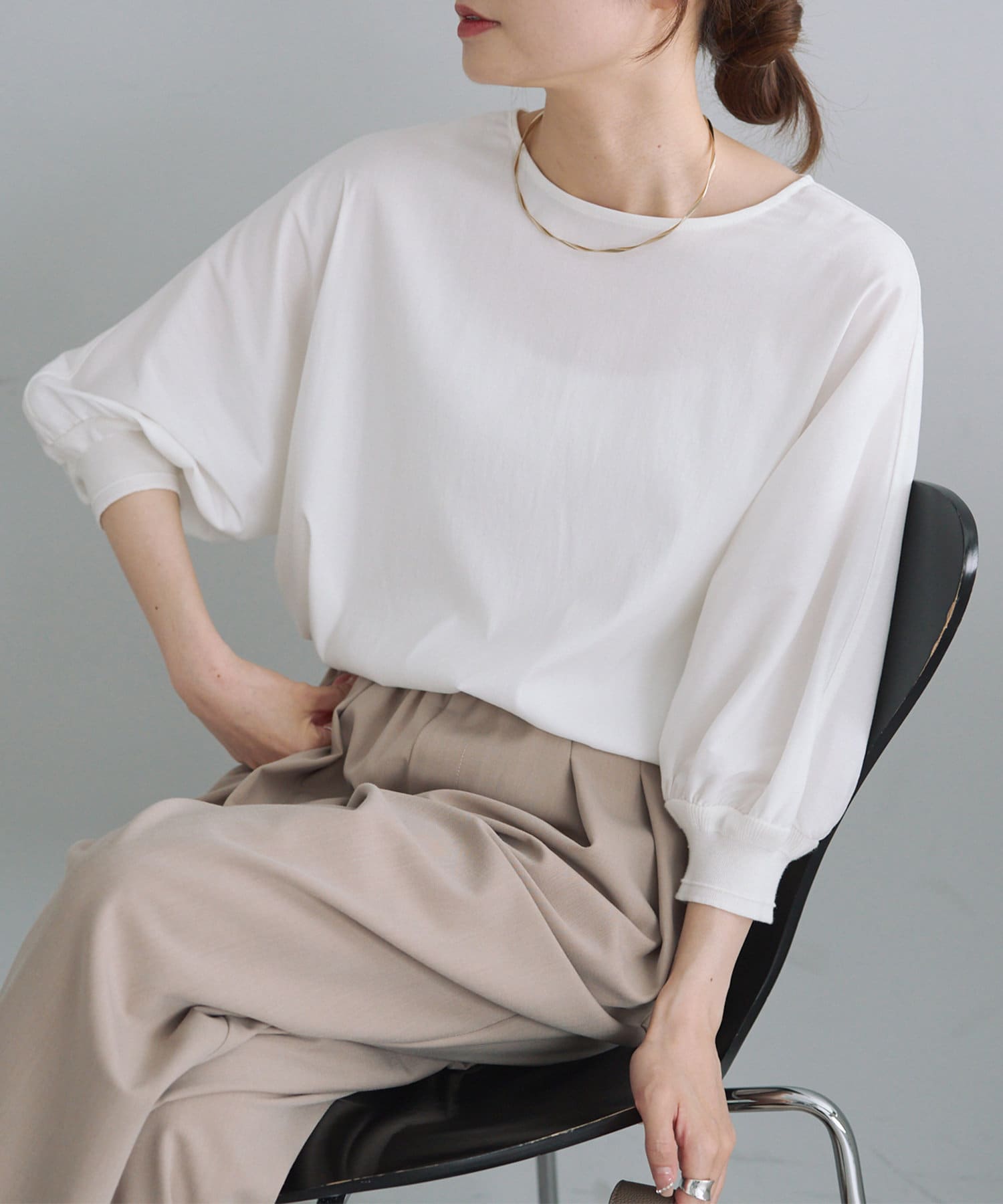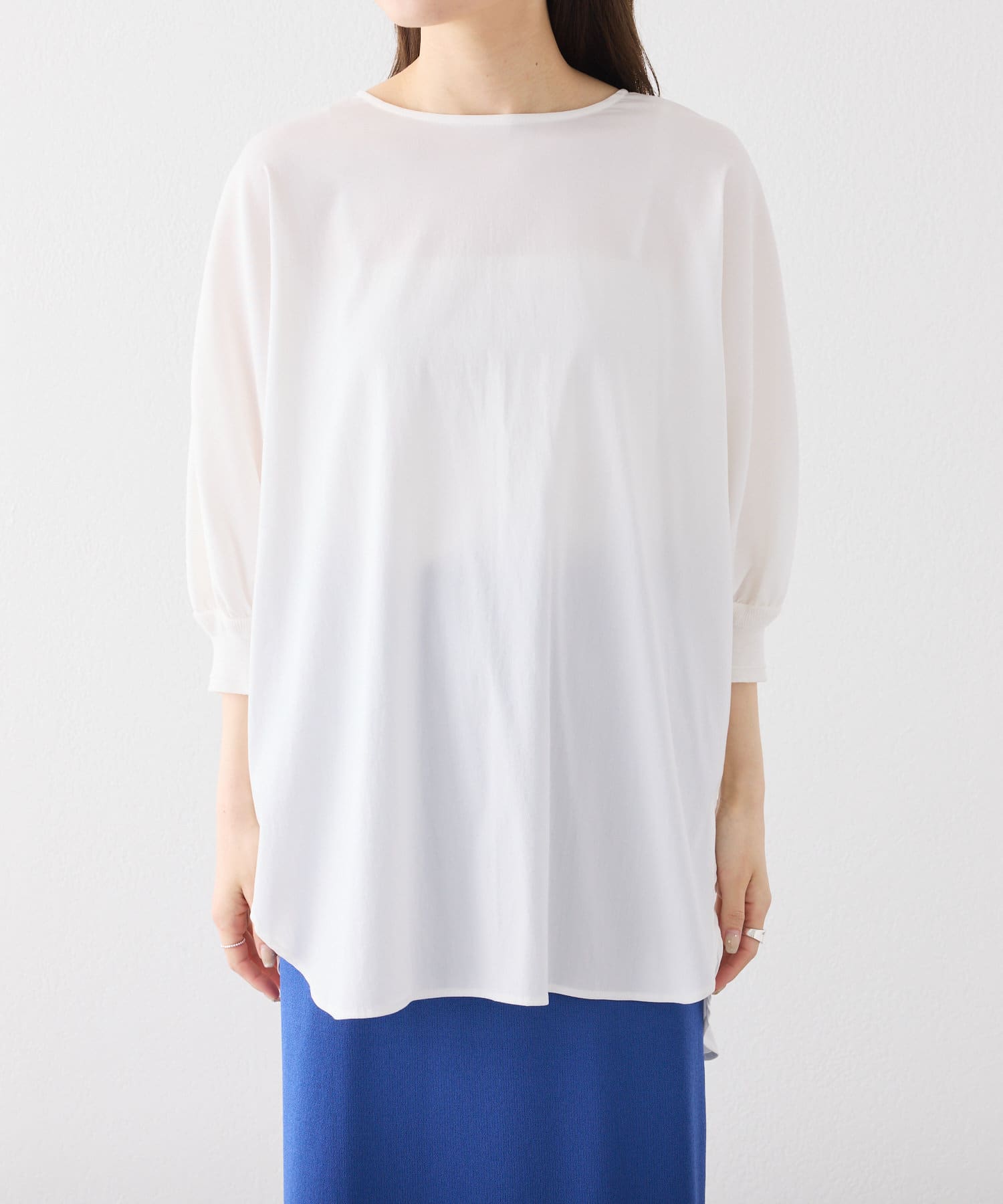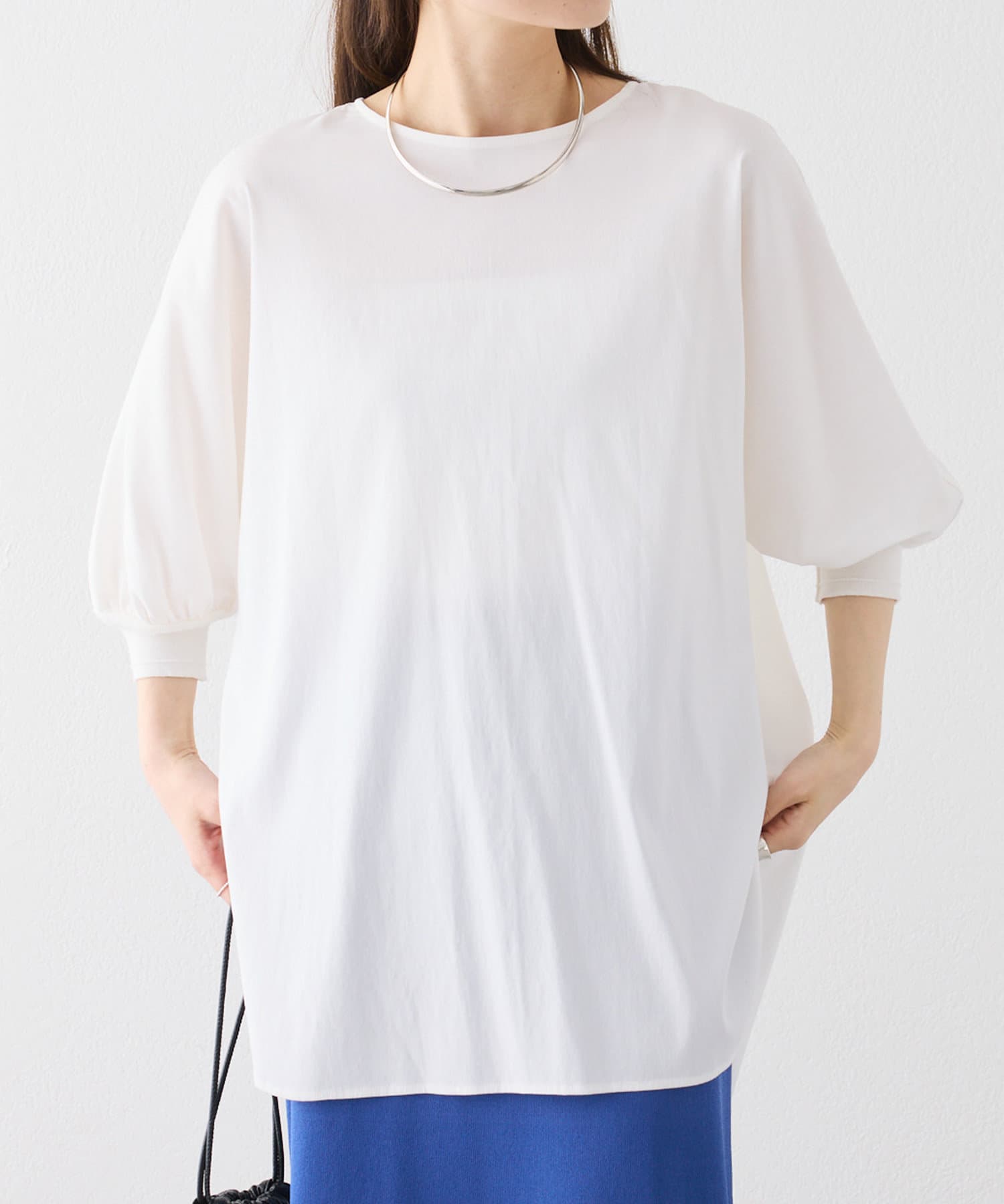 身体のラインを拾わないゆとりのある身幅や袖口に配したリブ、