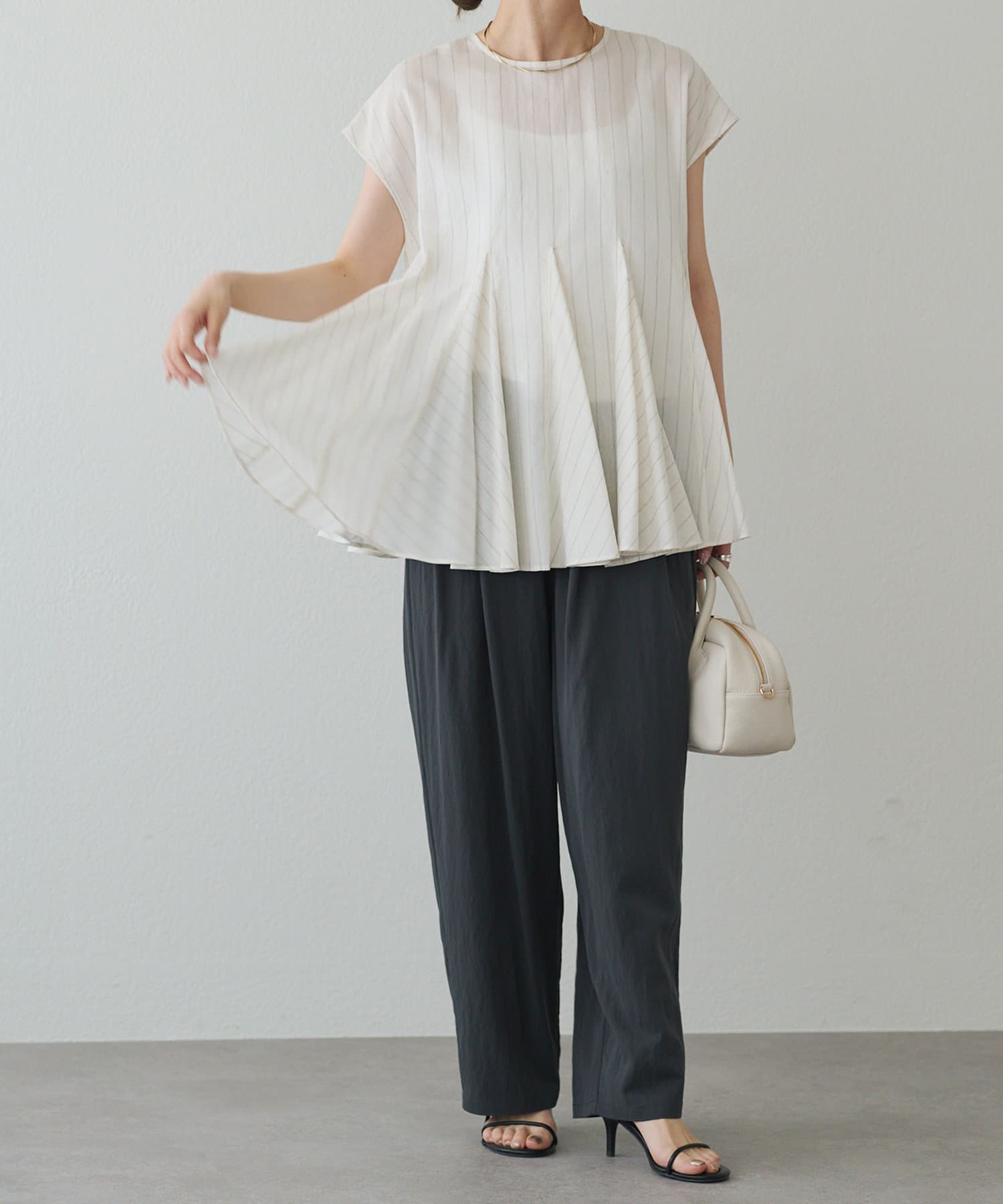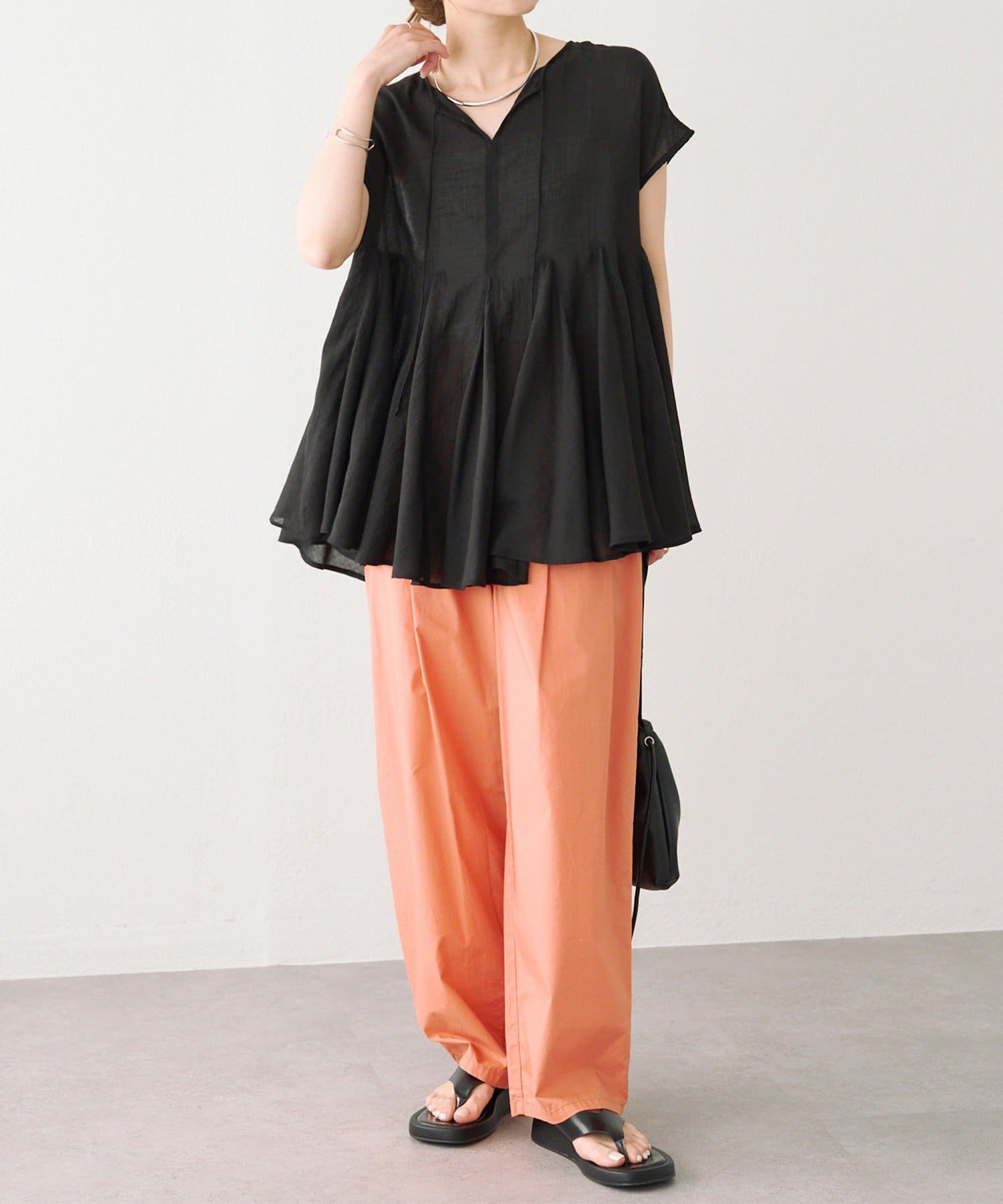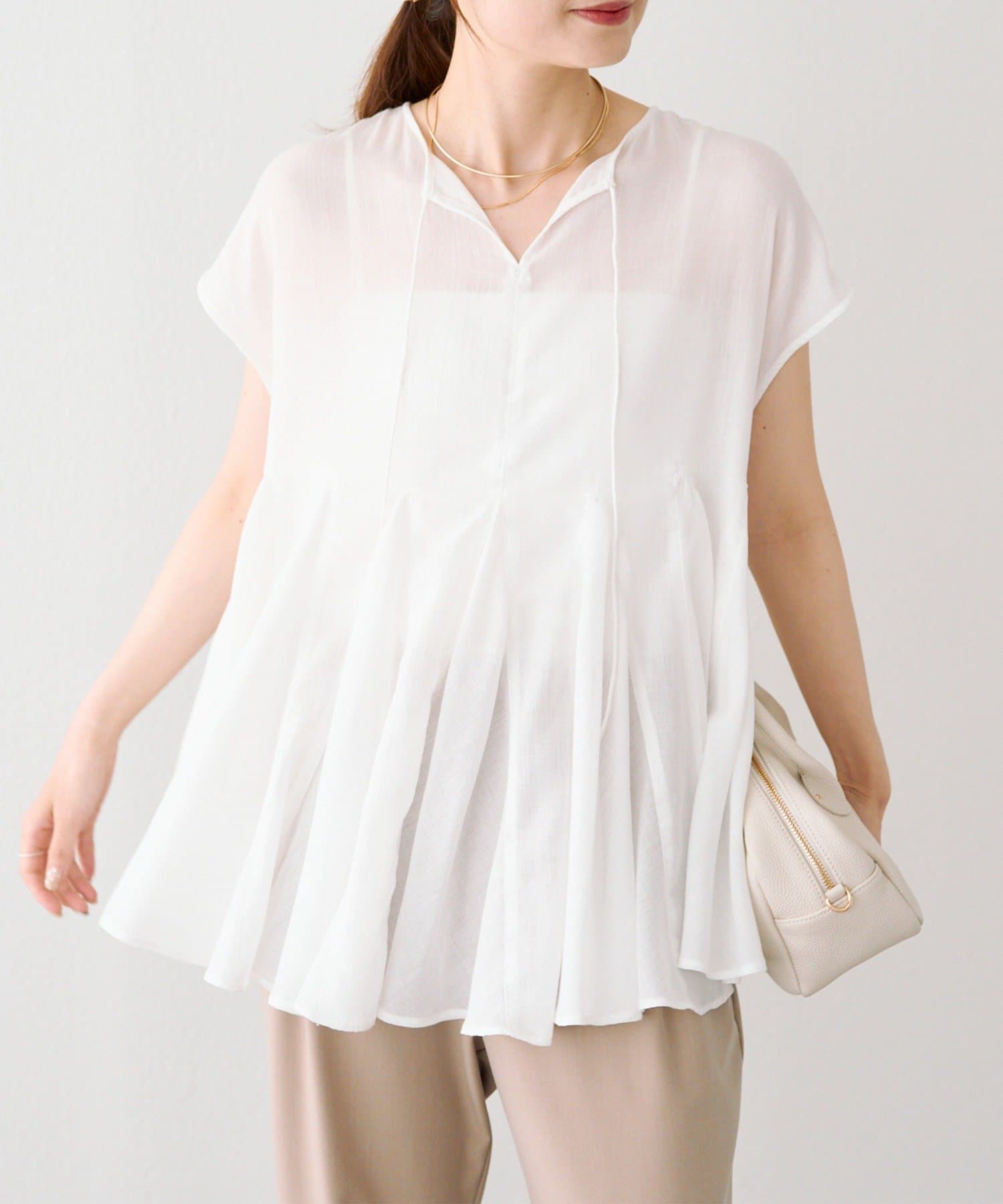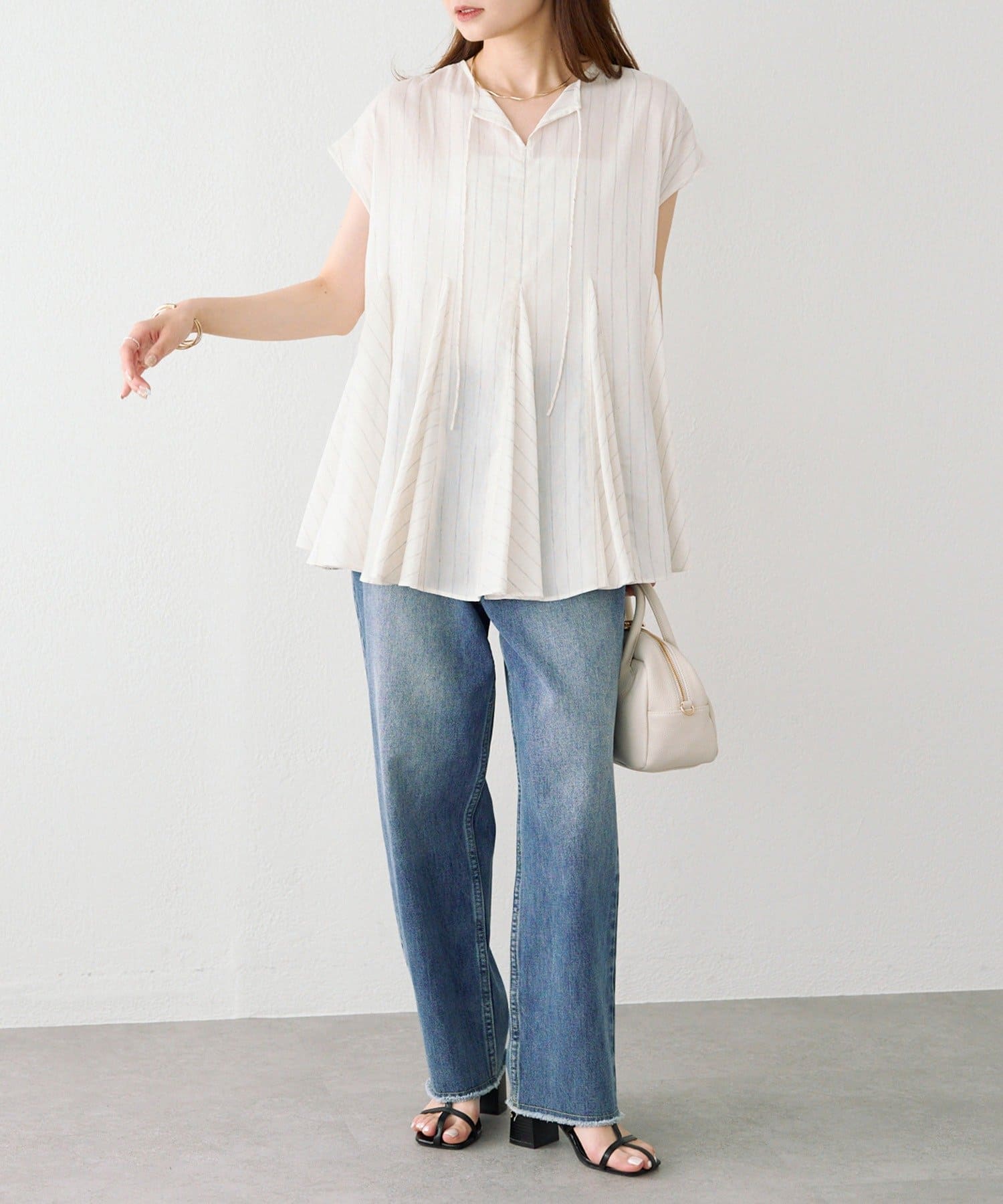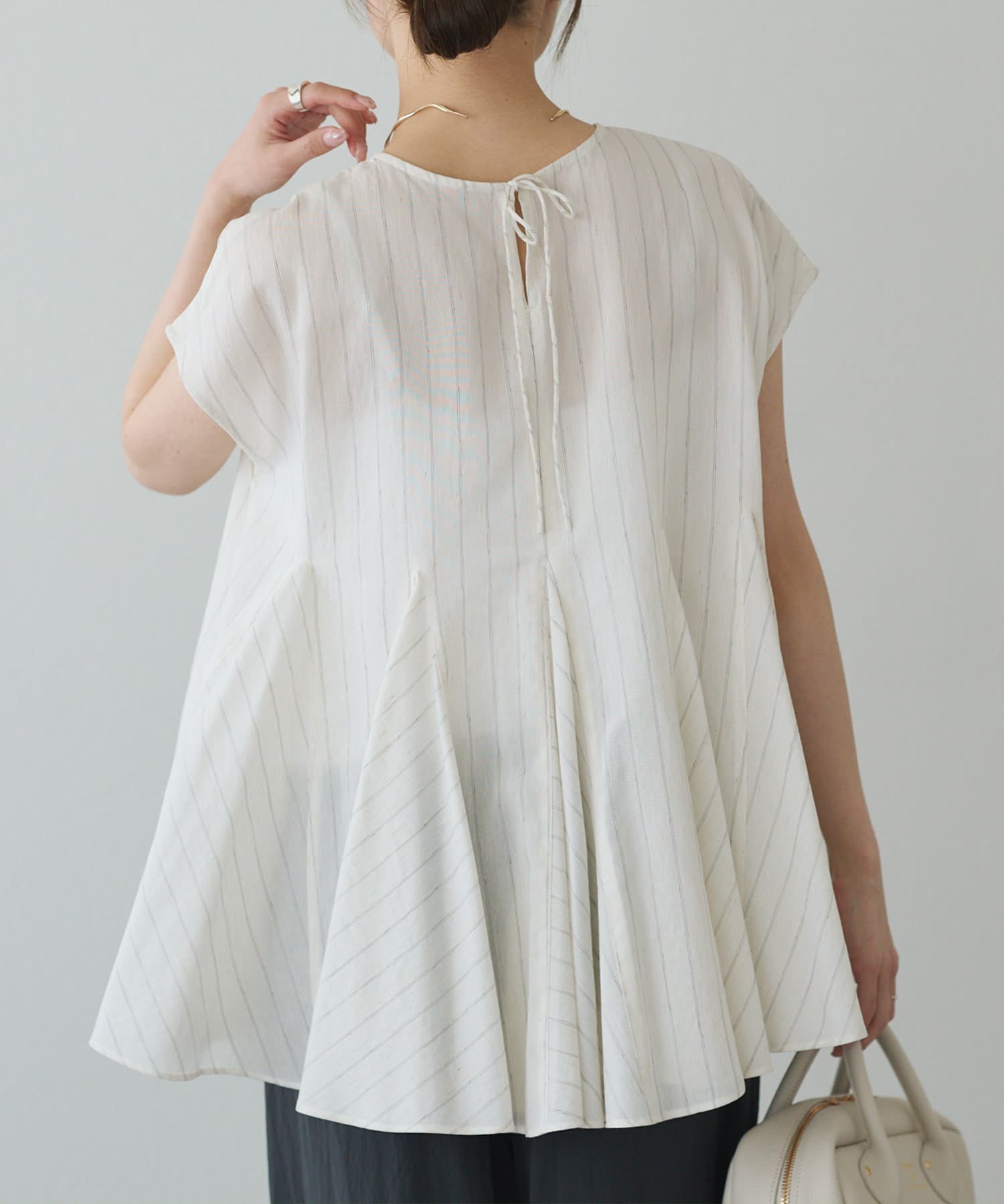 肩や二の腕をカバーしてくれるゆとりあるフレンチスリーブで、盛夏にも涼やかに着用いただけます。