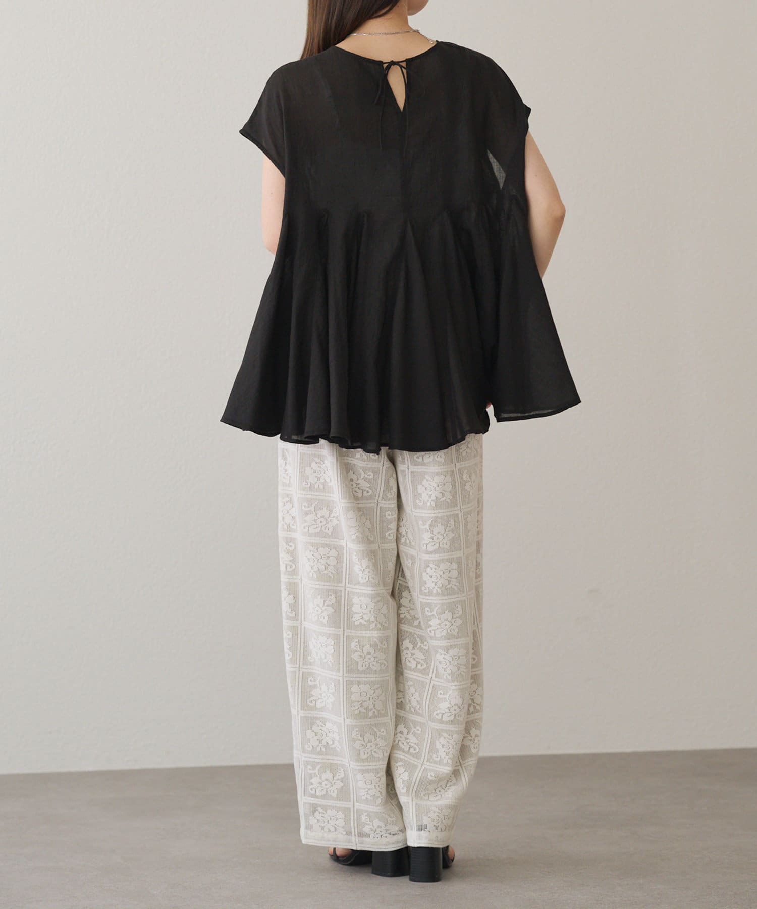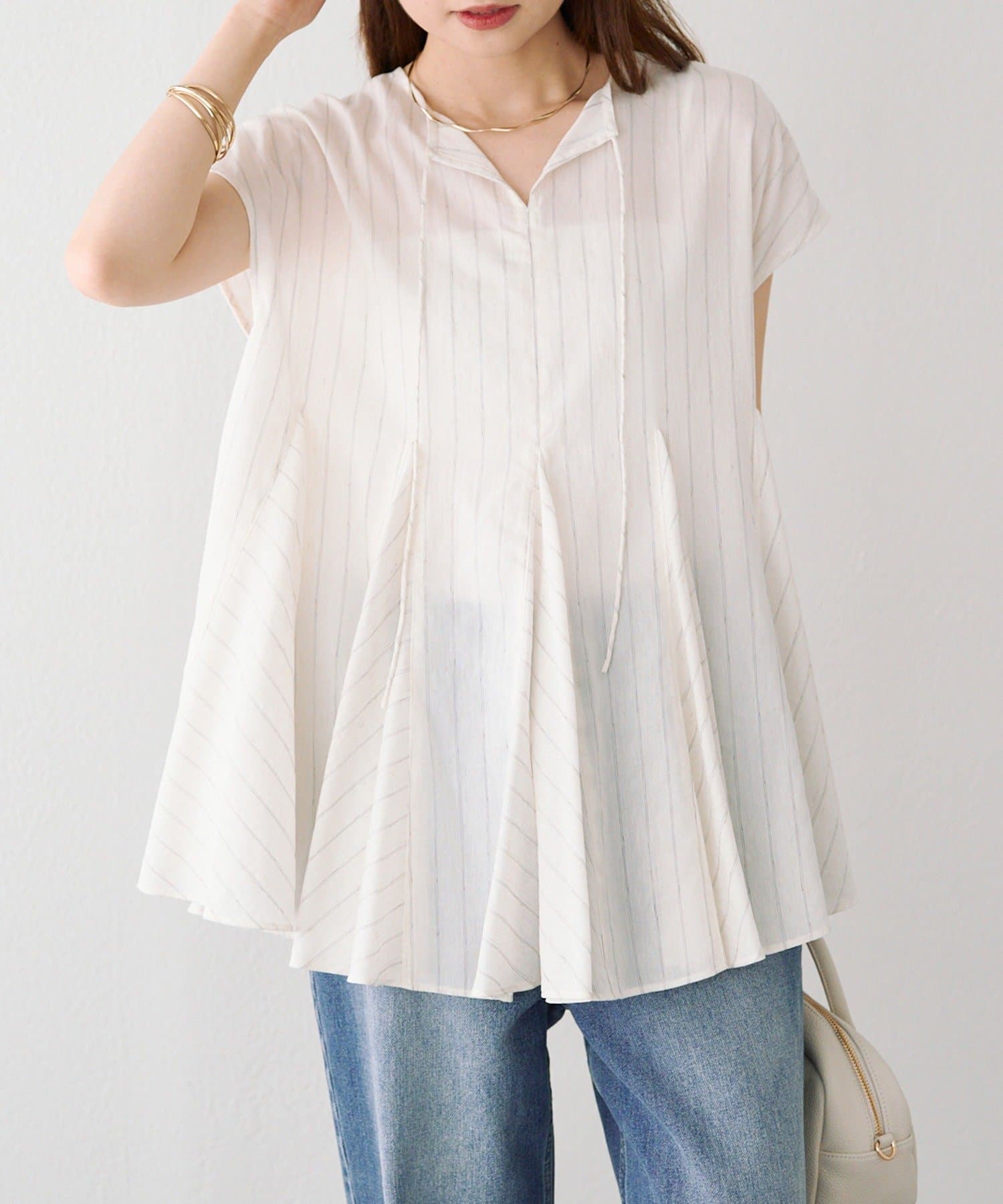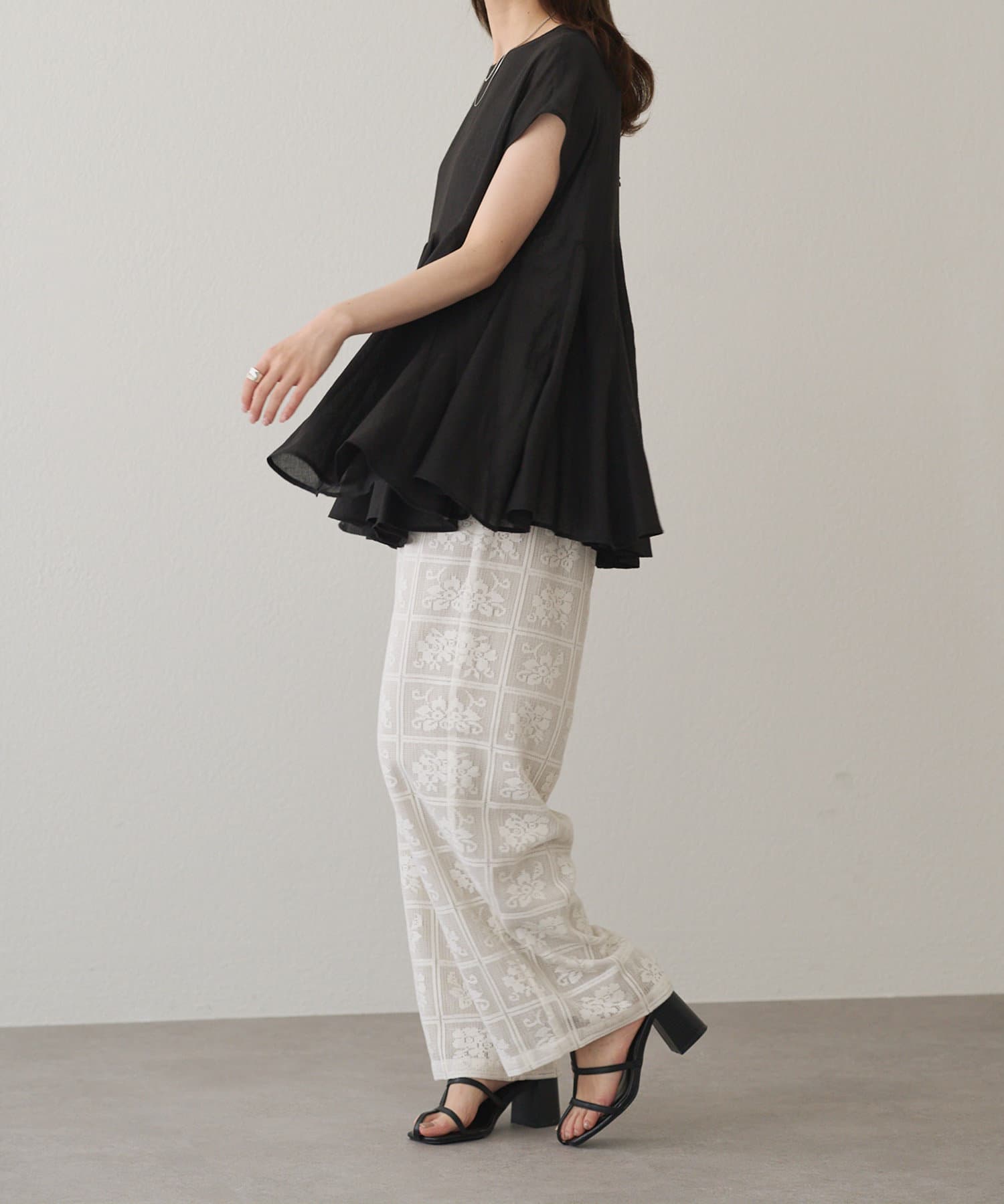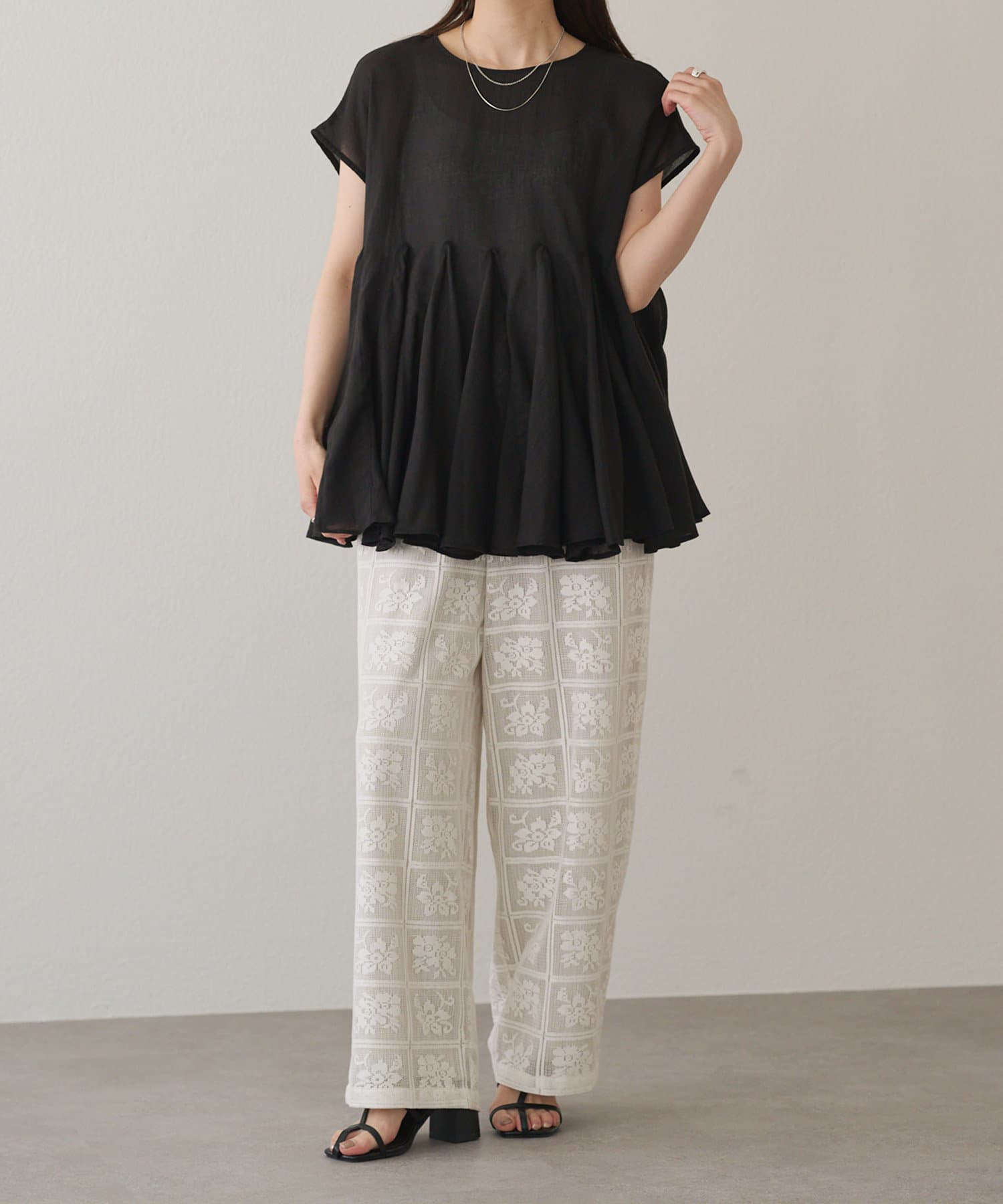 肩や二の腕をカバーしてくれるゆとりあるフレンチスリーブで、盛夏にも涼やかに着用いただけます。
