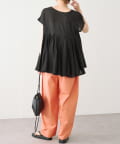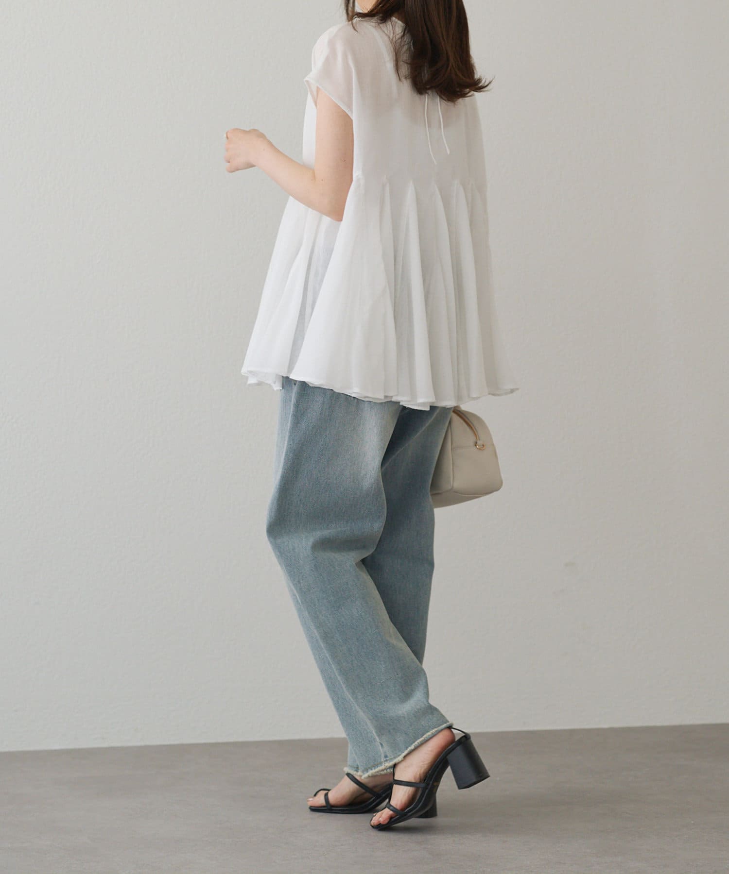 ウエストよりやや高めの位置での切り替えとボリューム感のある裾がお尻をすっぽり覆う着丈になり、