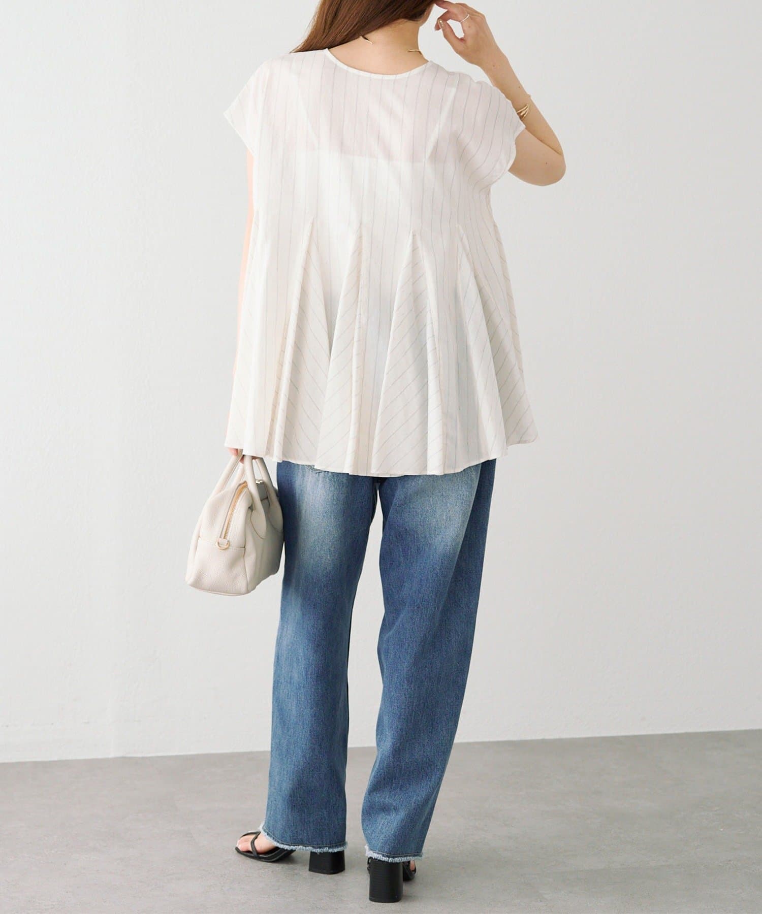 着用感:着丈は太ももに少しかかるくらい。フレンチスリーブの袖口は窮屈感のない丁度良い広さで風通し良く、夏にも涼やかに着れそうでした。
