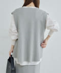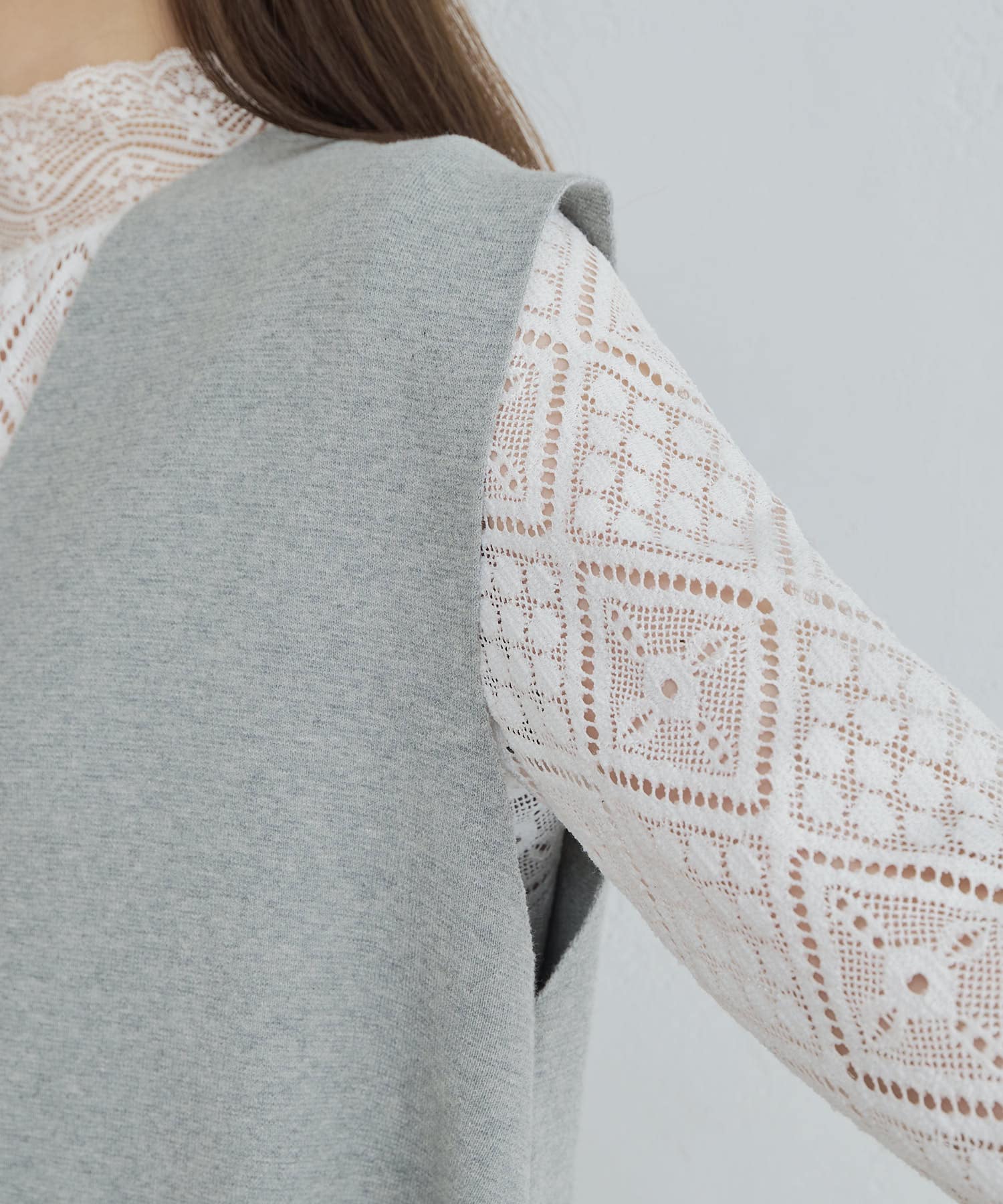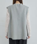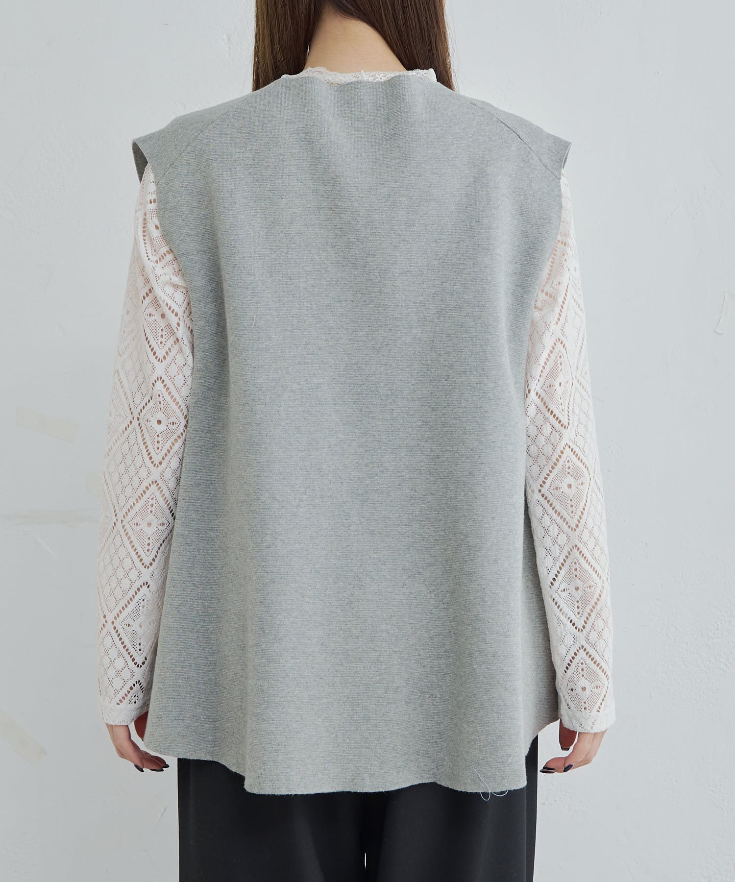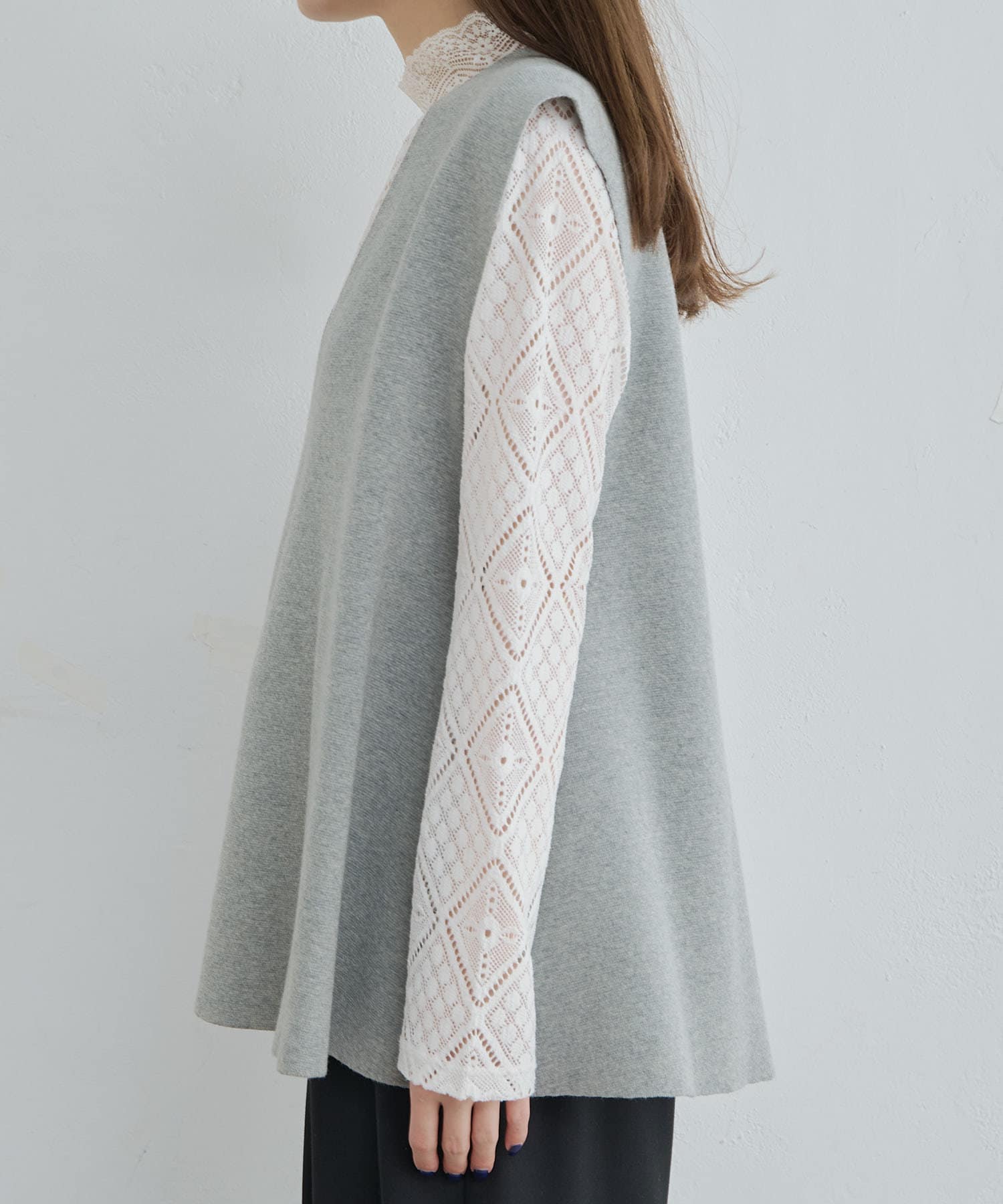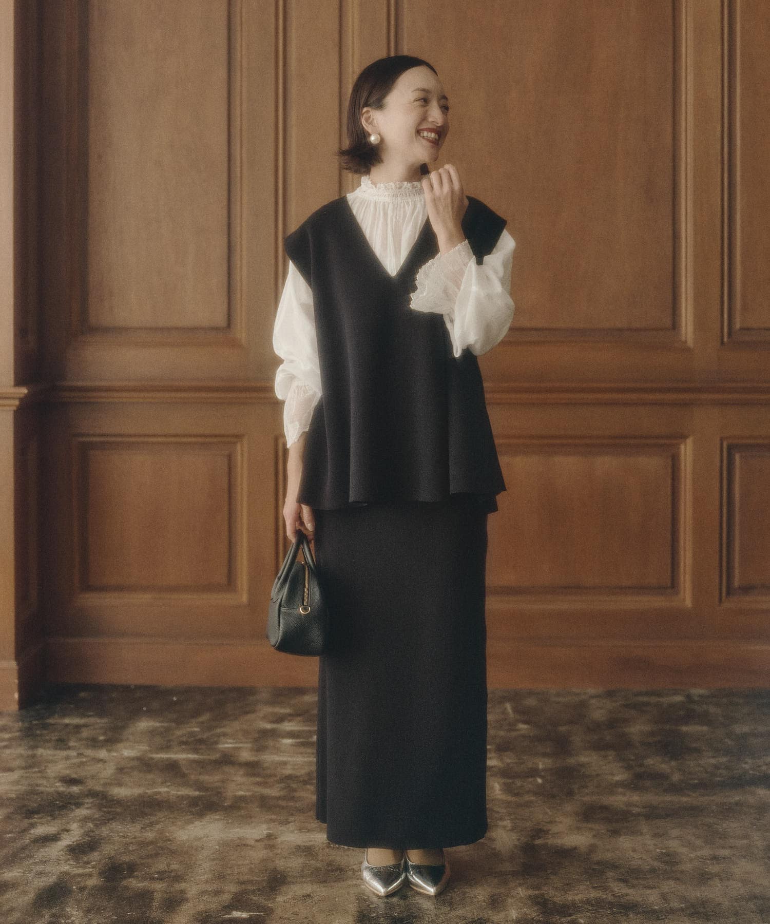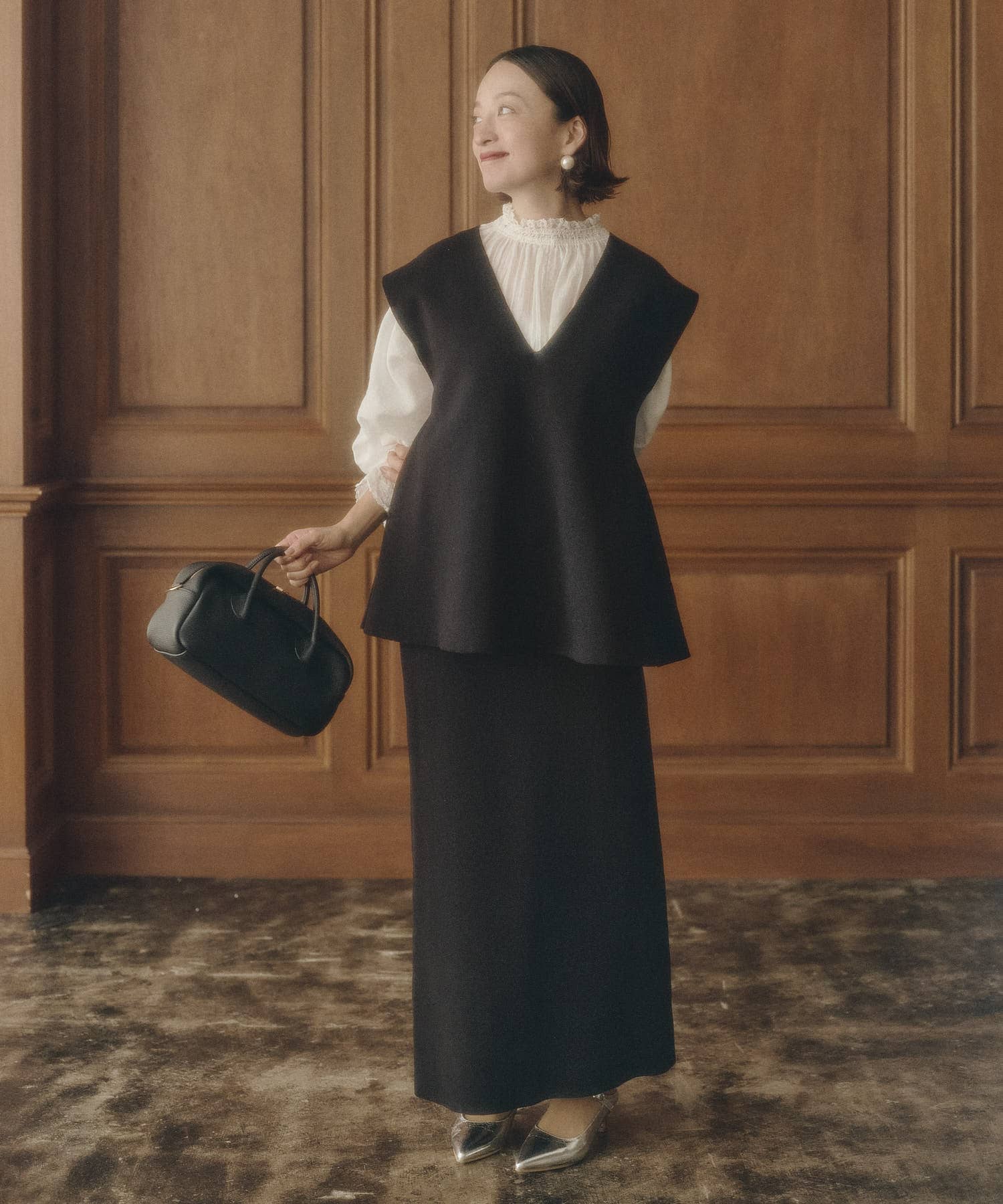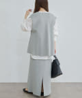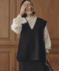 やや肩を覆うフレンチスリーブに、ミドル丈のVネックベストは