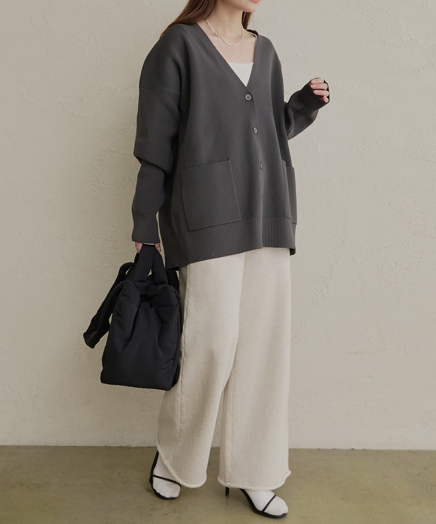 編み地にハリ感があり、フォルムがしっかりキープされるため着映えする主役級カーディガン。