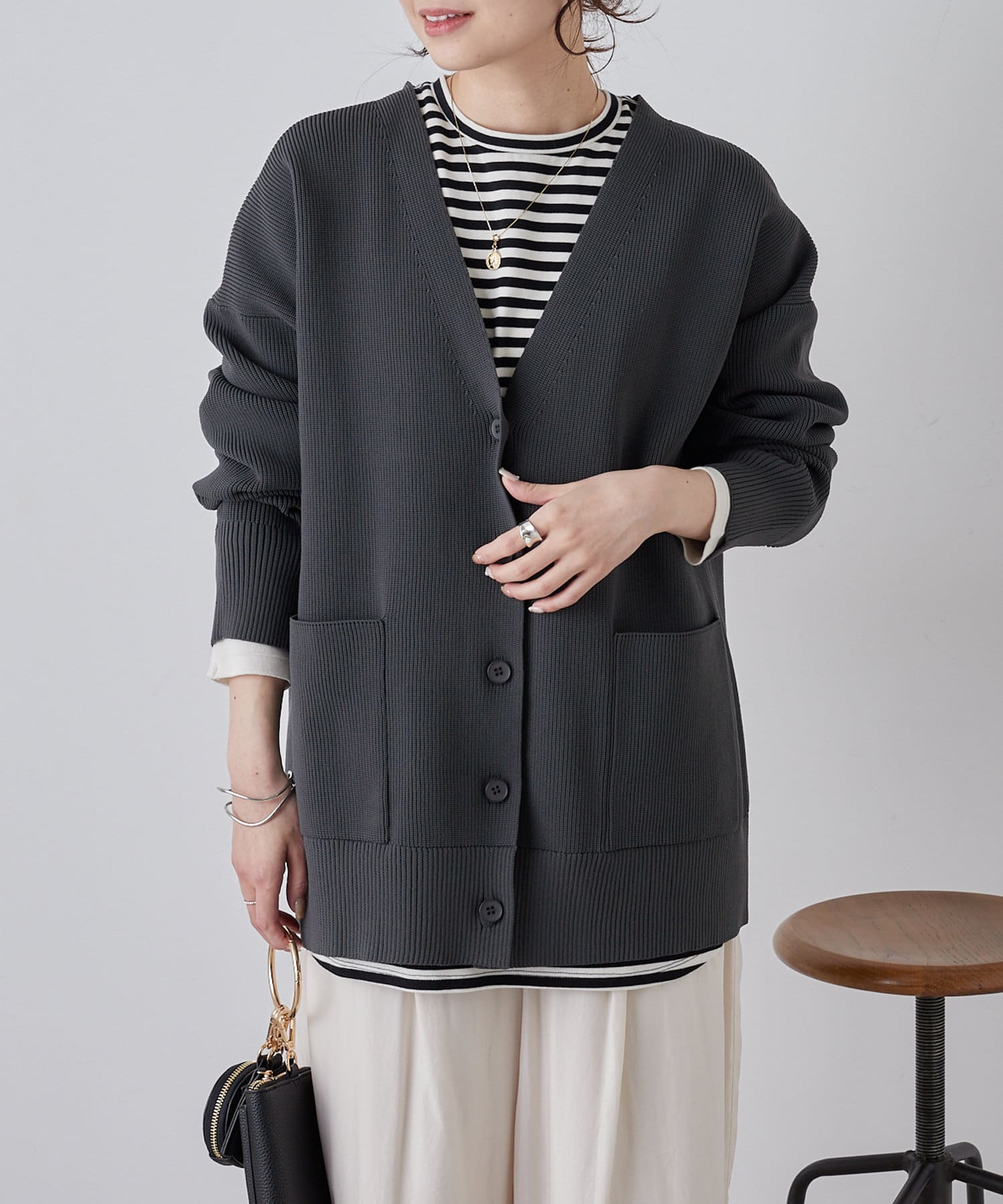 編み地にハリ感があり、フォルムがしっかりキープされるため着映えする主役級カーディガン。