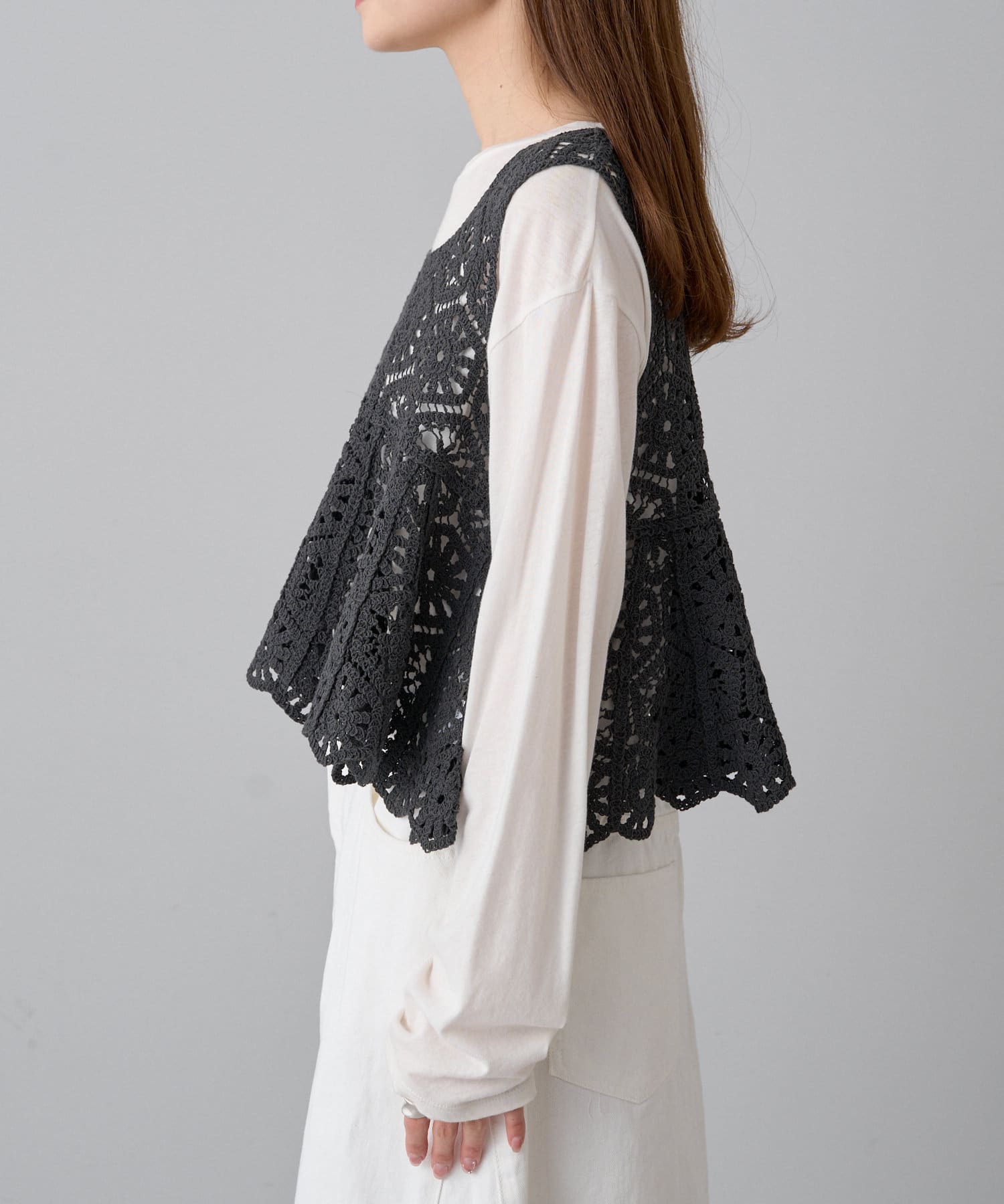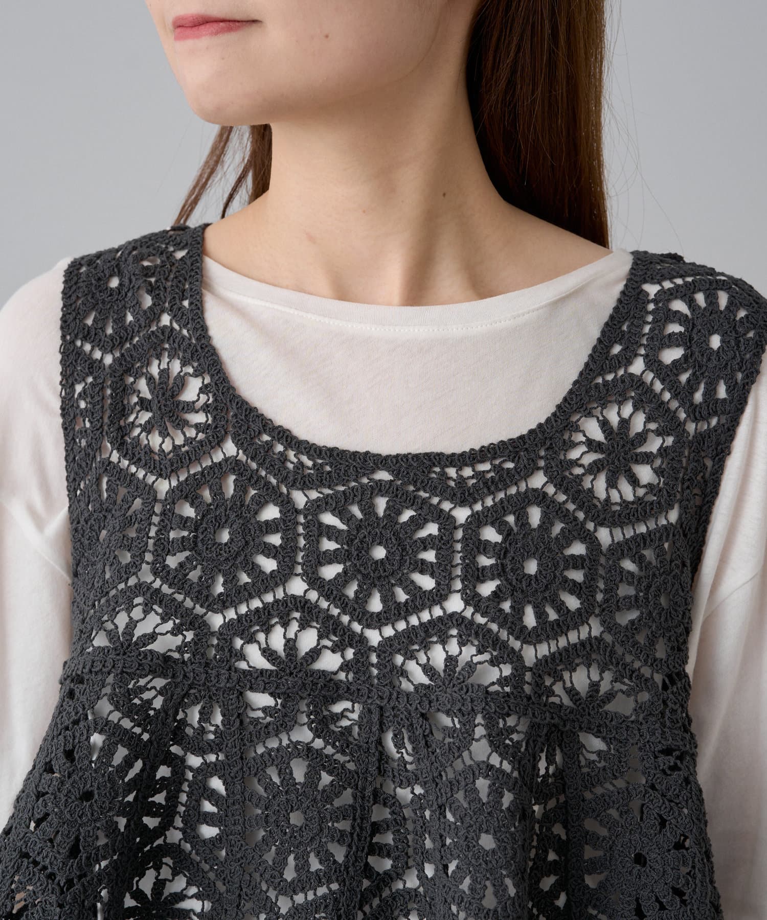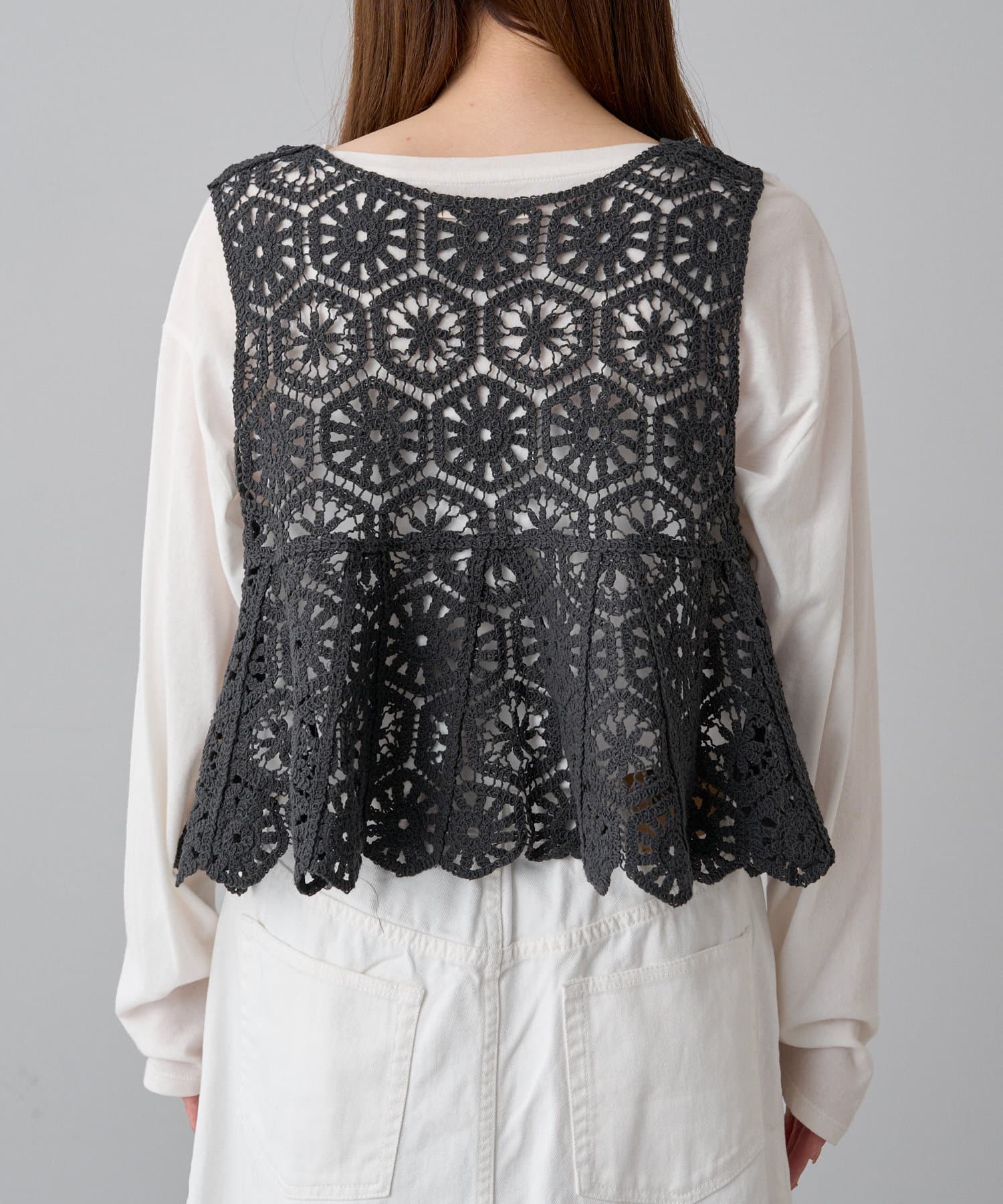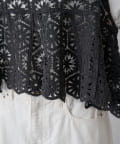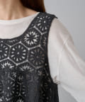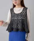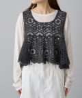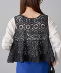 フレアな形で、柔らかい印象のかぎ針を使ったレース編み風ビスチェ。
