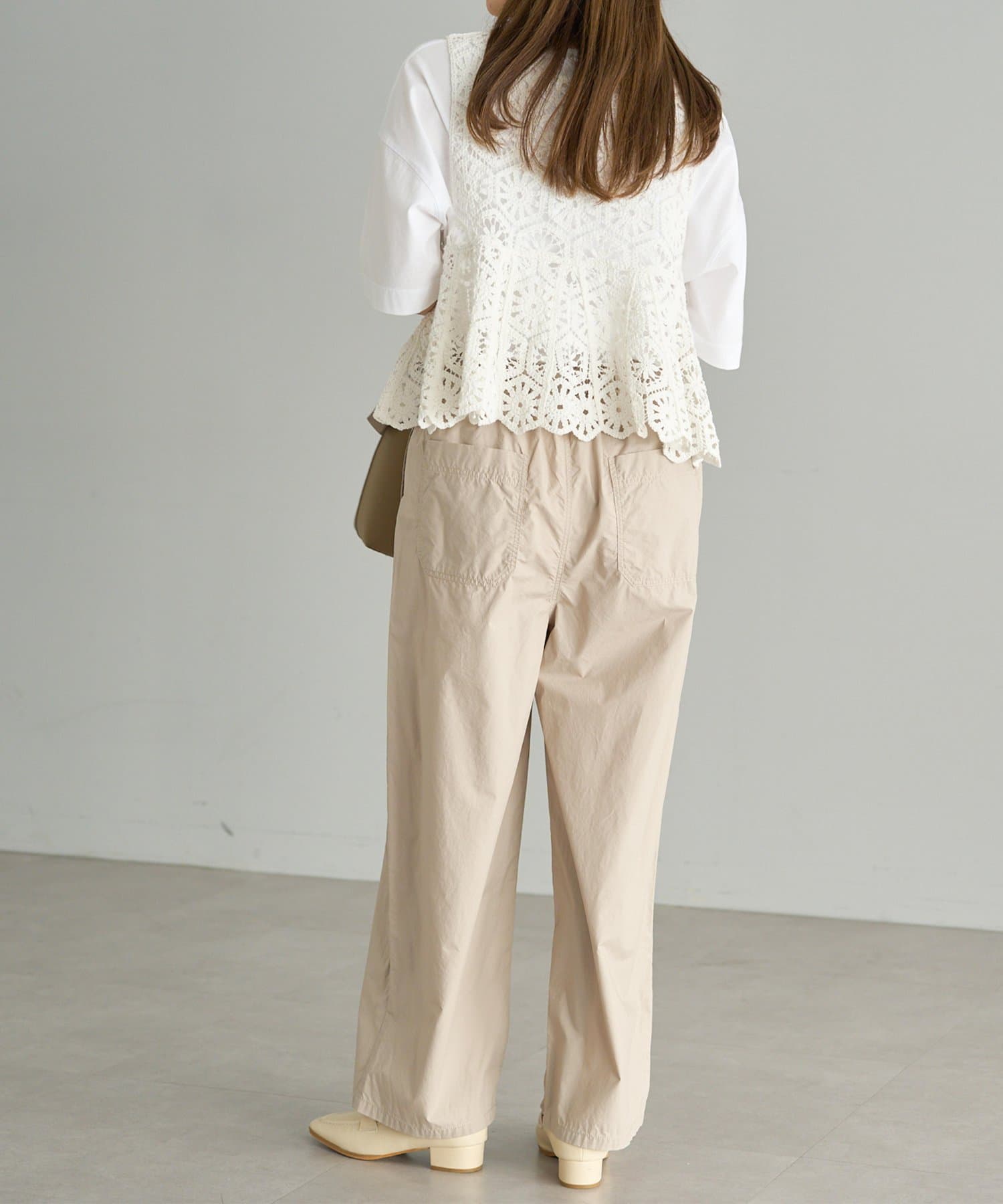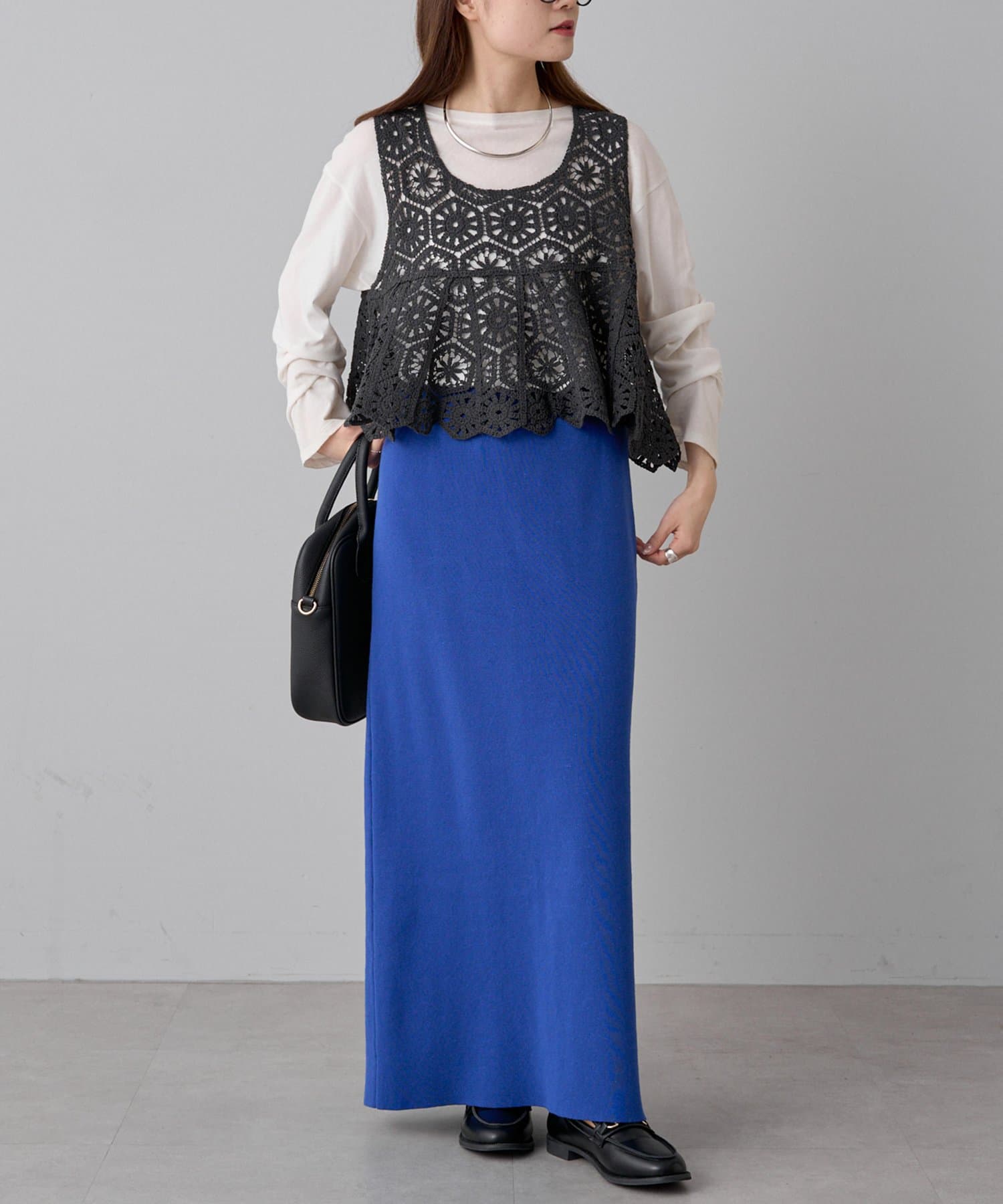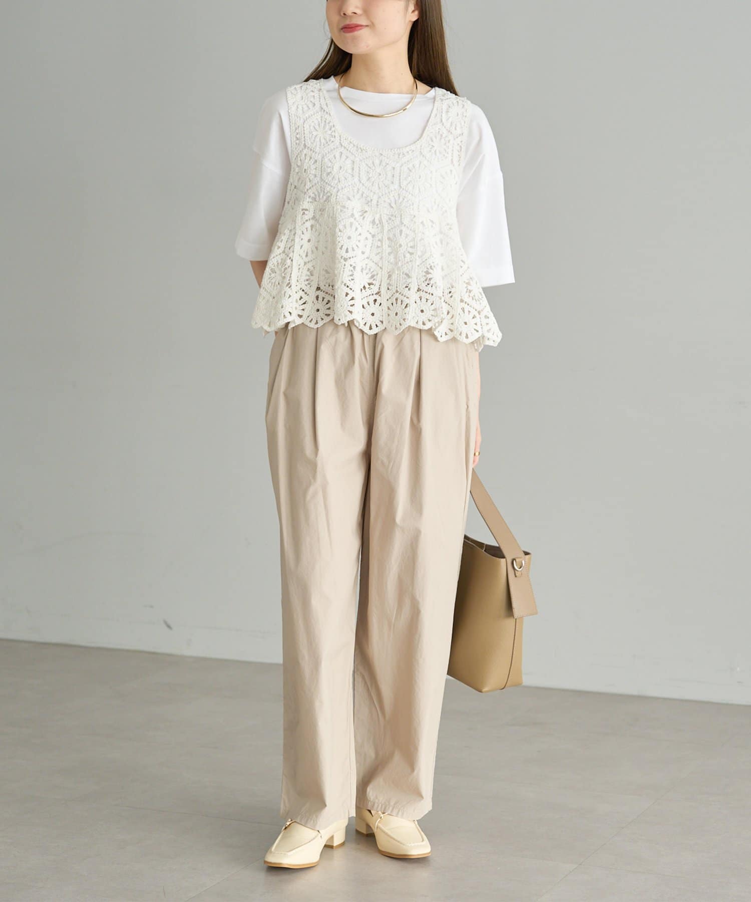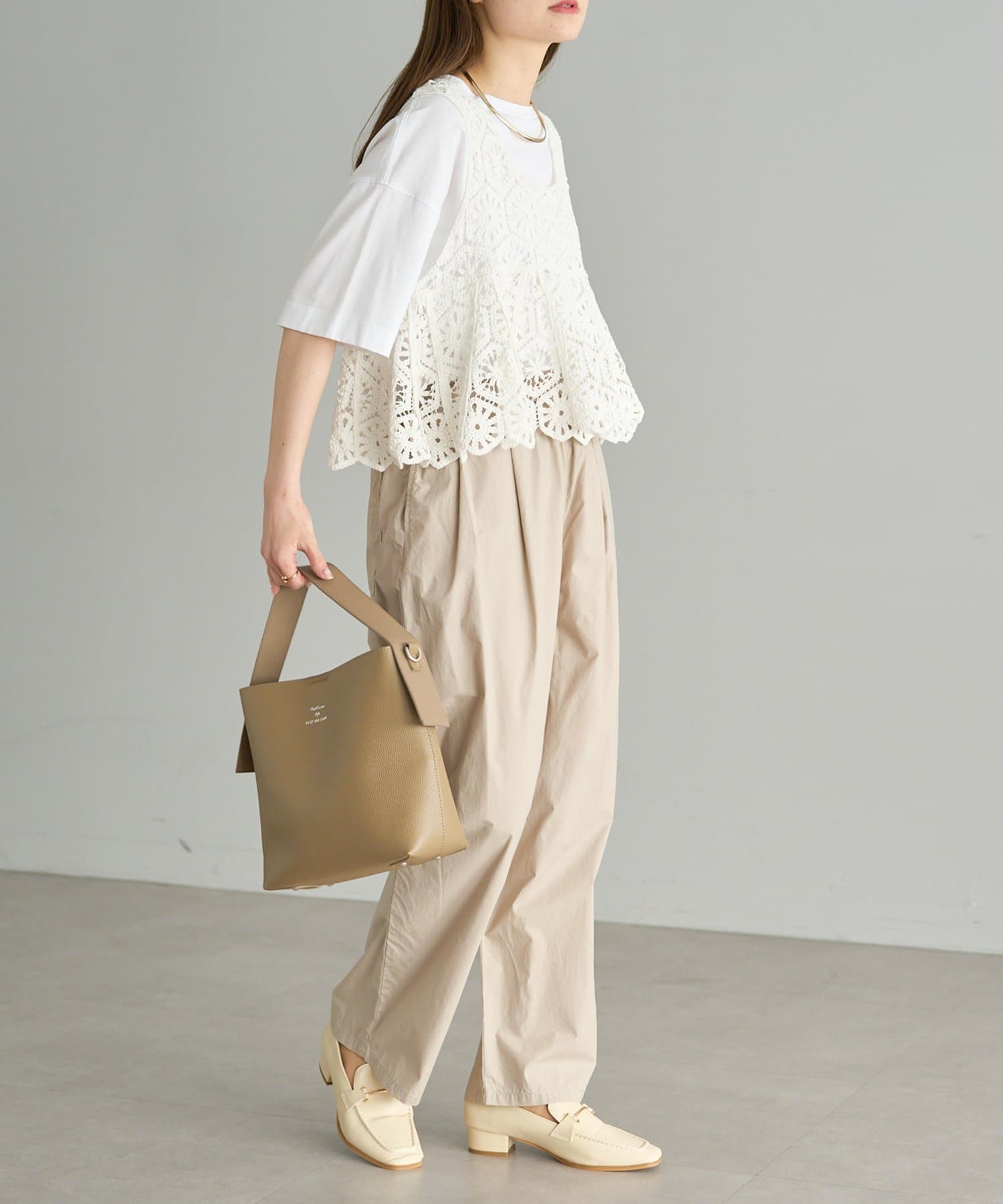 カットソーやシアーシャツに合わせて、春先や秋口も着用いただけます。