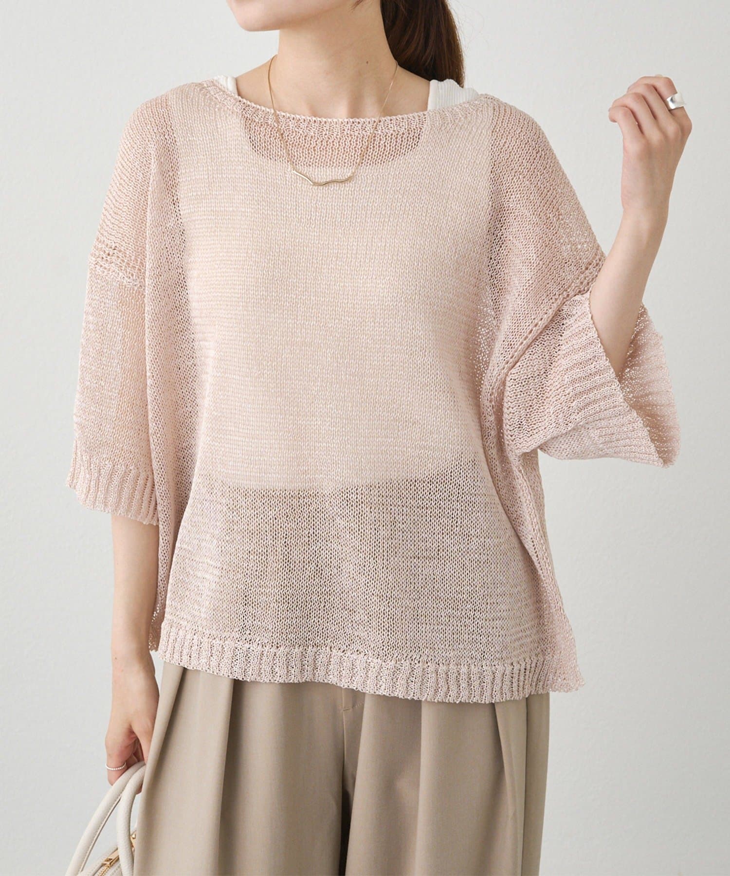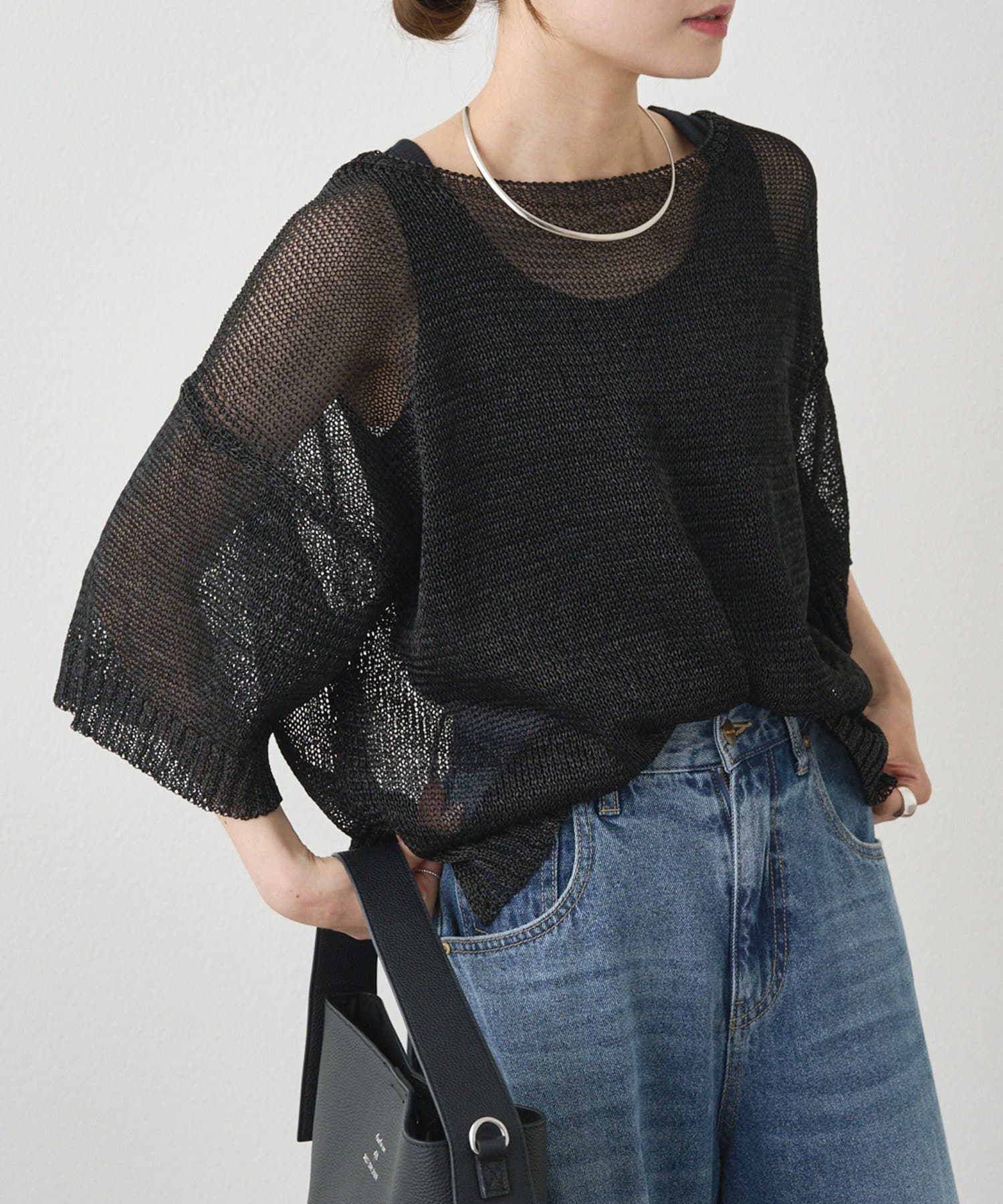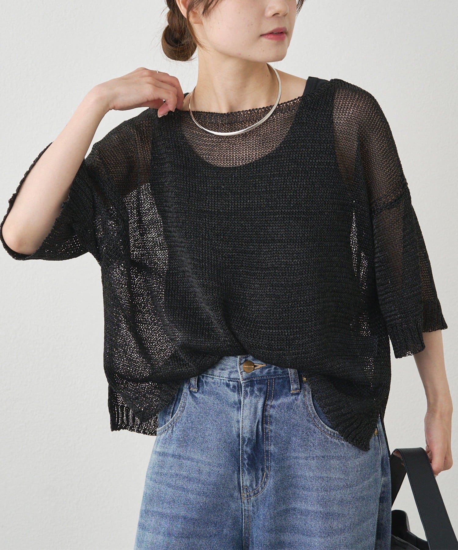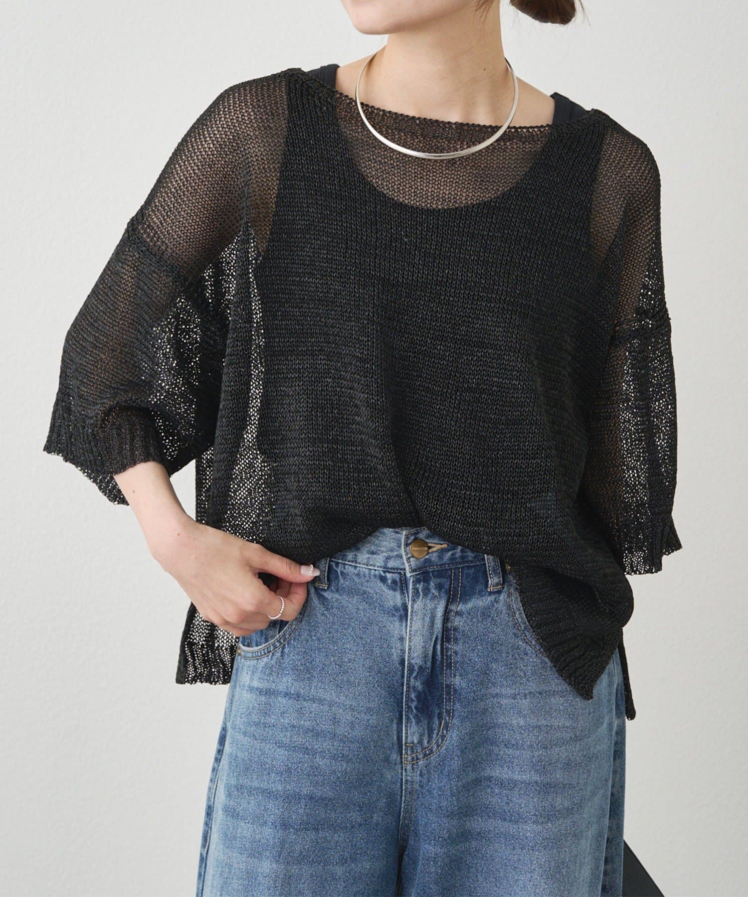 ゆったりシルエットのトップスでも編地の透け感が軽やかで、