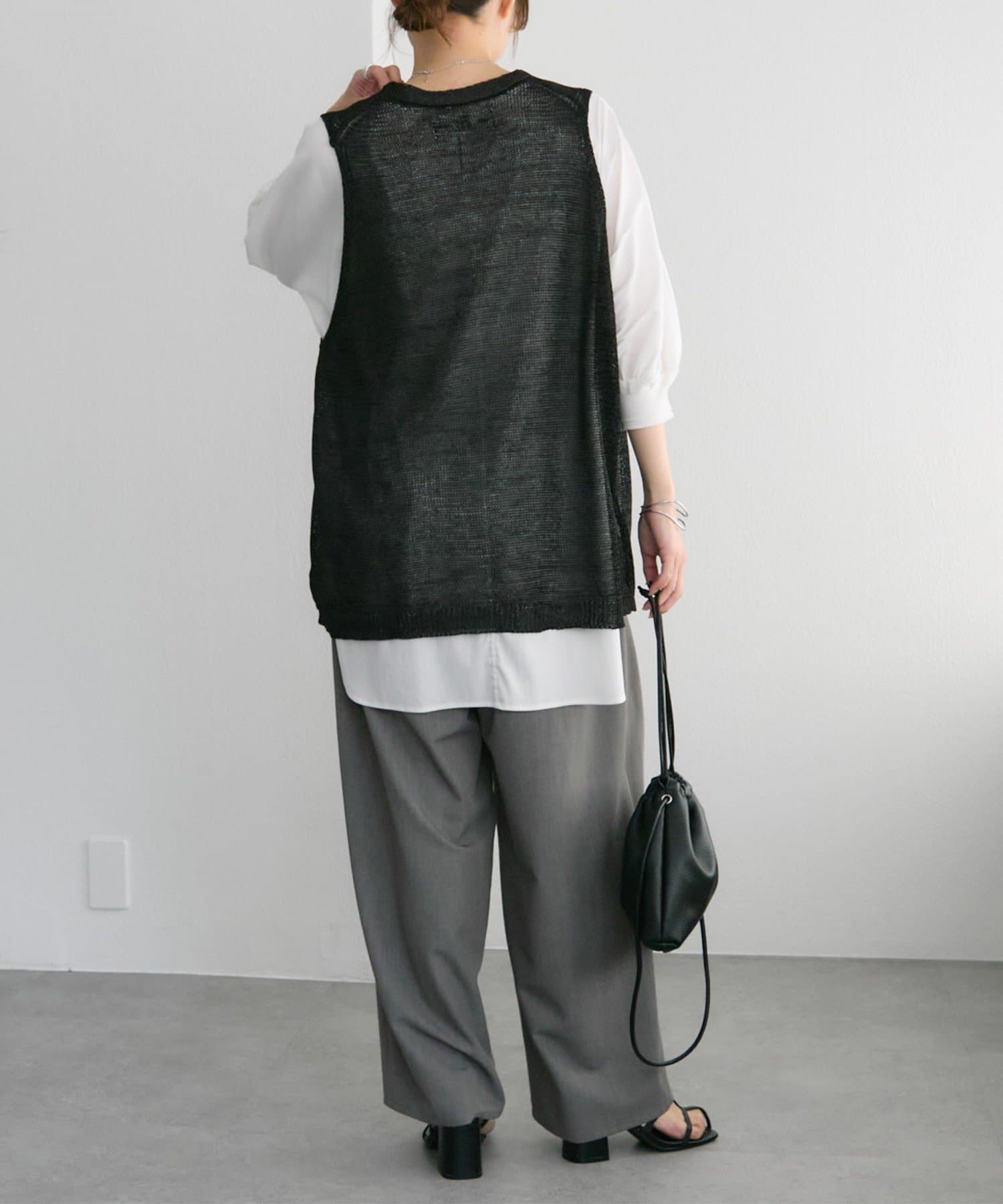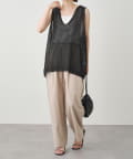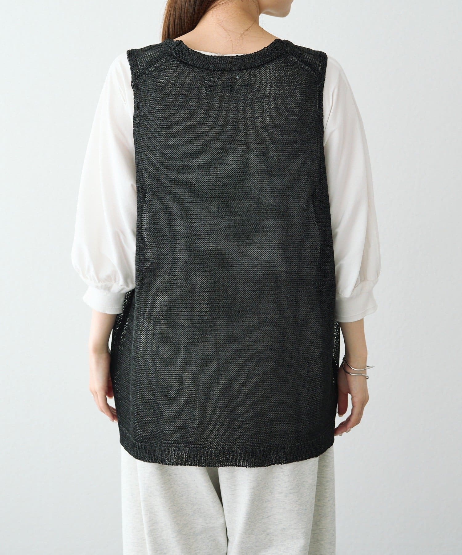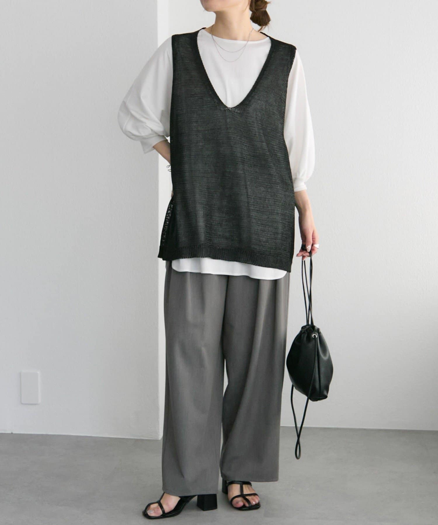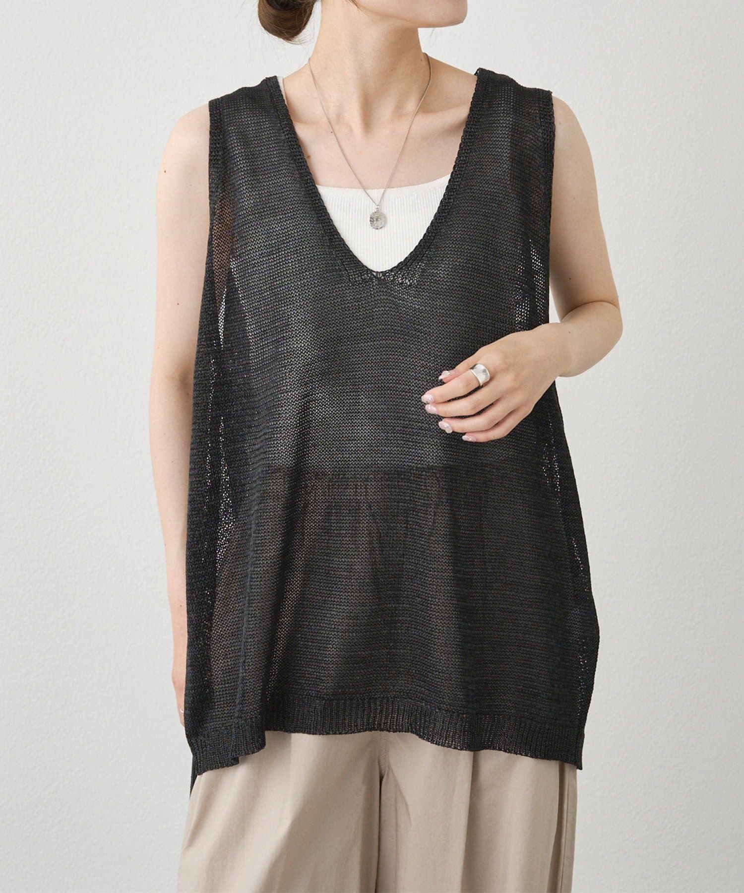 長めの着丈ですが、透け感があるため重たい印象にならずに盛夏にも清涼なレイヤードコーデを楽しめそうです。