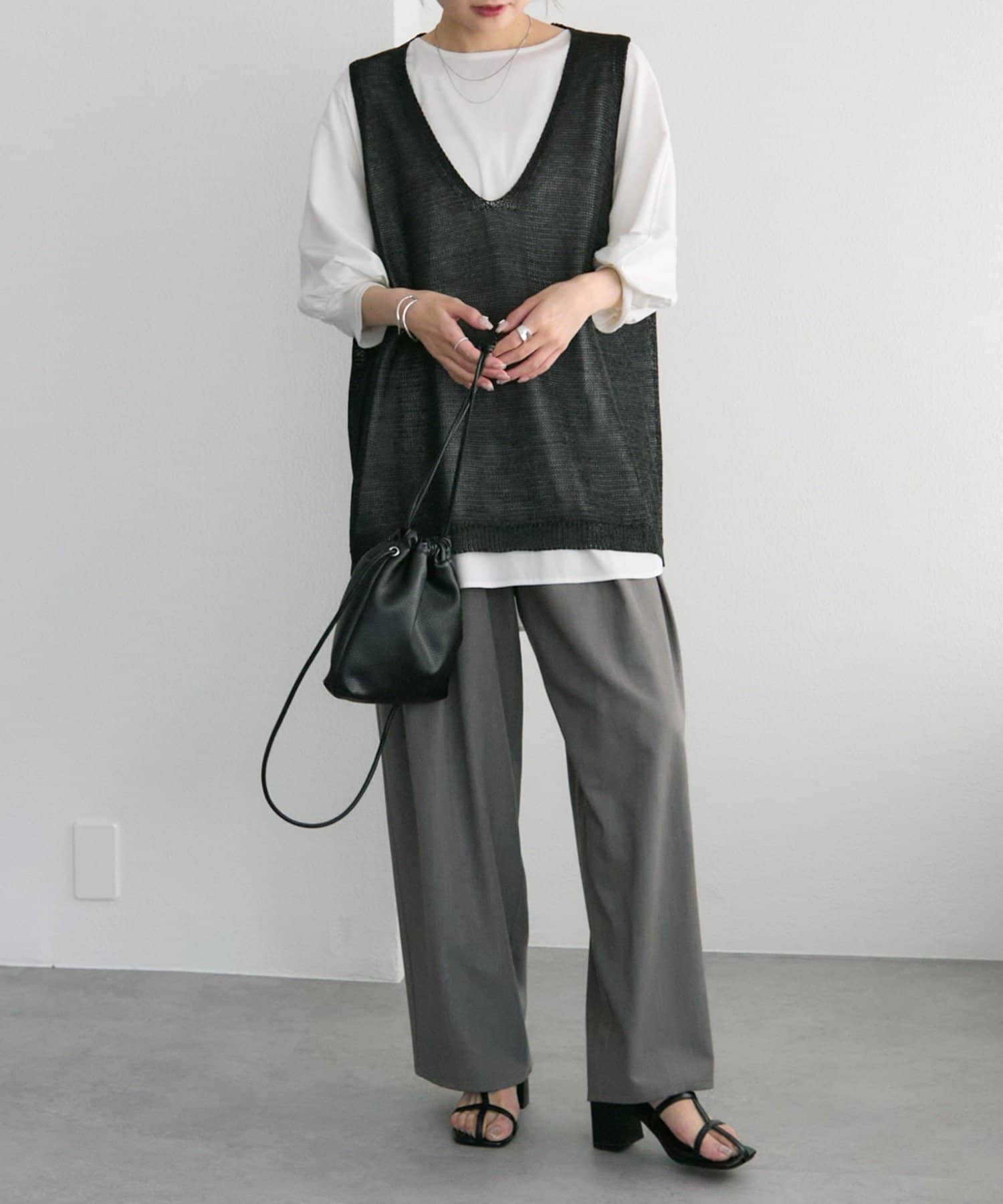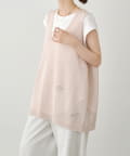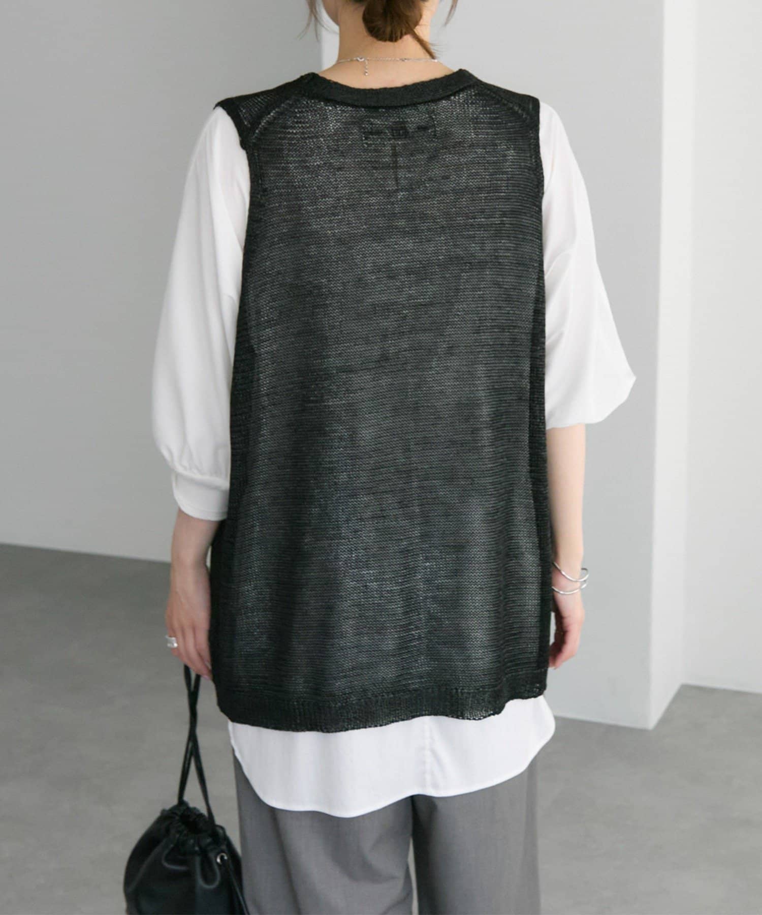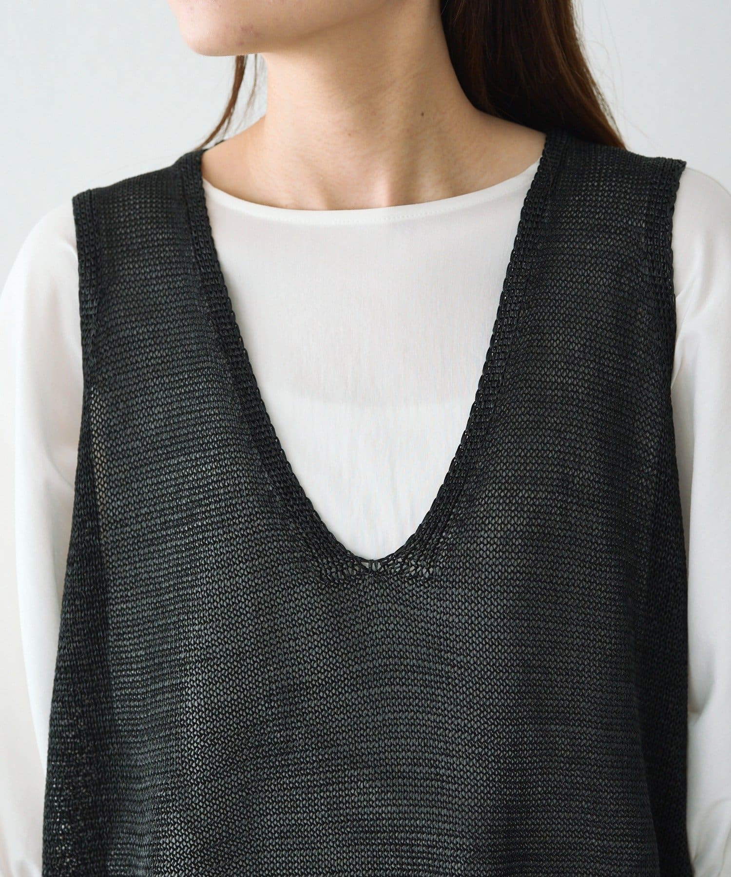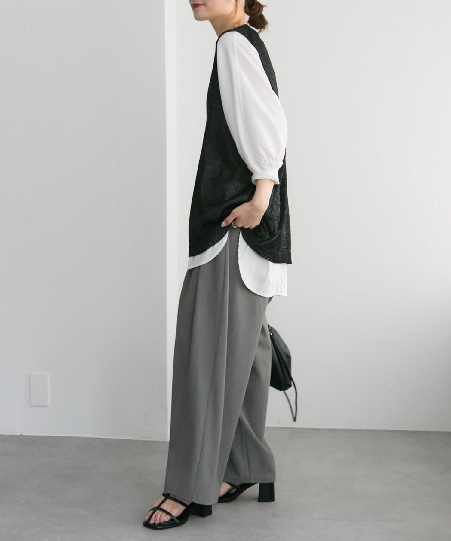 長めの着丈ですが、透け感があるため重たい印象にならずに盛夏にも清涼なレイヤードコーデを楽しめそうです。