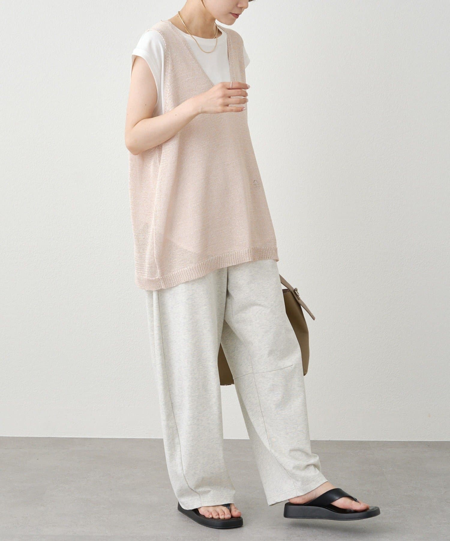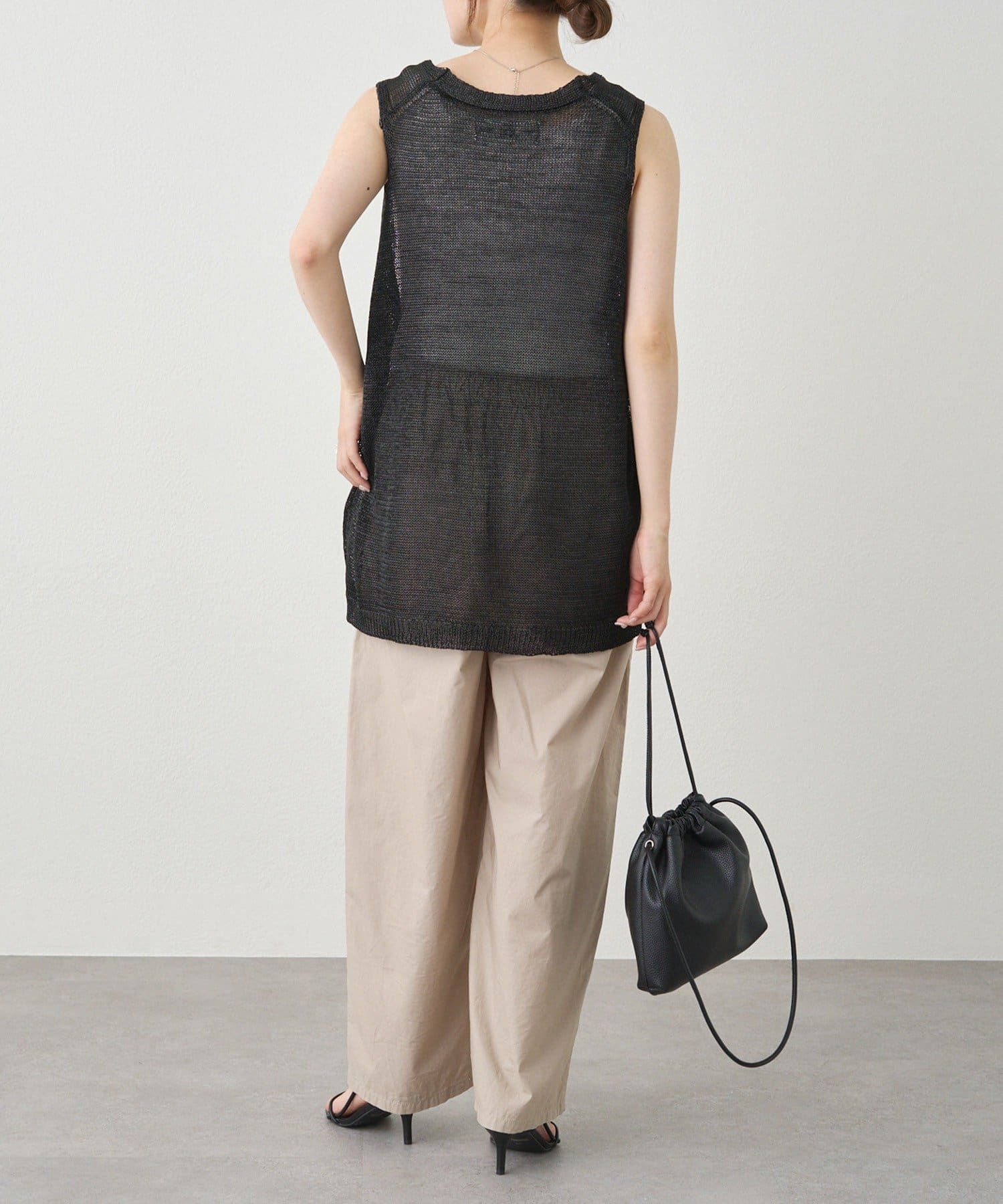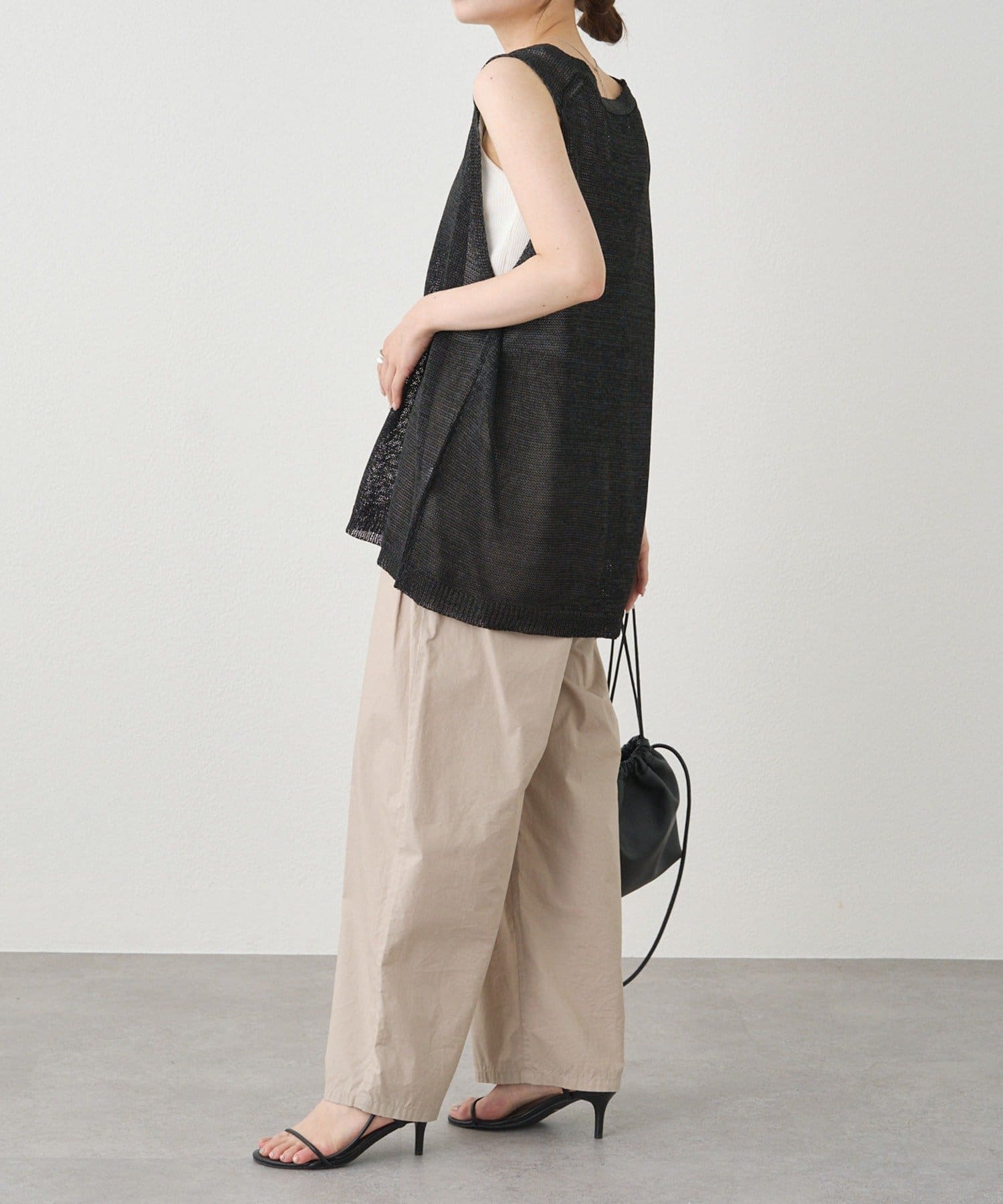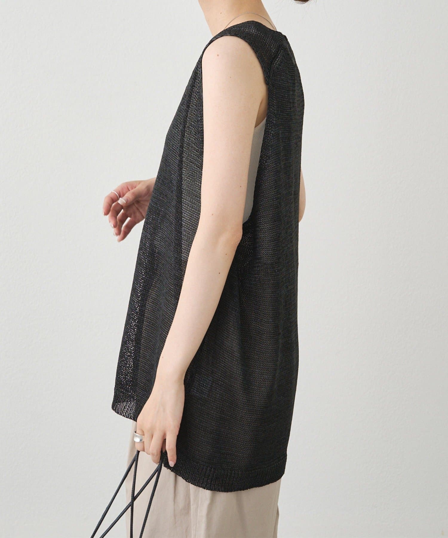 長めの着丈ですが、透け感があるため重たい印象にならずに盛夏にも清涼なレイヤードコーデを楽しめそうです。