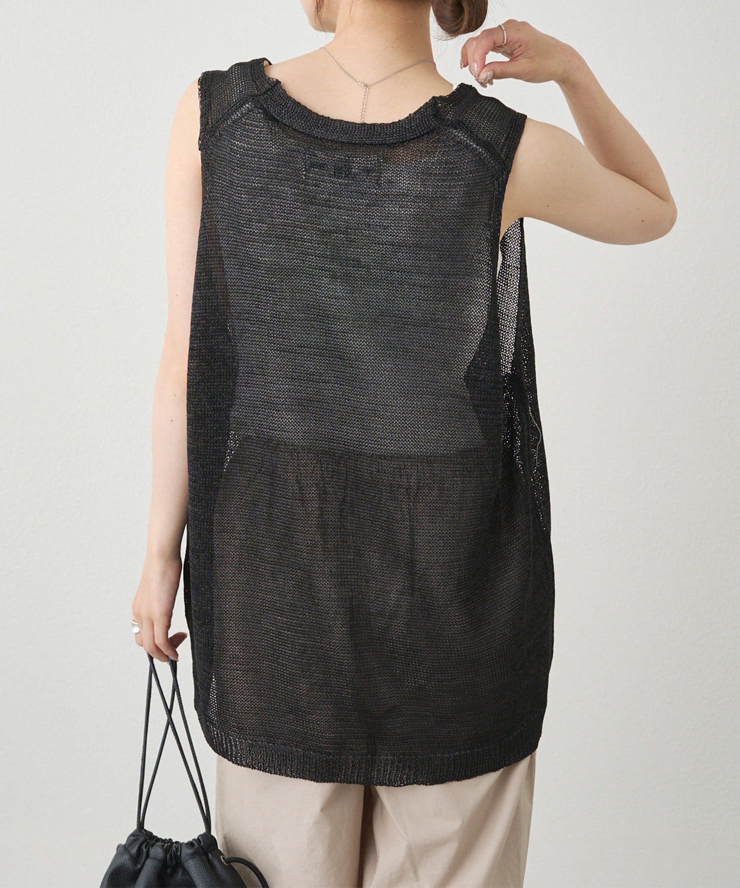 ざっくりとした編み目による透け感が身体のラインを美しく見せ、薄手の生地で暑い時期も快適に着用可能。