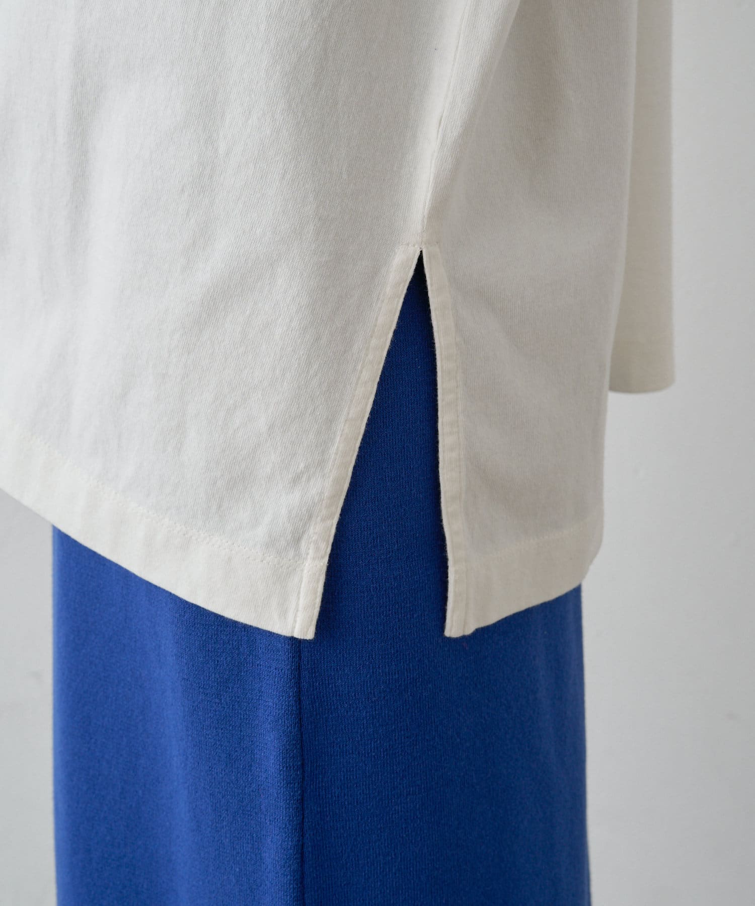 サイドにスリットが入っていることで、前側だけインしやすくなるなどコーディネートの幅が広がるポイントになっています。