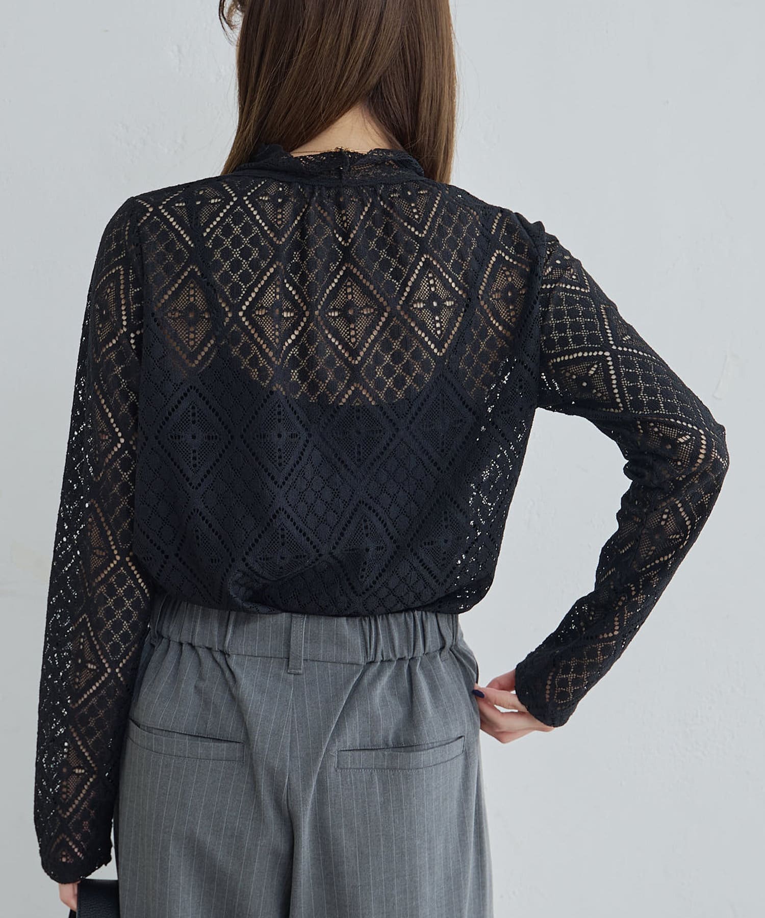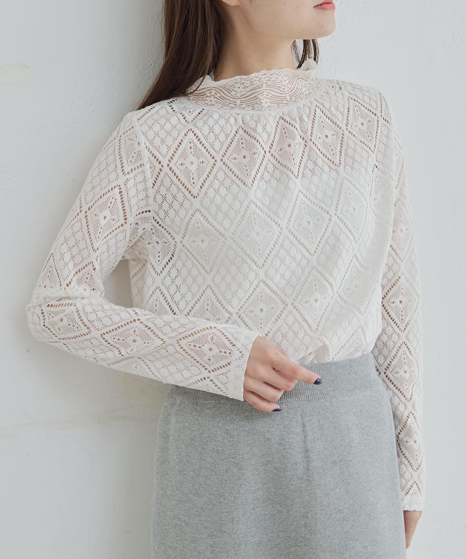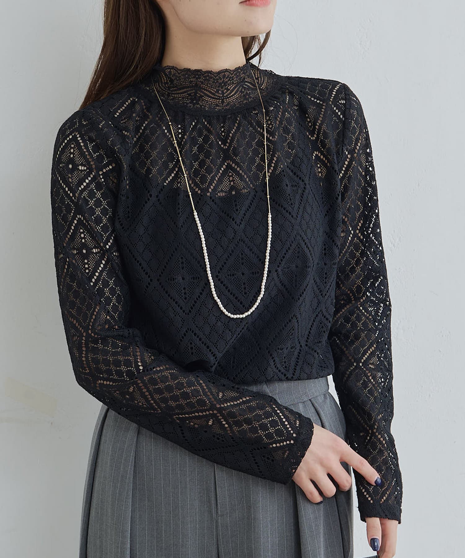 程よい透け感で品のいい肌見せが女性らしい印象へと導くレーストップス。