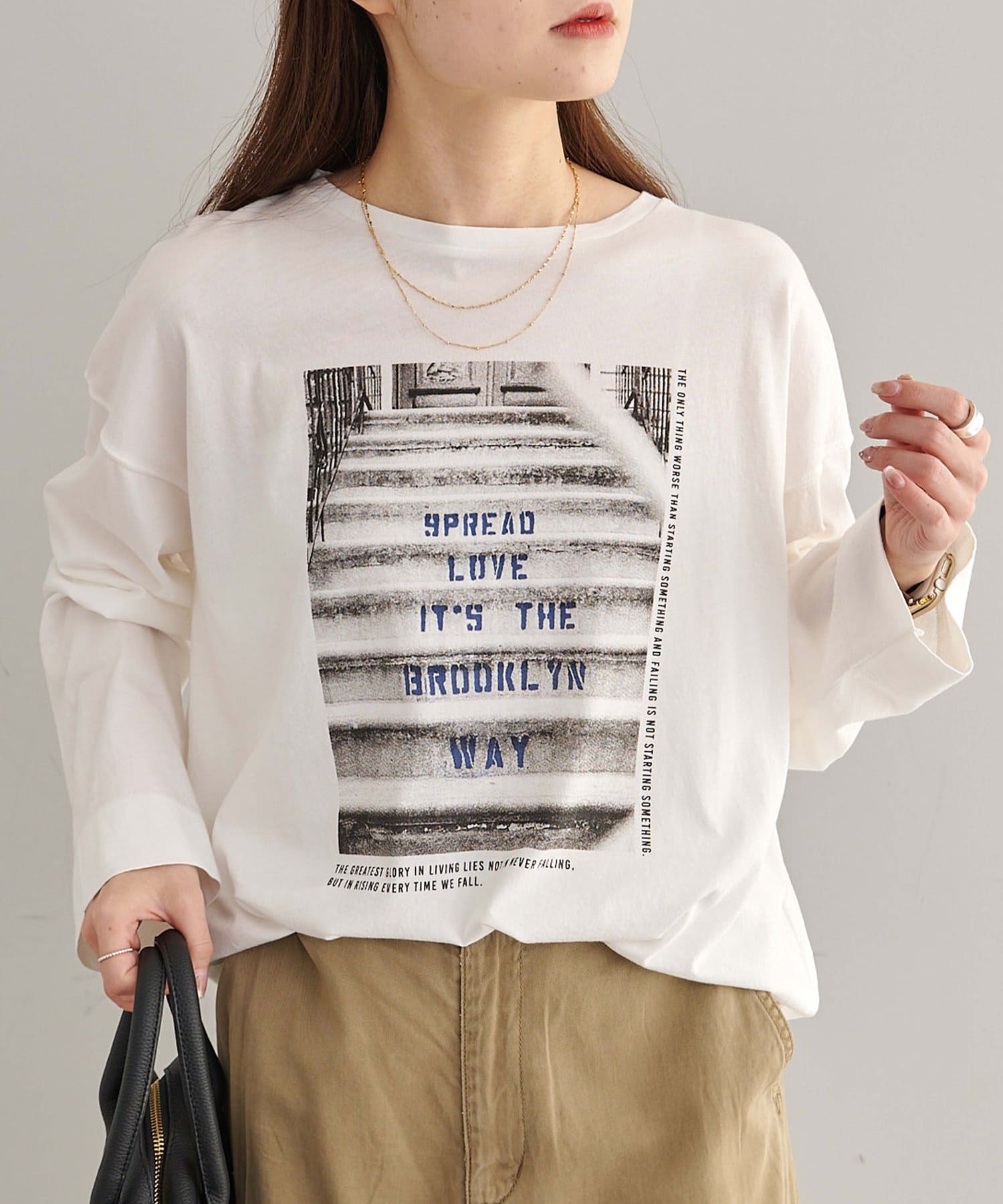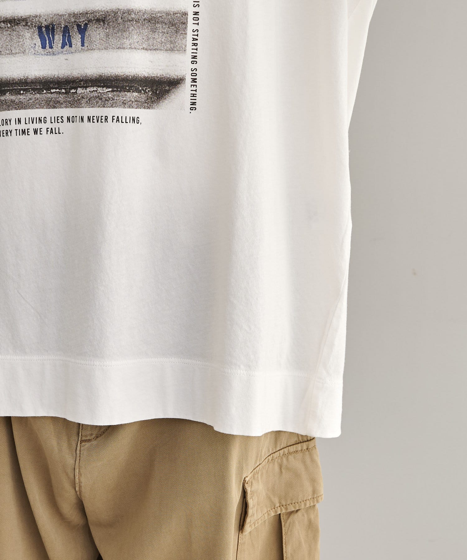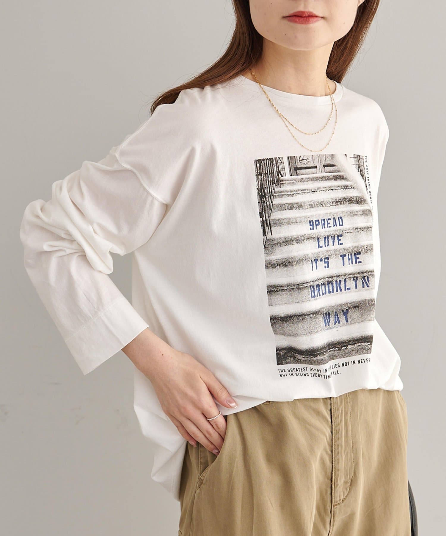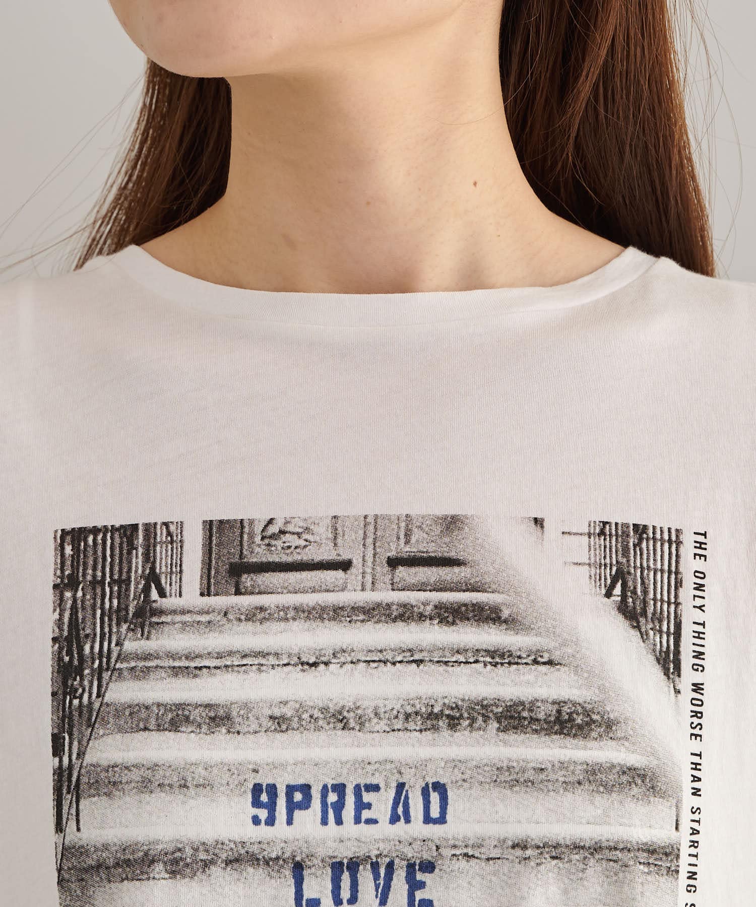 フロントのロゴ入りスクエアフォトが目を惹くカットソー。