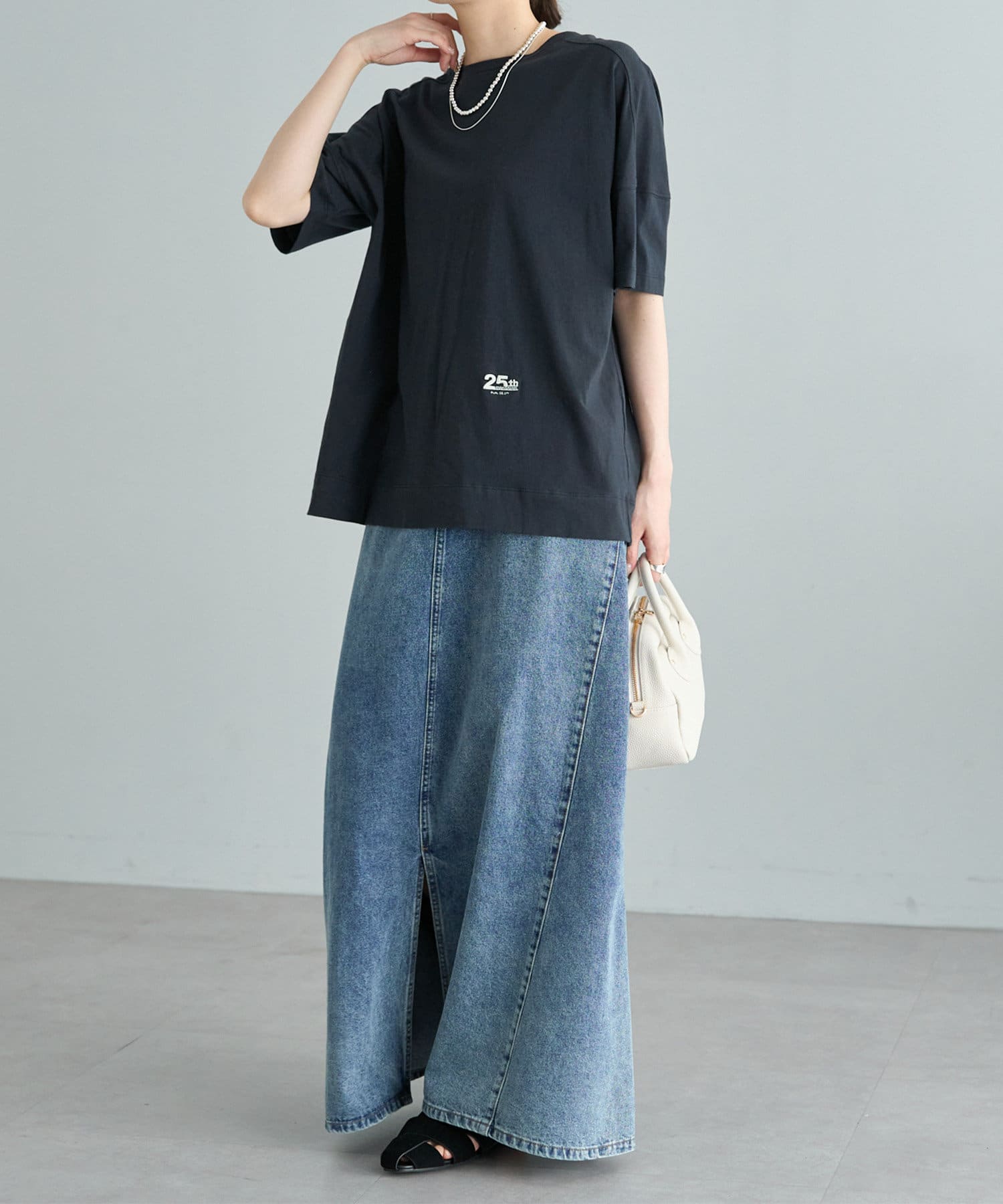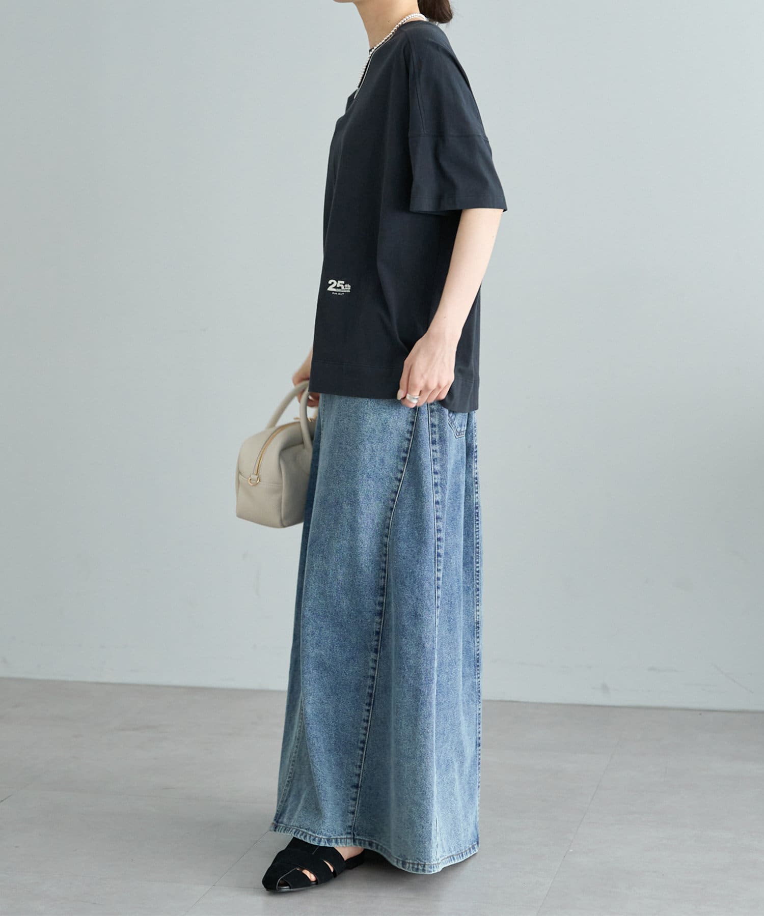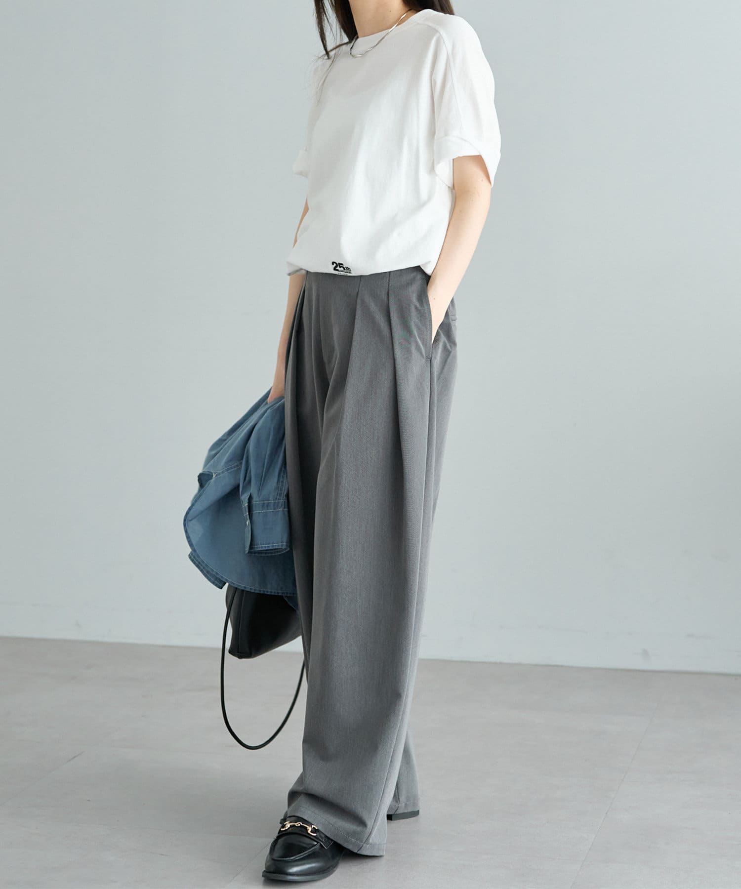 ベーシックなTシャツなので、ボトムスで次第でテイストの変化を楽しめる一枚。