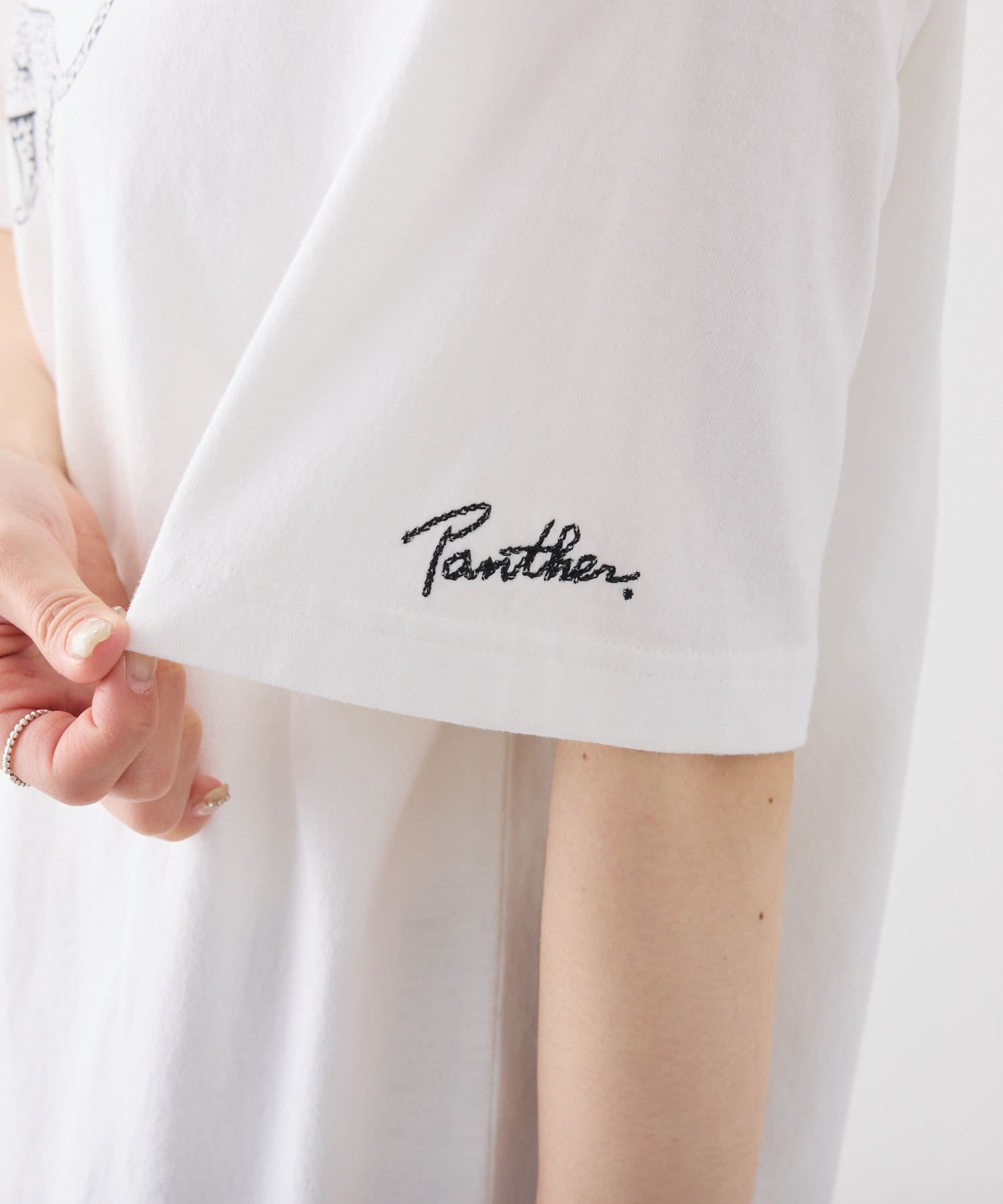 袖にはチェーンステッチの刺繍で”panther”の文字が入り、さりげないアクセントに。