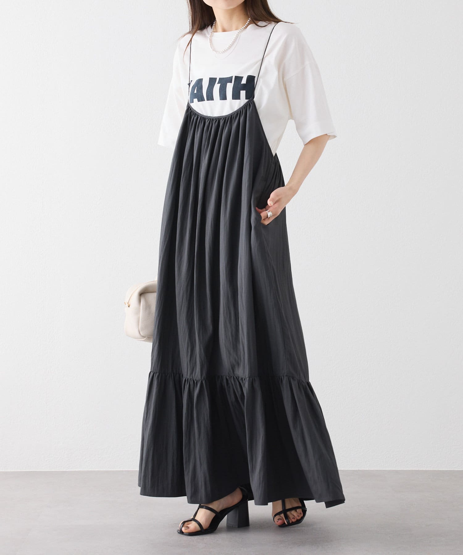 フレアスカートやキャミワンピースなどレディライクなアイテムと合わせると程よくカジュアルダウンしてくれます。