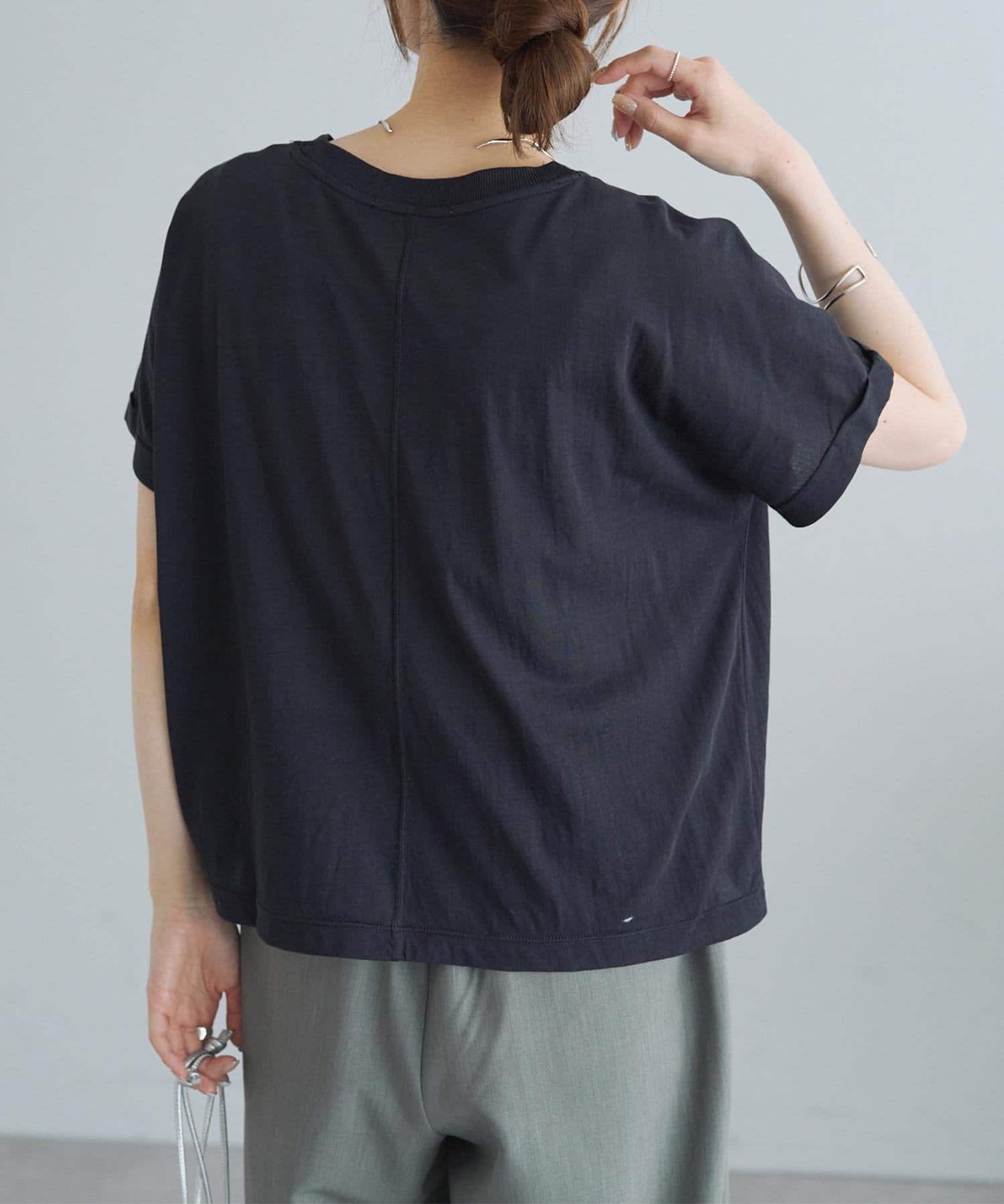 体のラインを拾いすぎない絶妙なサイジングも、やや短めの着丈と袖丈ですっきとした印象に。