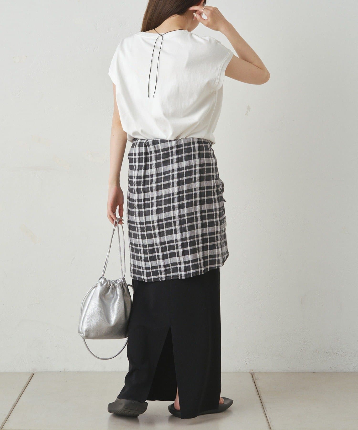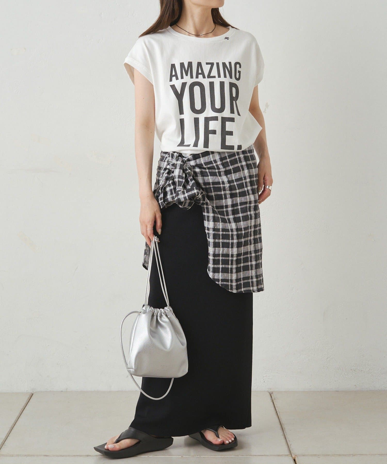 足元には華奢なヒールサンダルやカジュアルなスポーツサンダルを合わせるとトレンド感がアップした着こなしに。