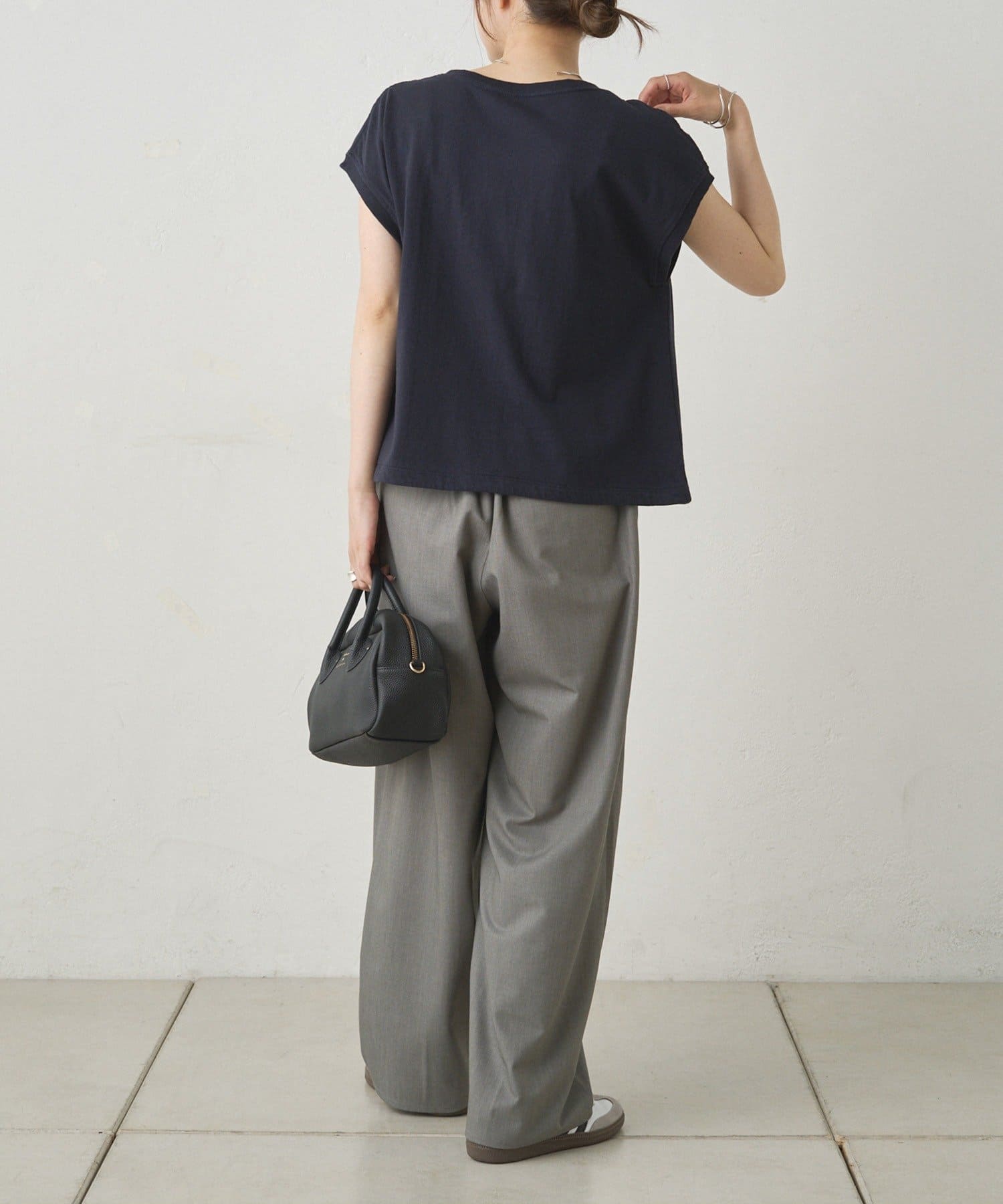 程よいゆとりのサイズ感はジャケットやシャツの羽織物ともすっきりと着用でき、