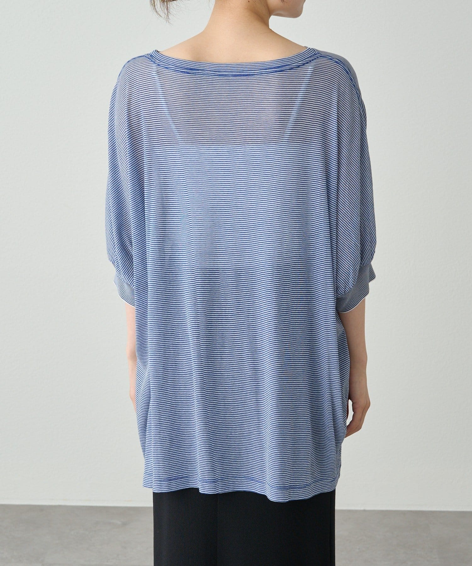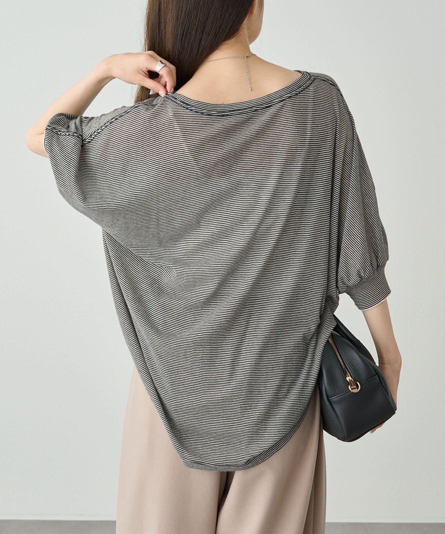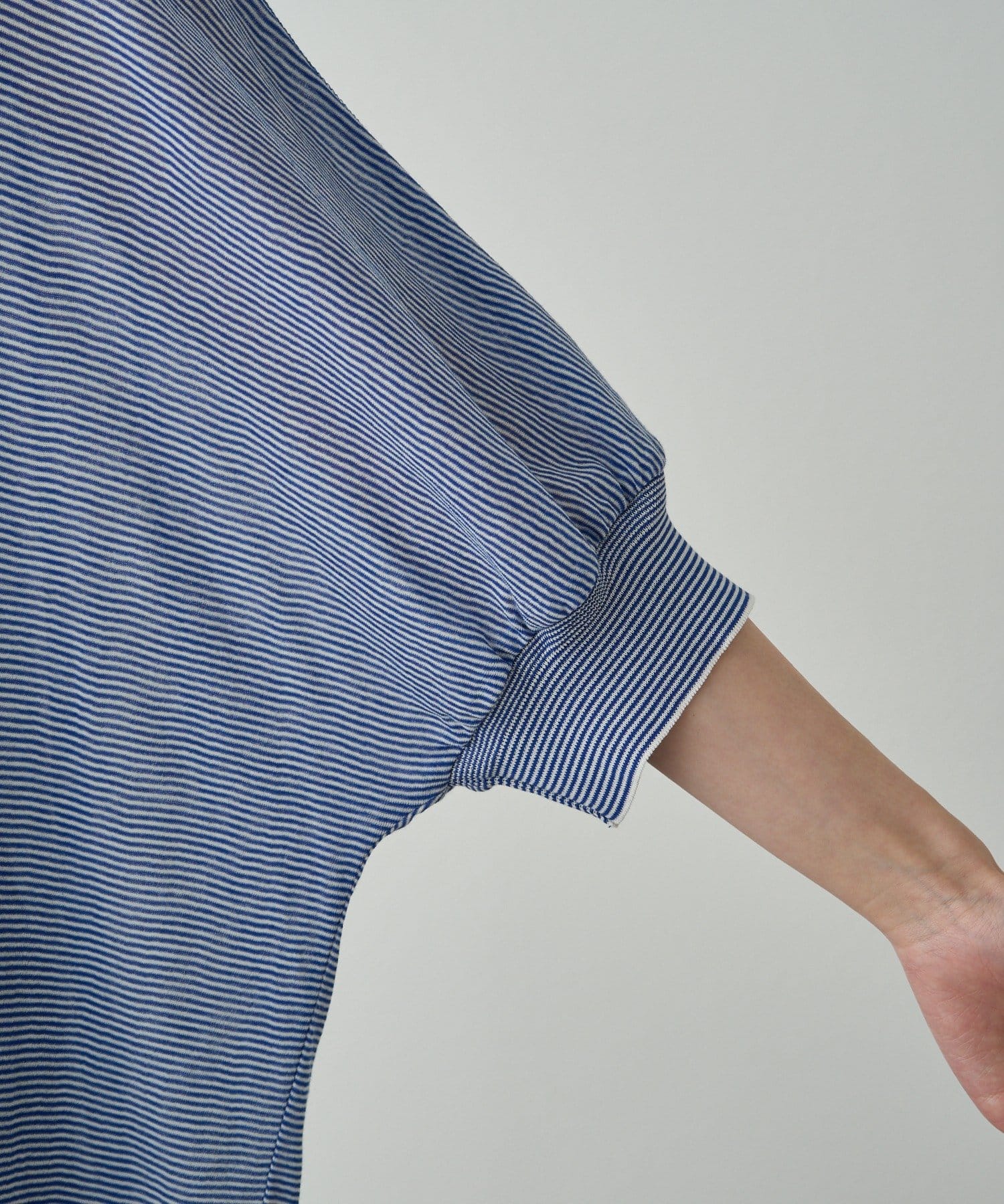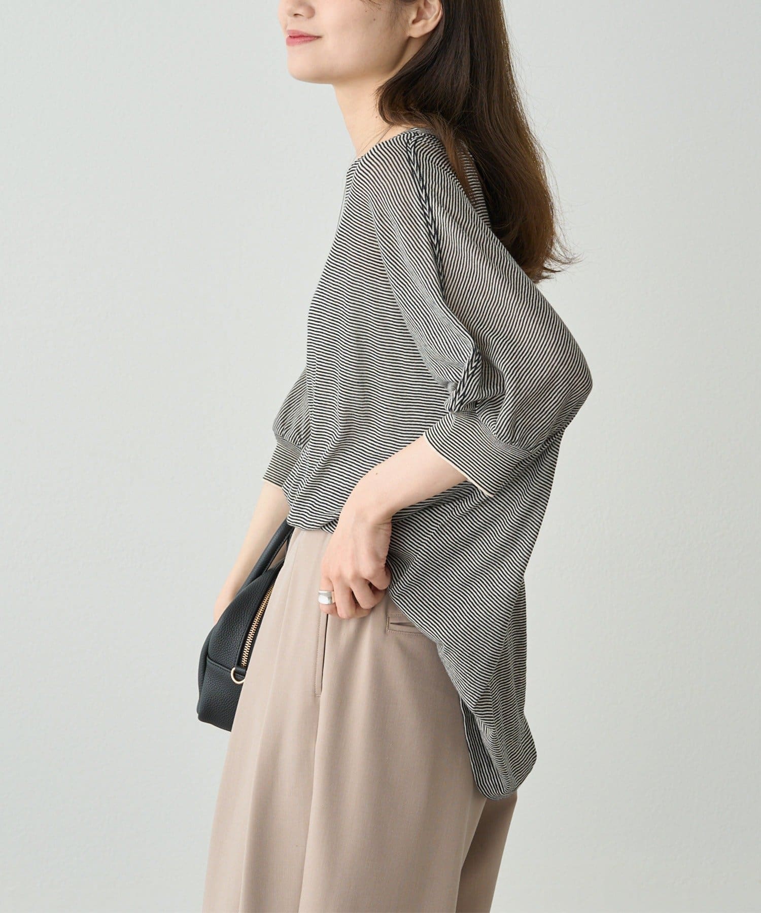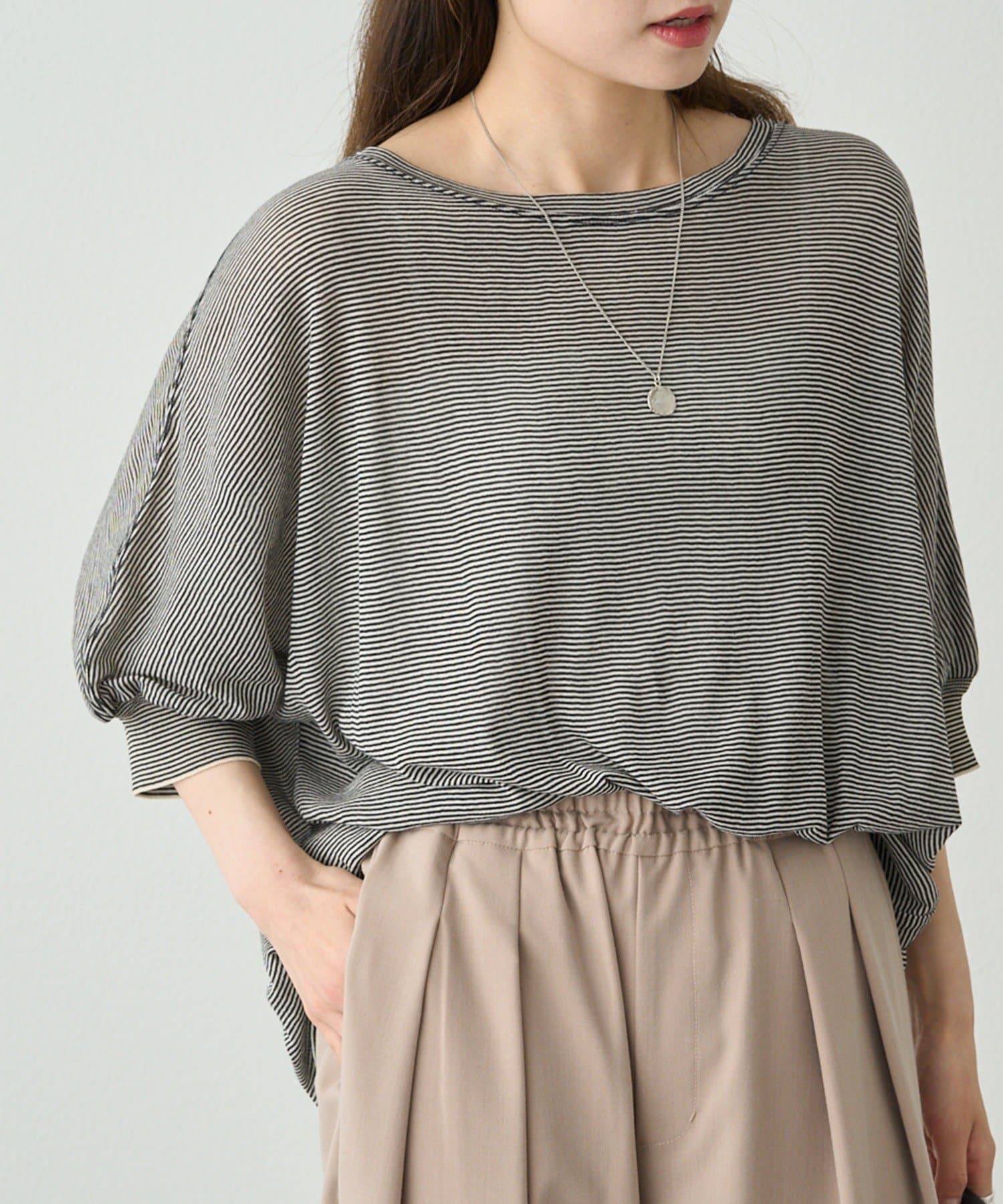 オフホワイト地の細ボーダーとシアー感が爽やかでこれからの時期にピッタリなカットソー。