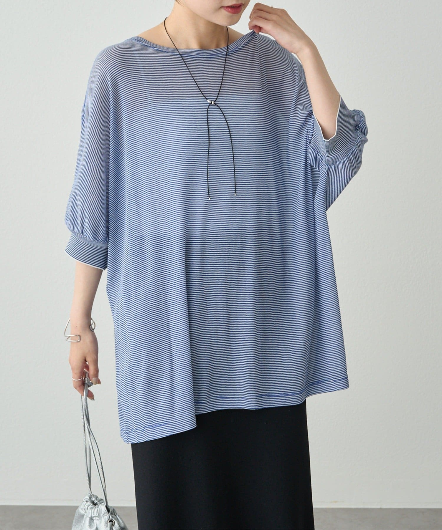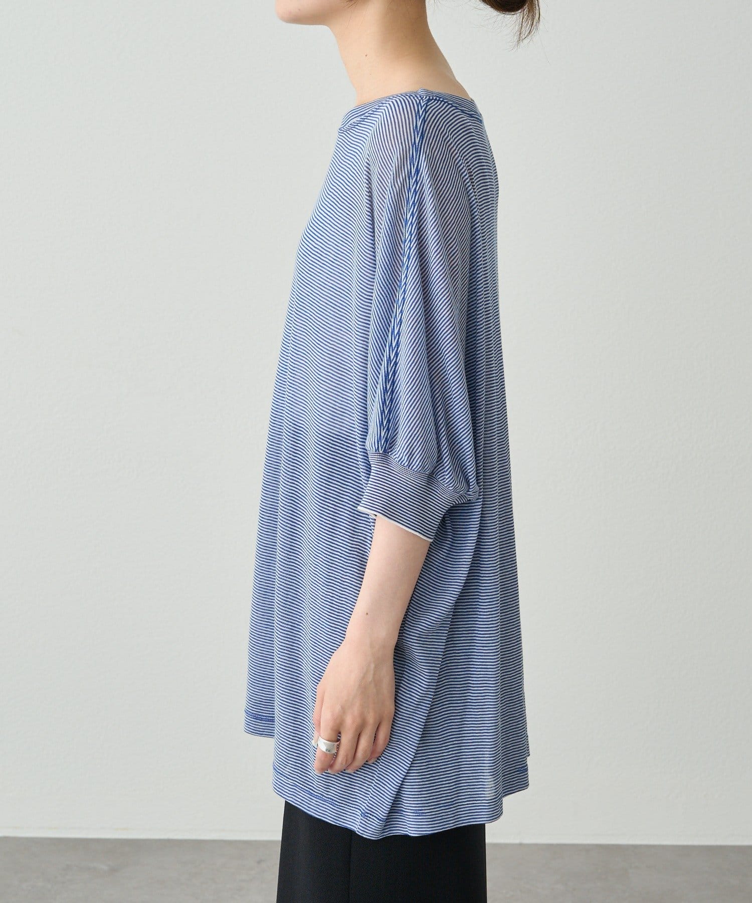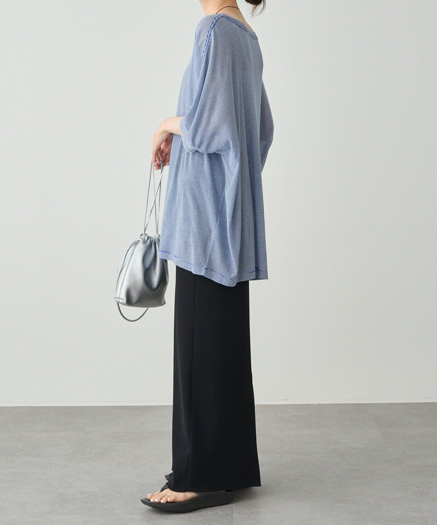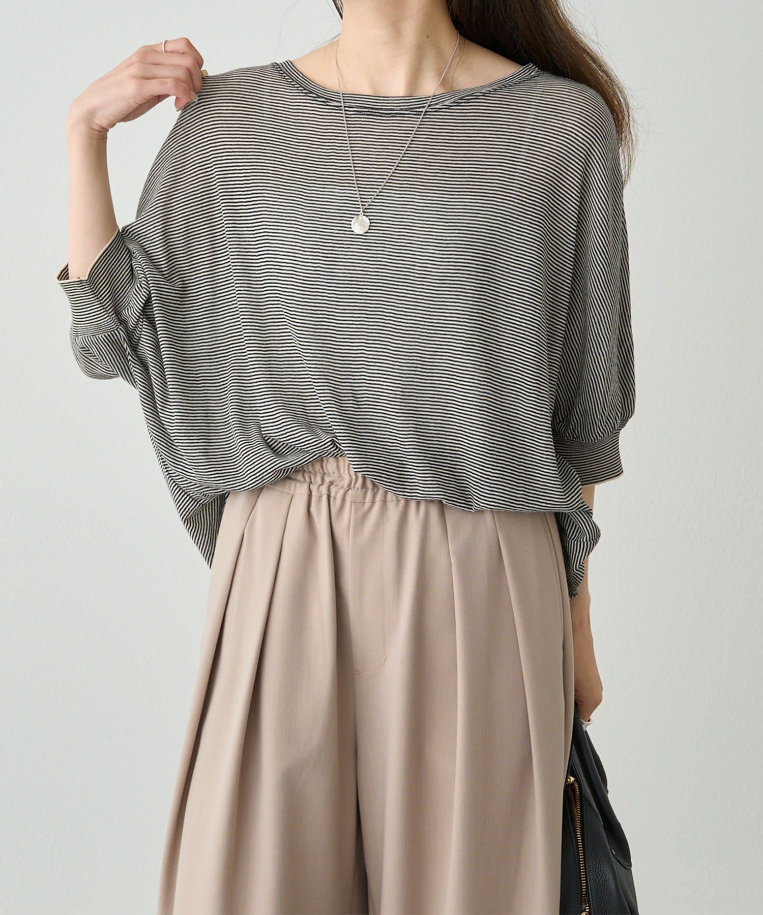 オフホワイト地の細ボーダーとシアー感が爽やかでこれからの時期にピッタリなカットソー。