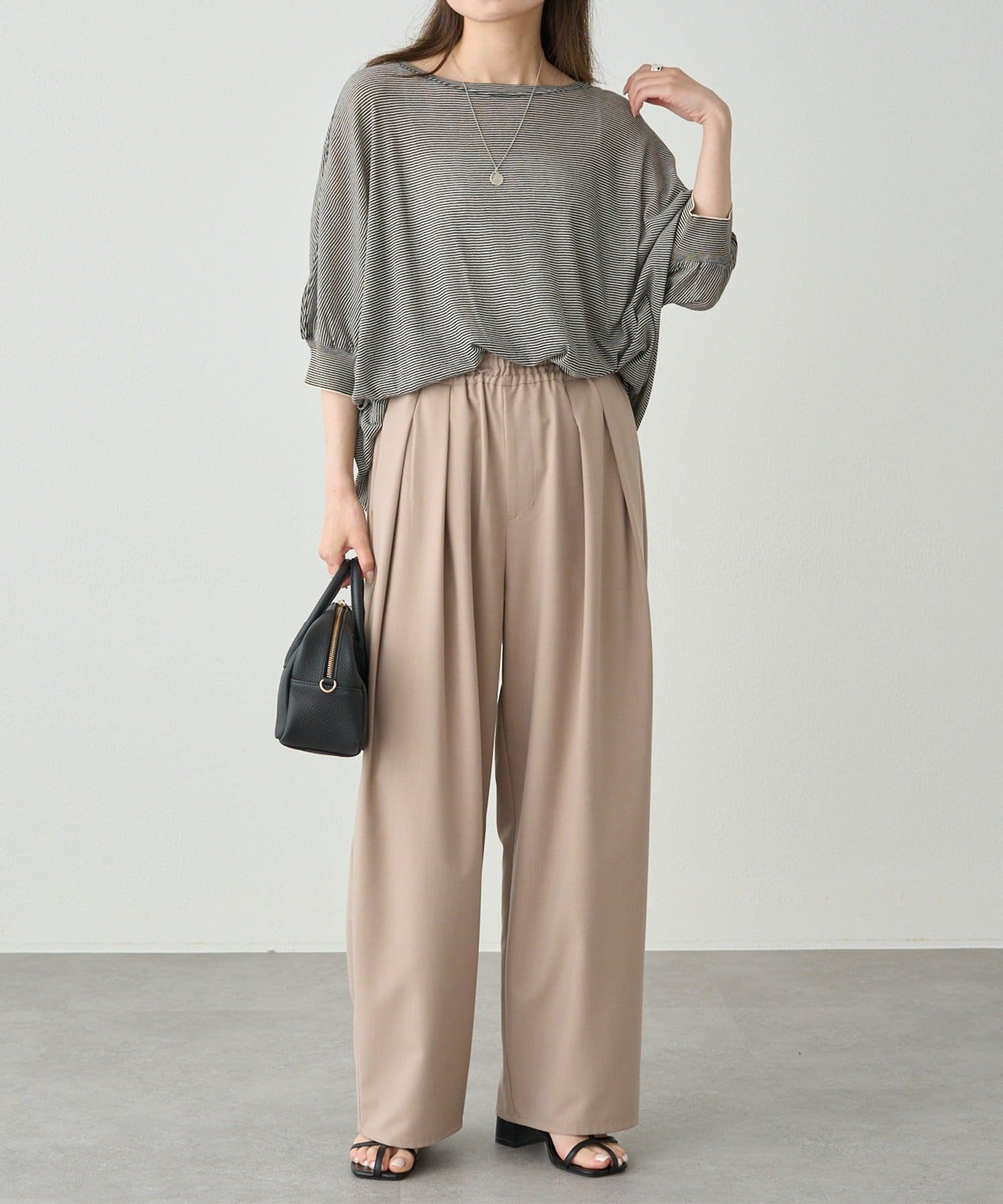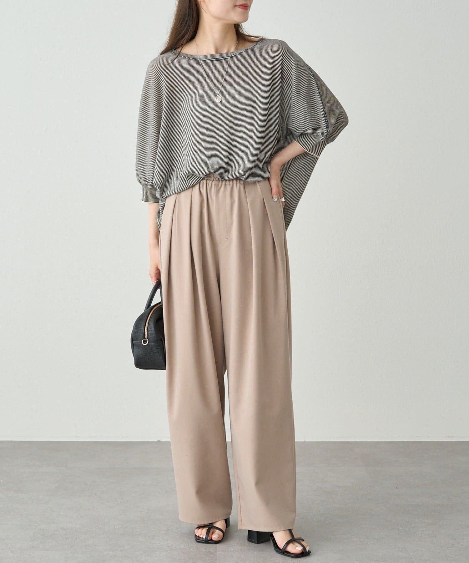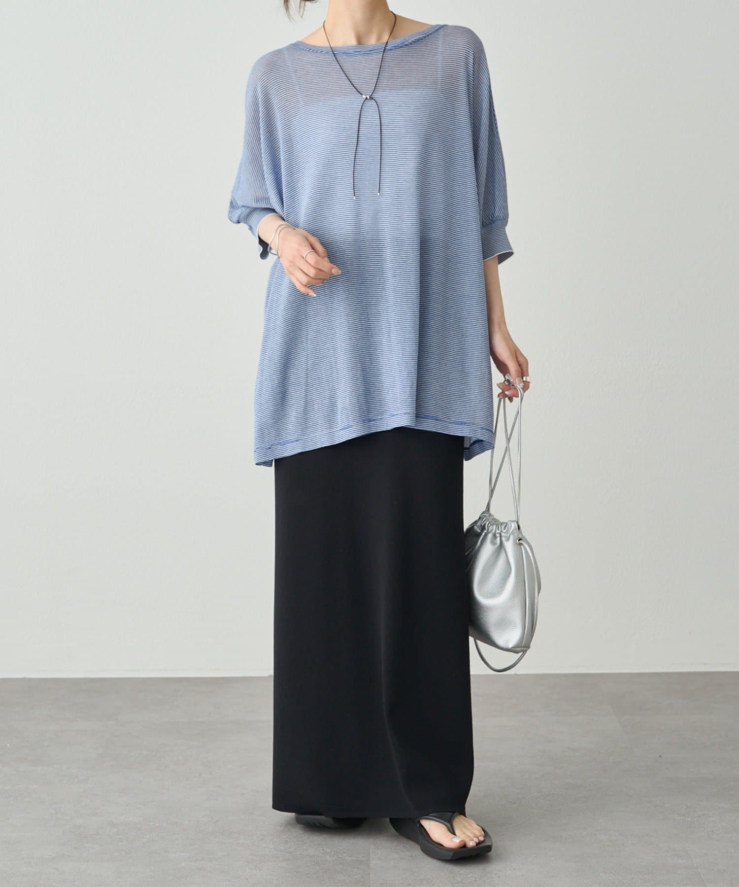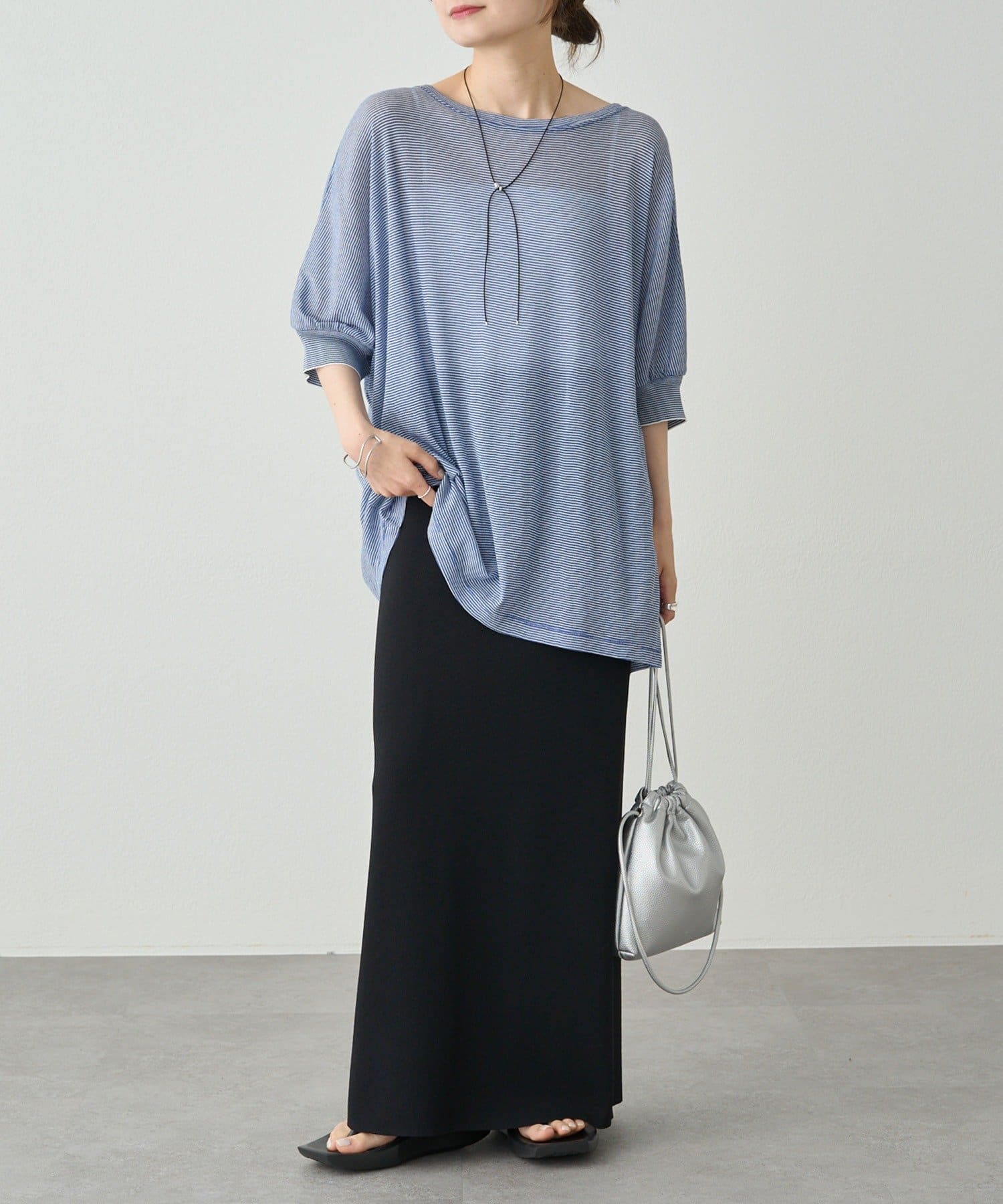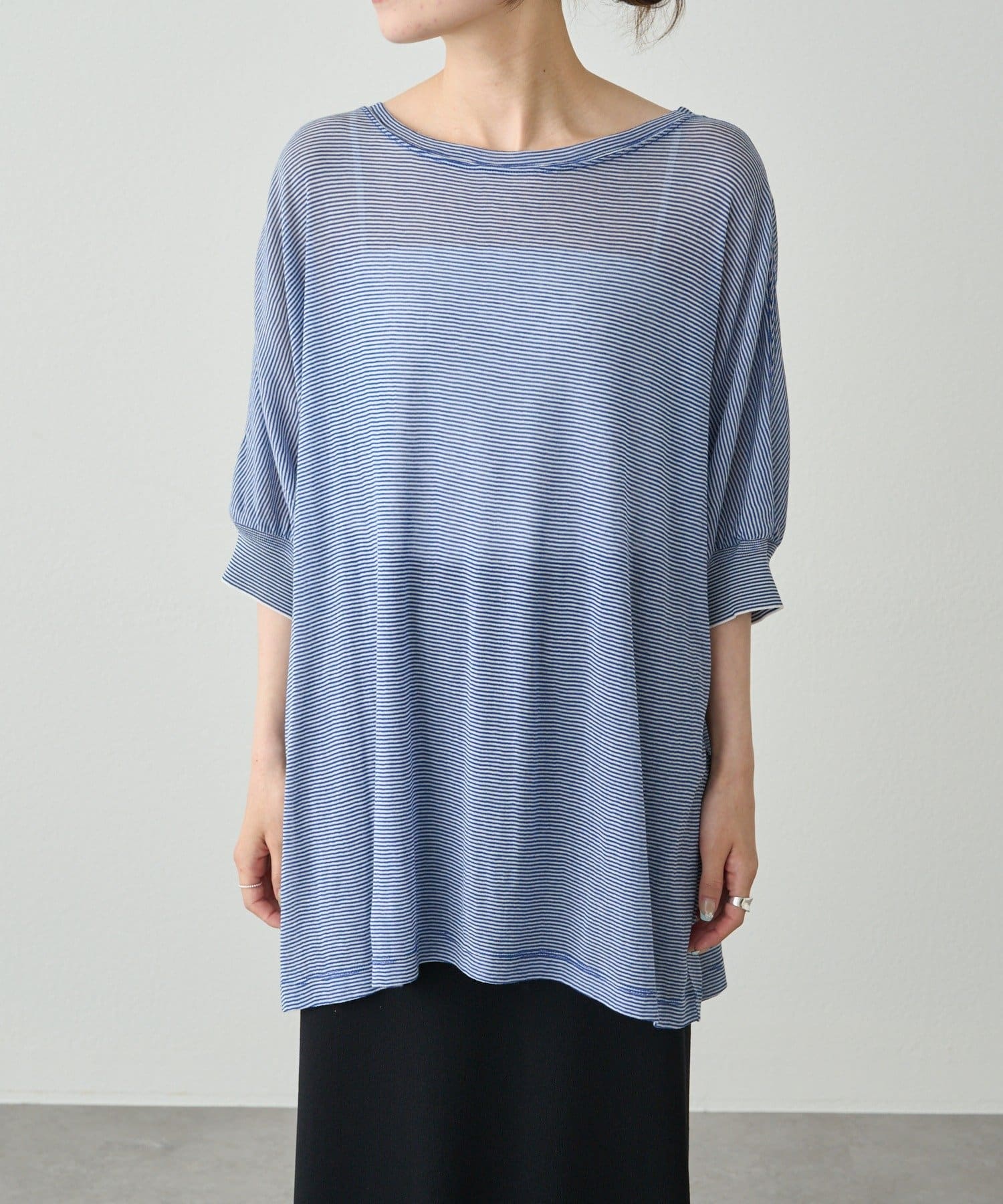 オフホワイト地の細ボーダーとシアー感が爽やかでこれからの時期にピッタリなカットソー。