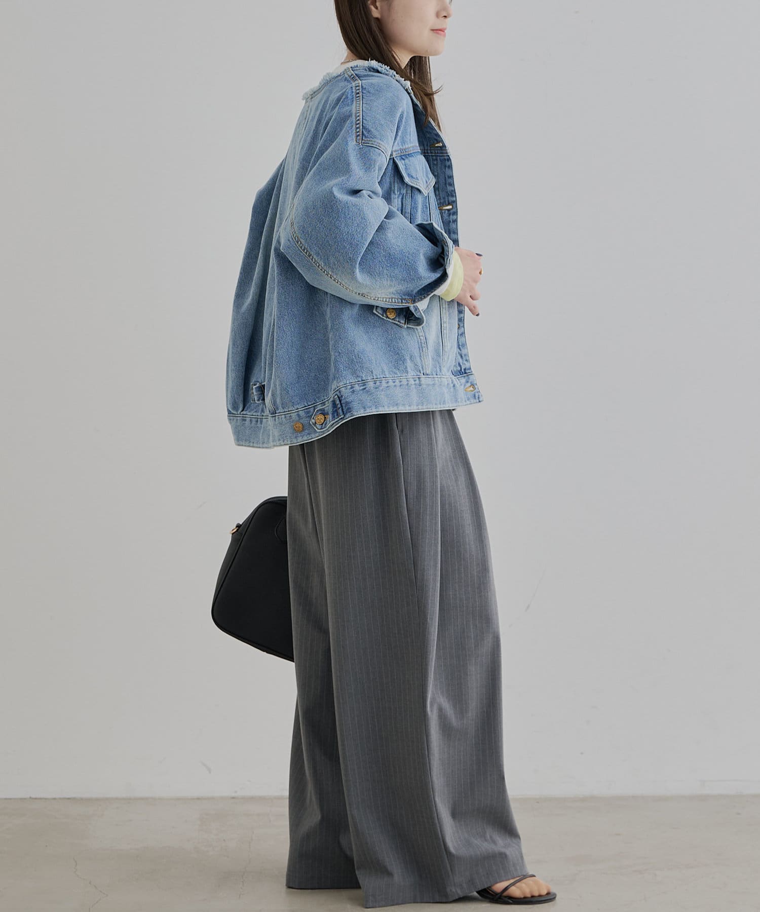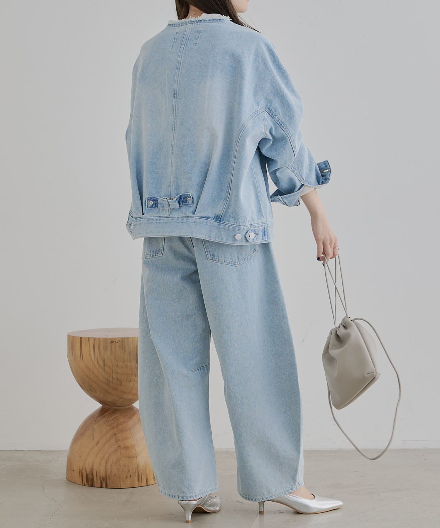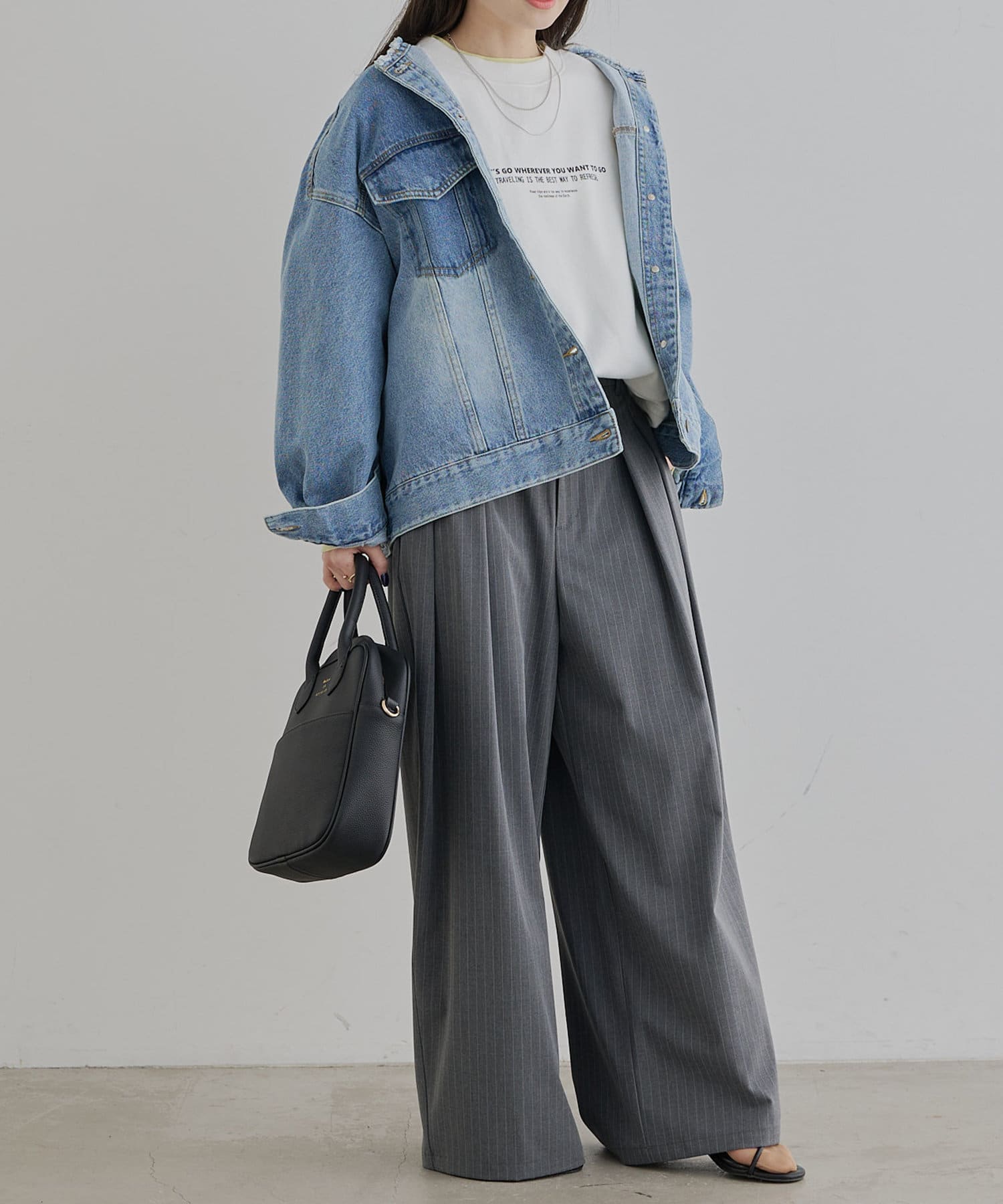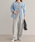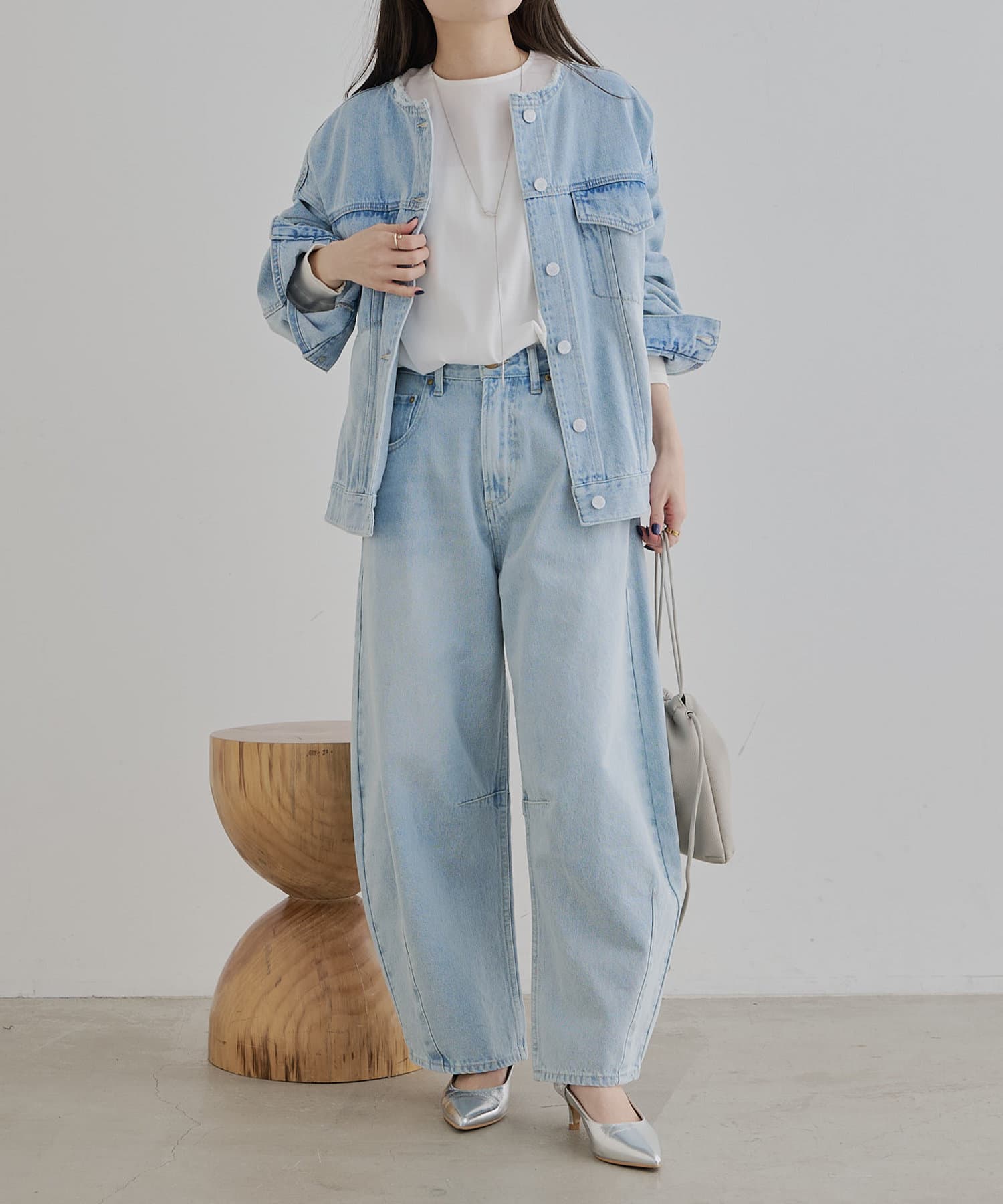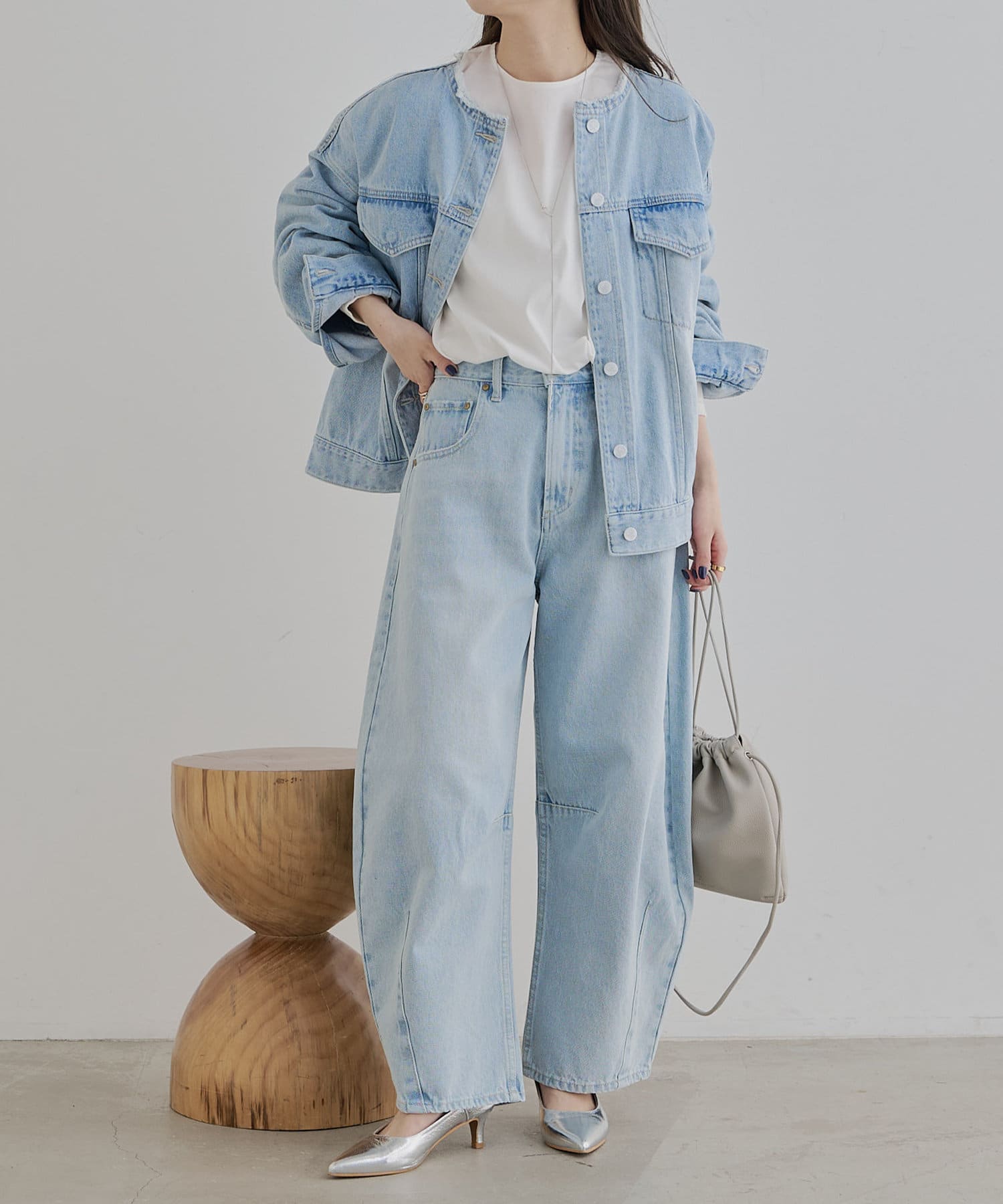 同じ色合いのデニムパンツを合わせ、デニムコーディネートでメンズライクな着こなしや