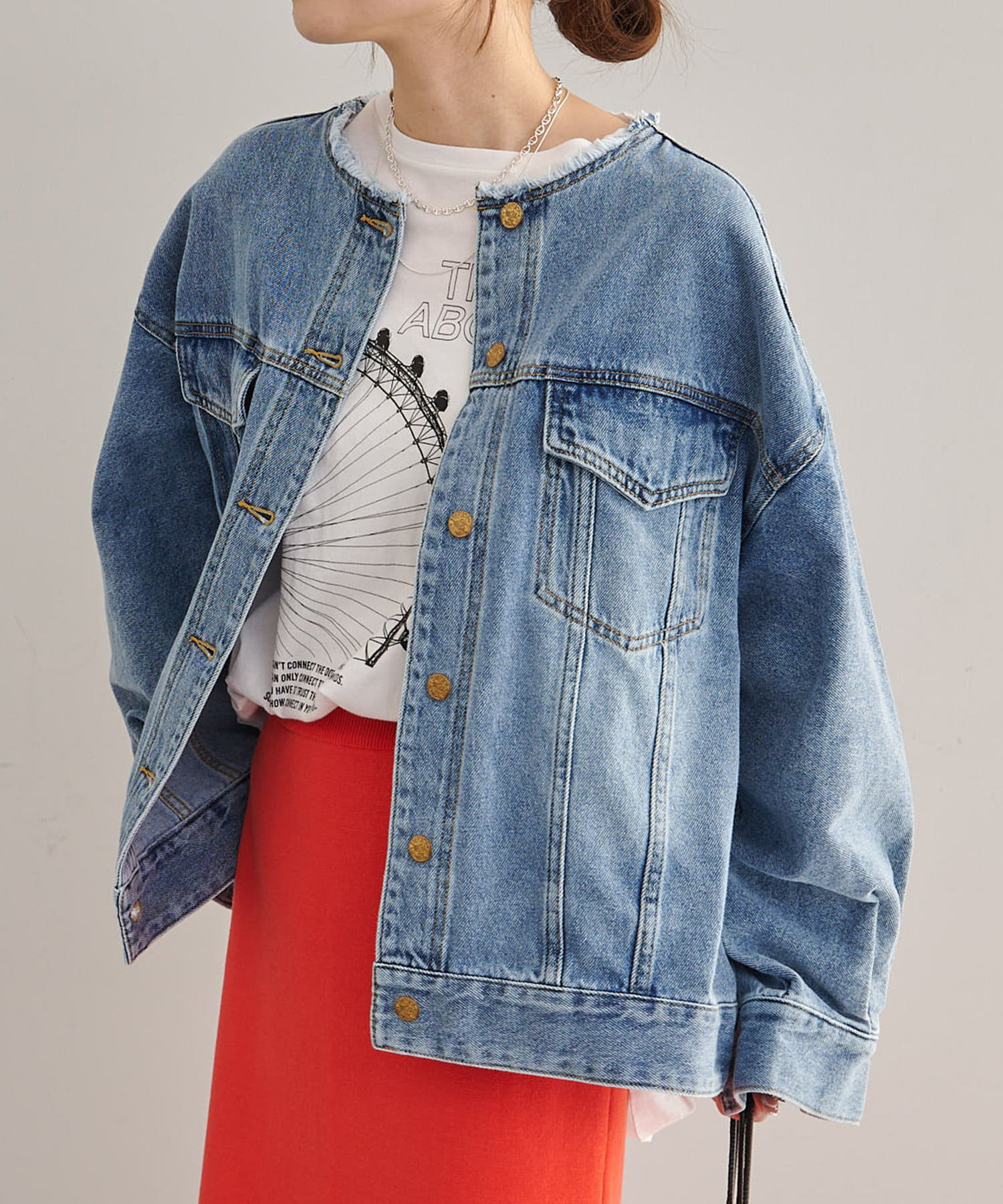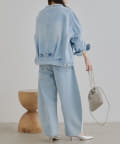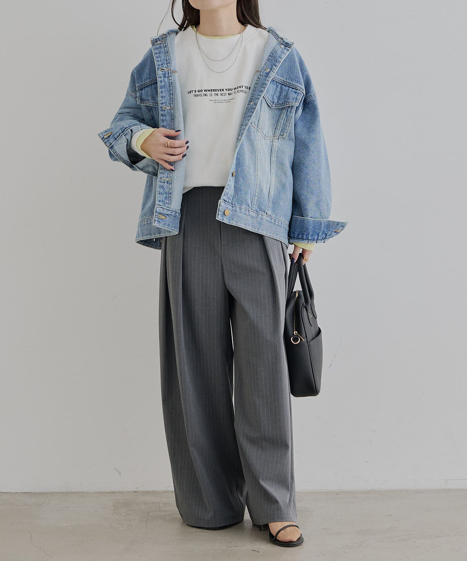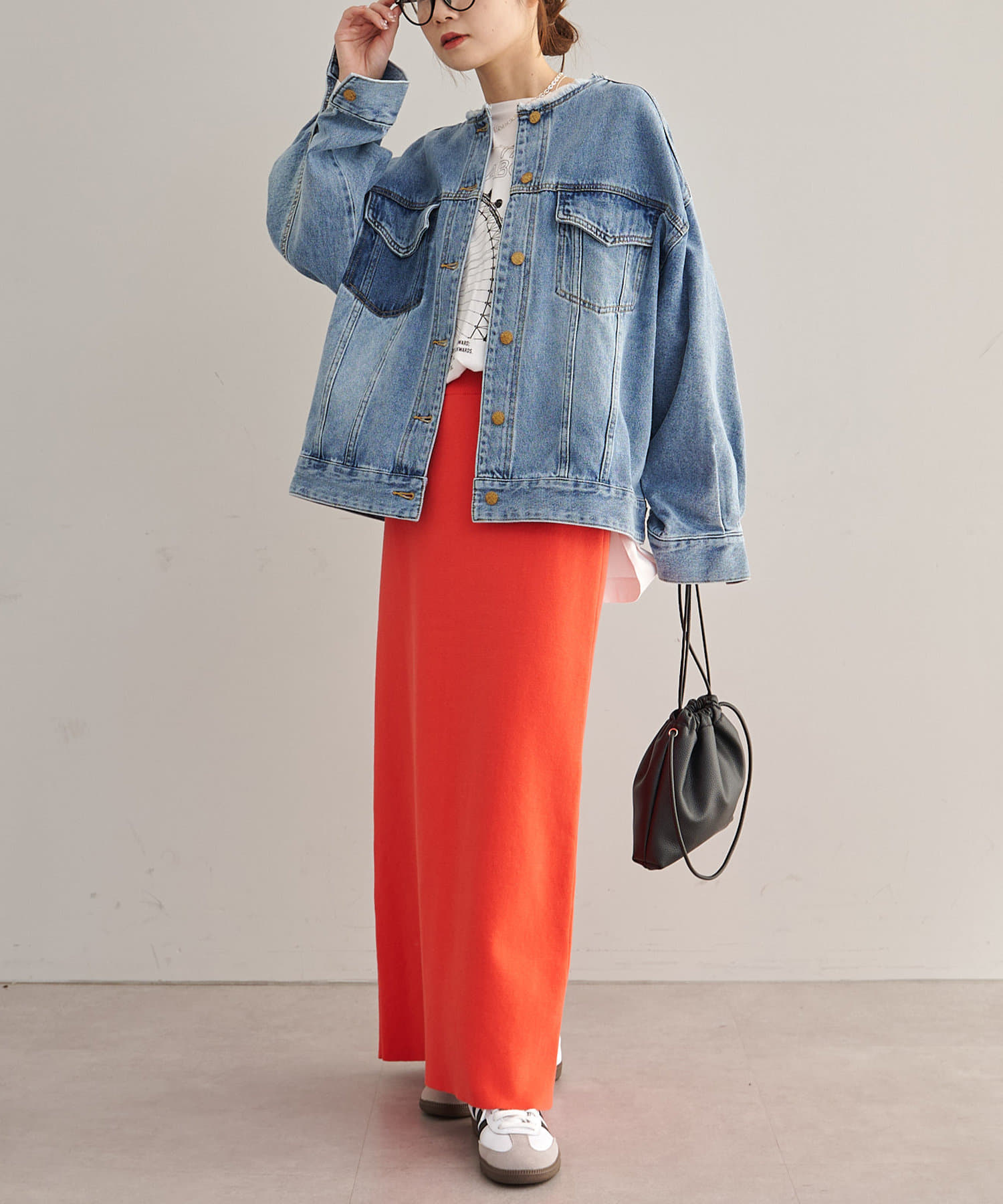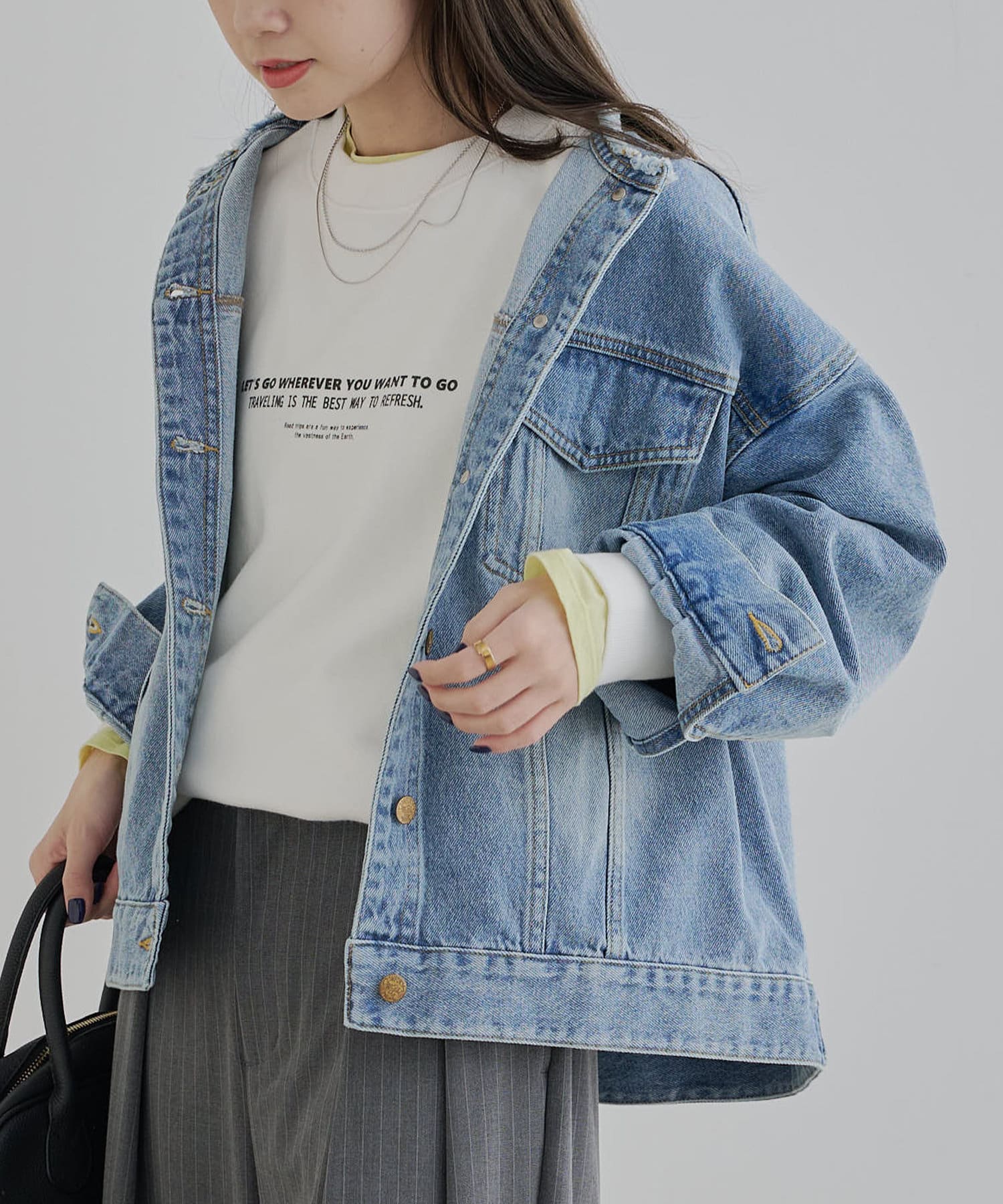 同じ色合いのデニムパンツを合わせ、デニムコーディネートでメンズライクな着こなしや