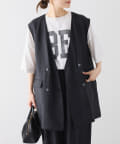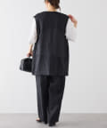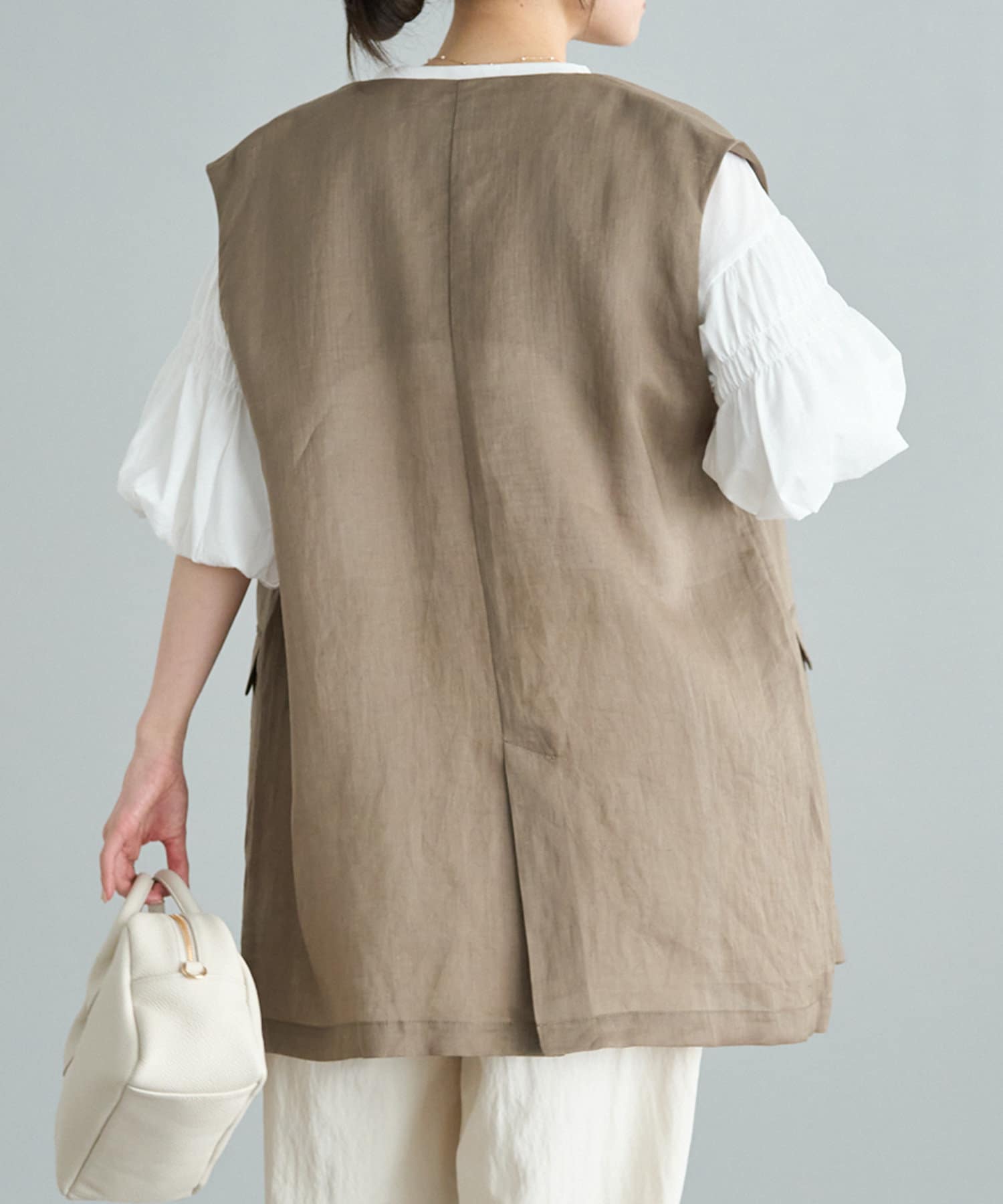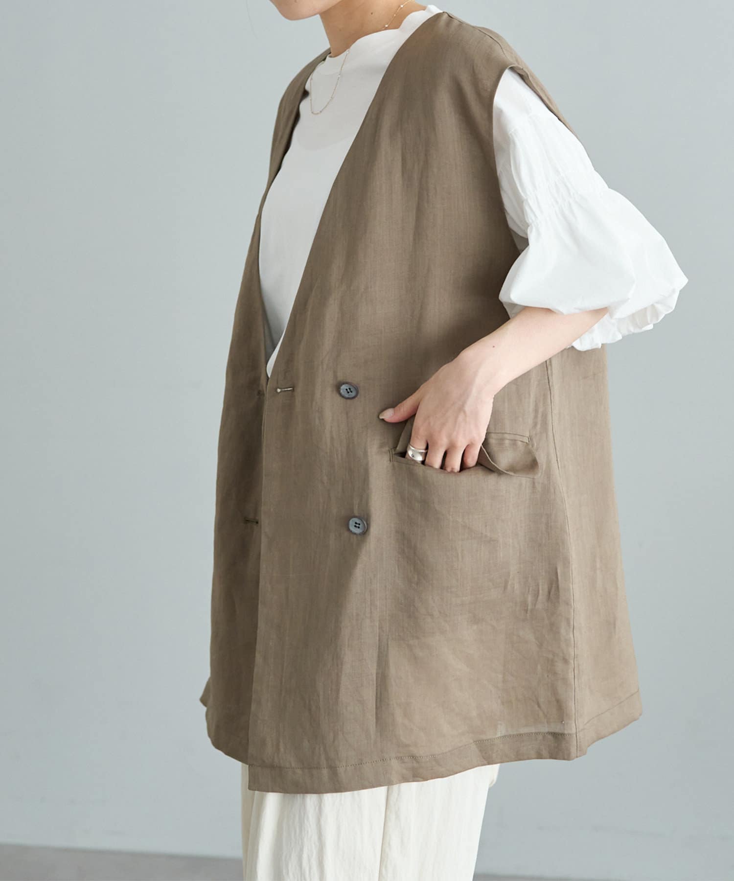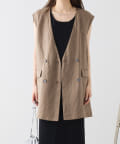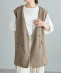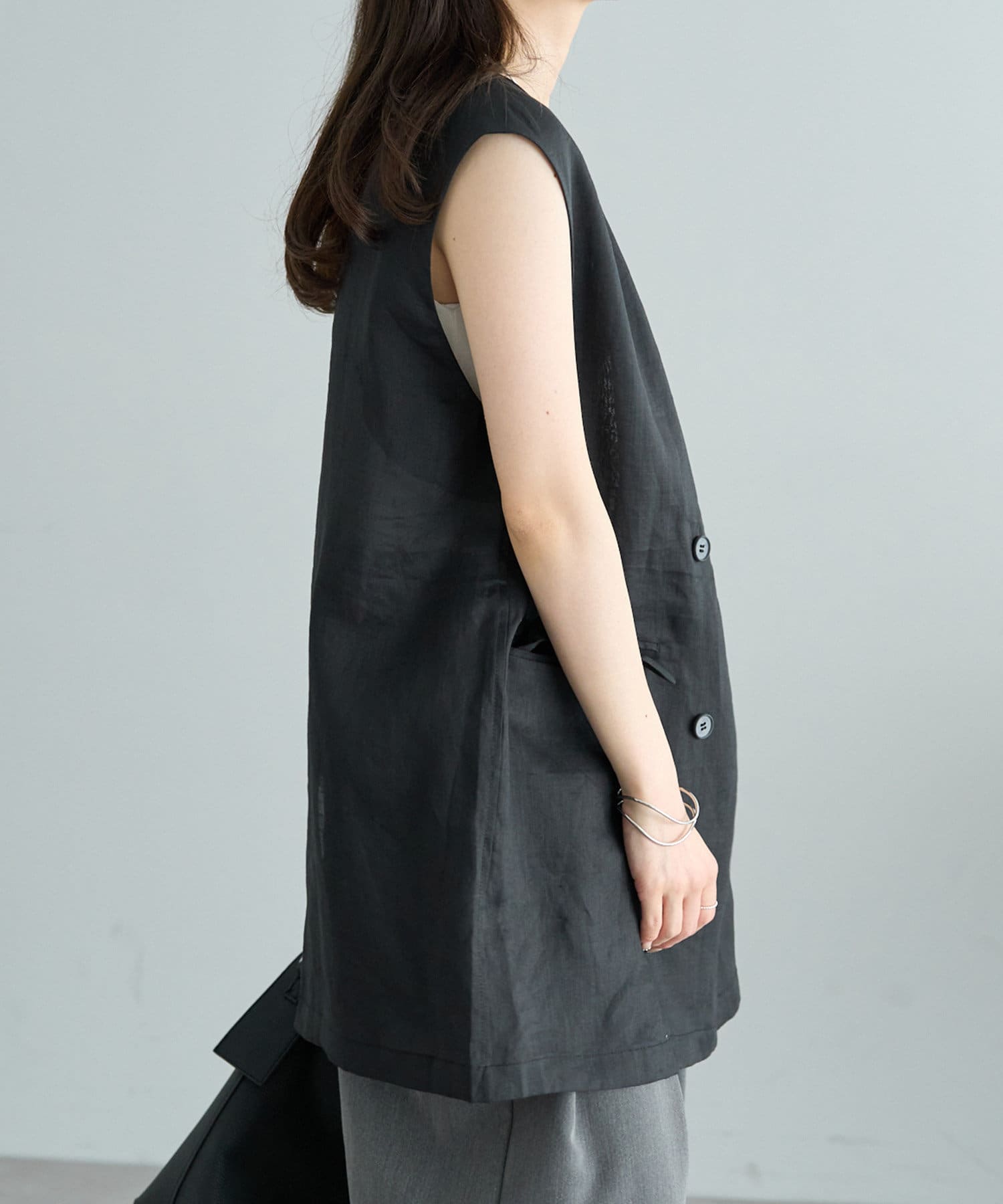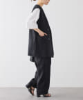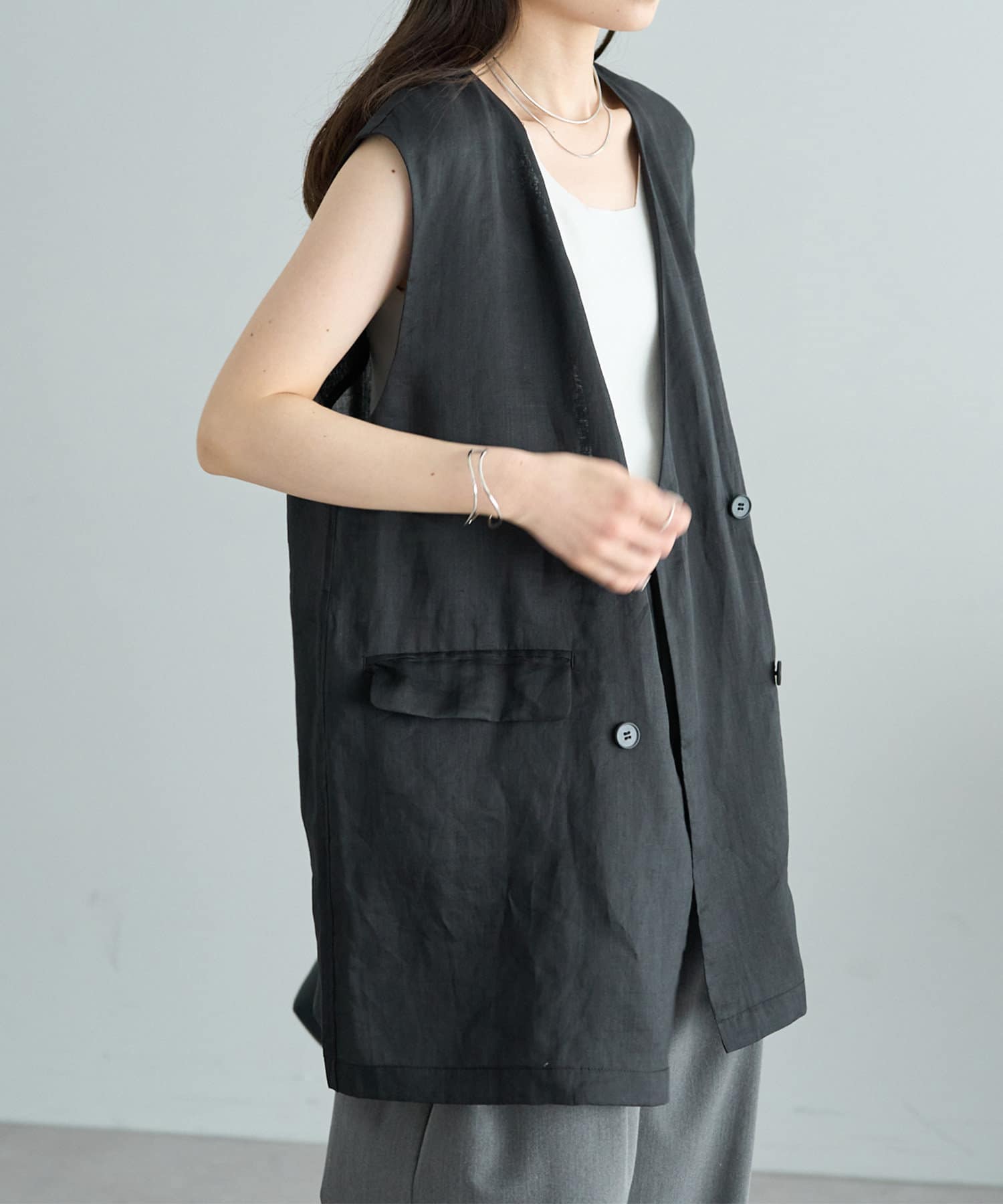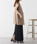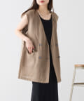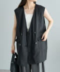 ほのかな光沢感のあるラミー生地で、清涼感が漂う軽やかなノーカラージレベスト。