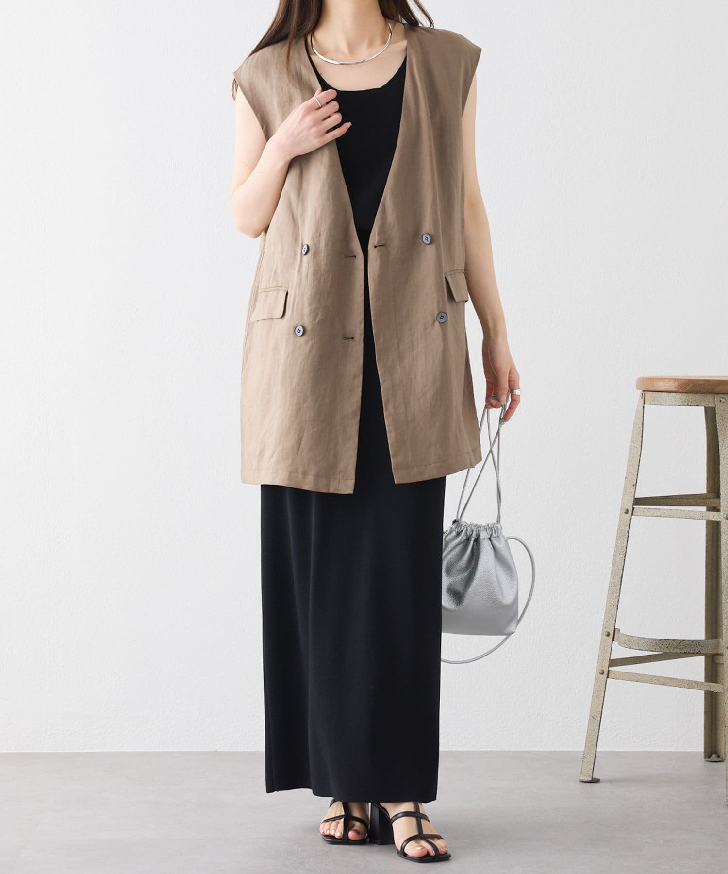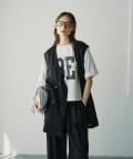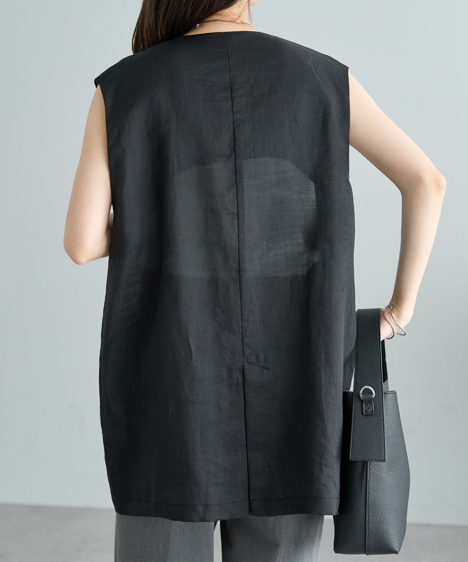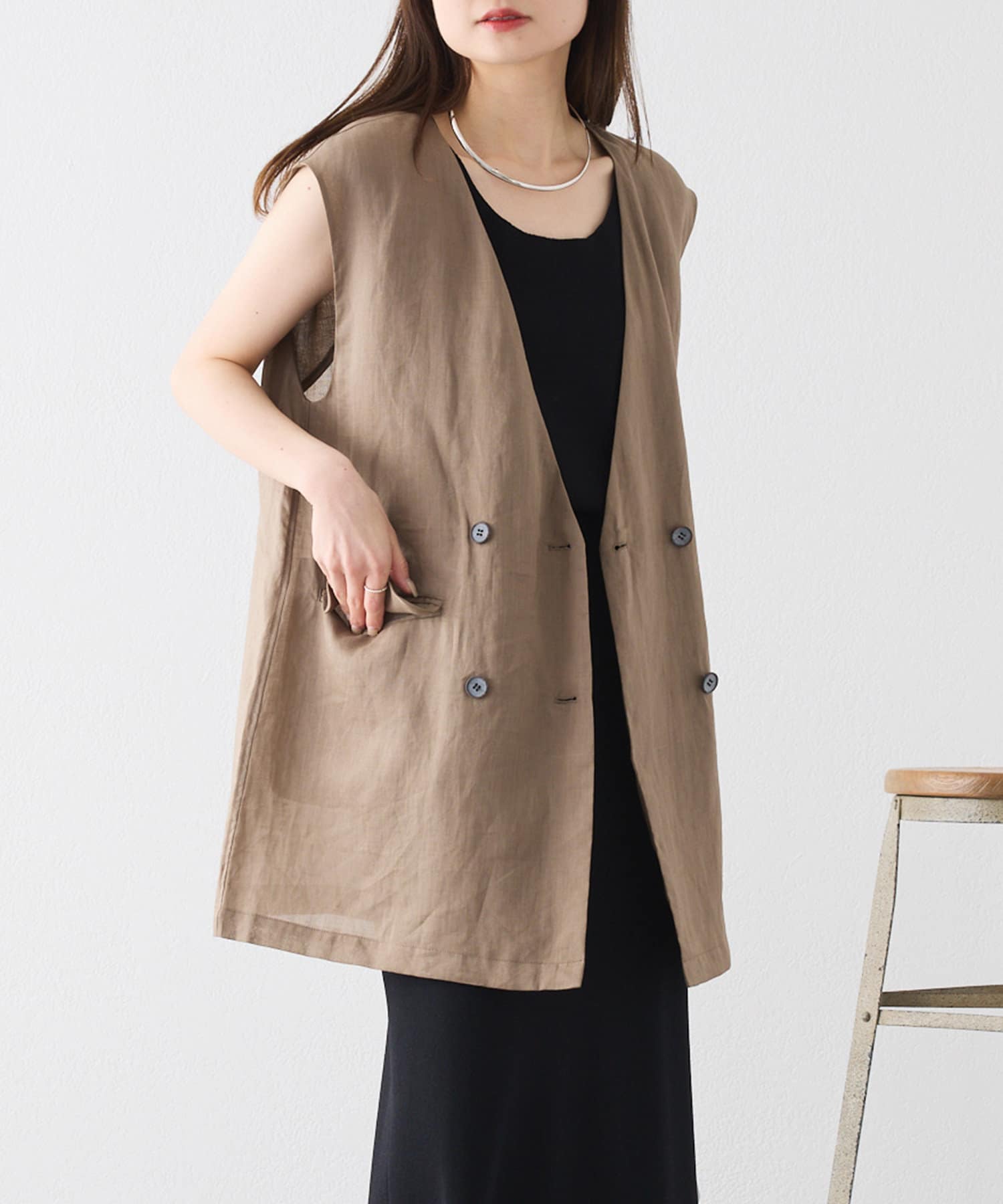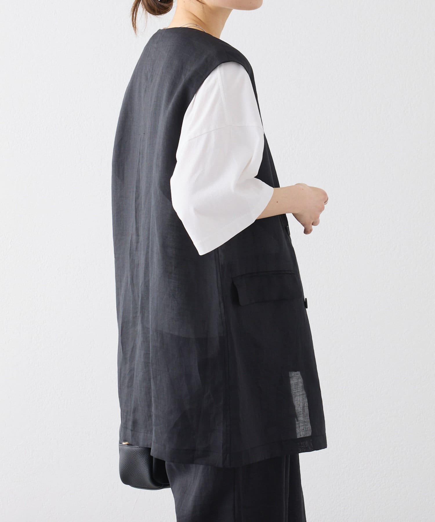 ほのかな光沢感のあるラミー生地で、清涼感が漂う軽やかなノーカラージレベスト。