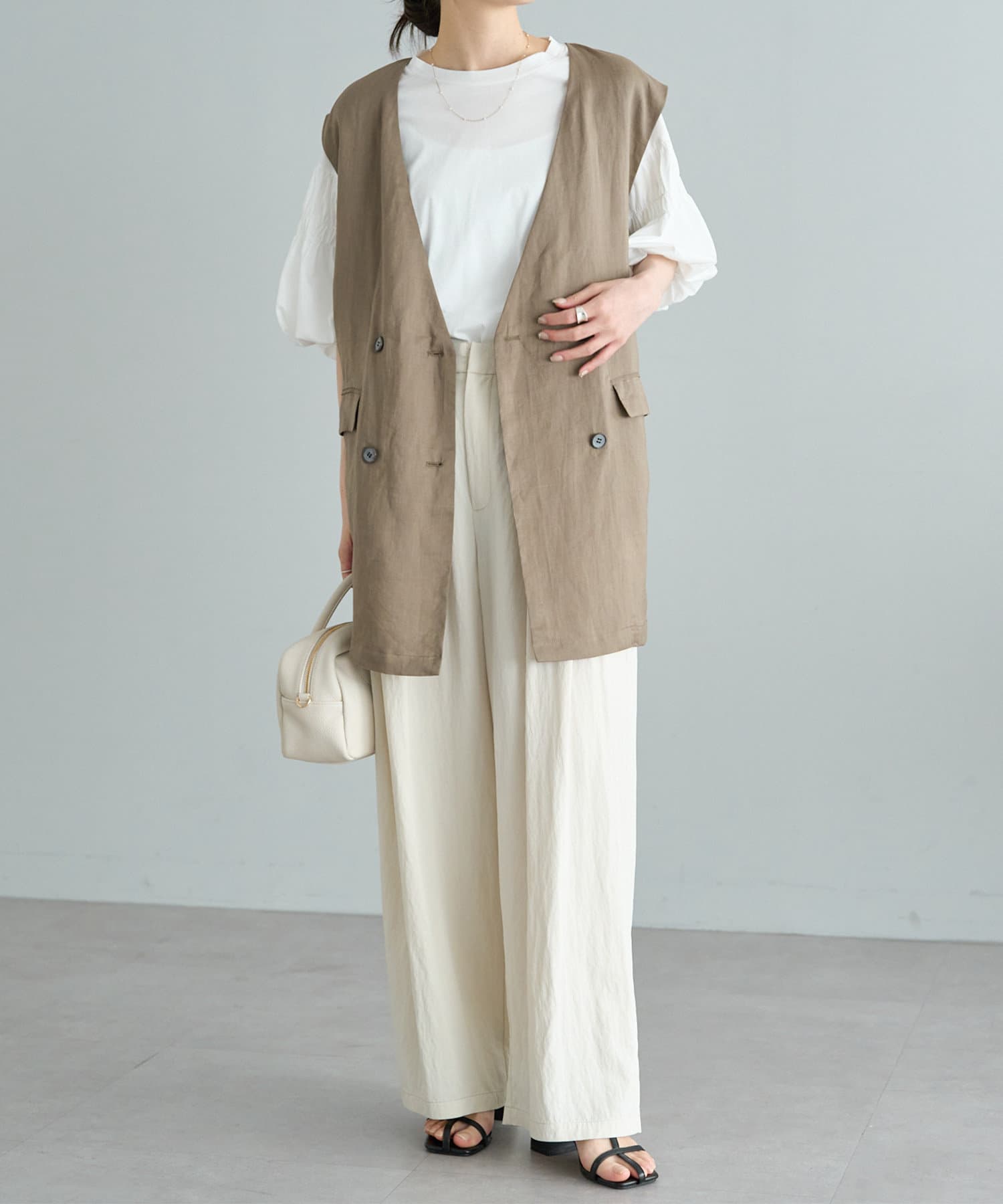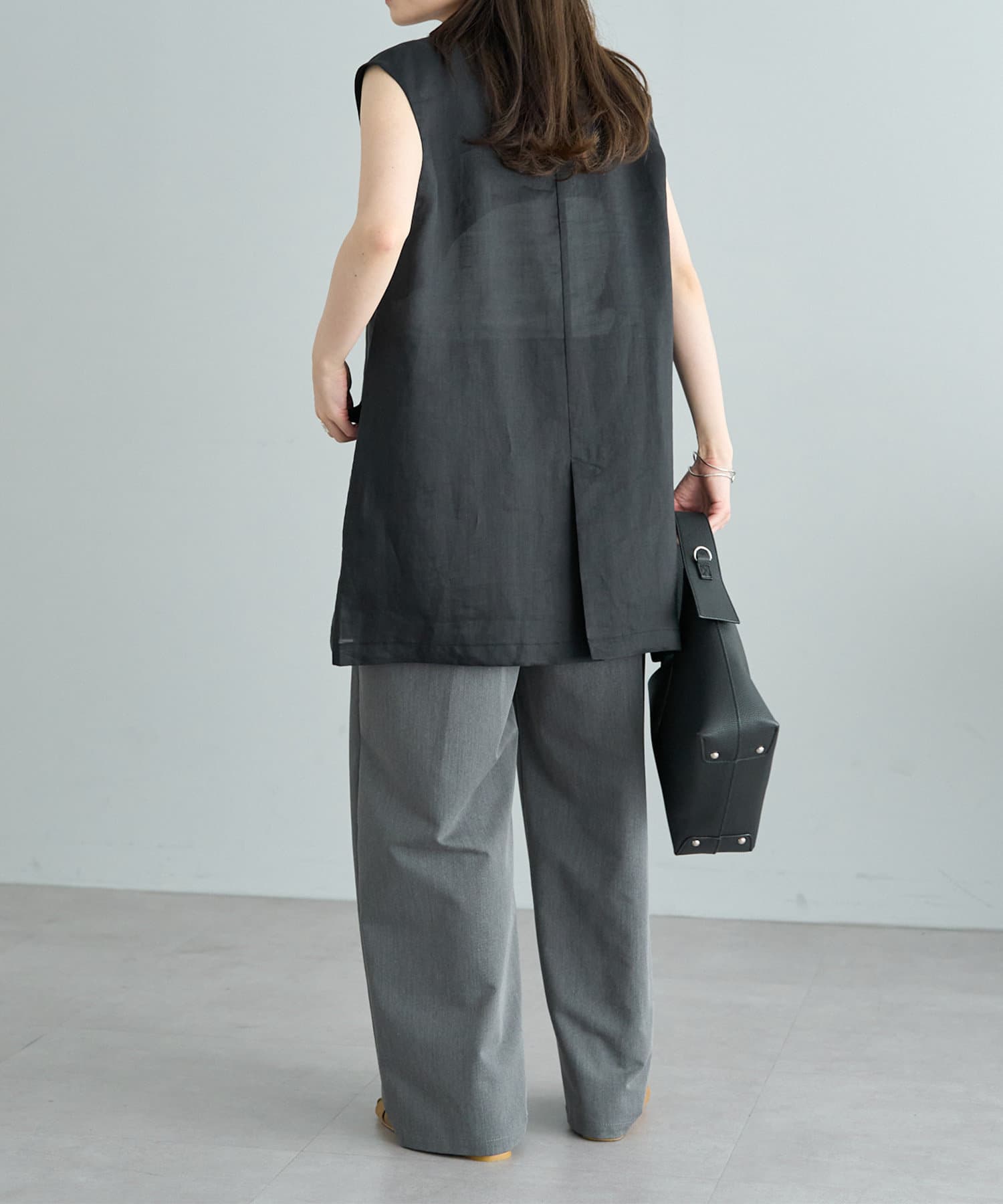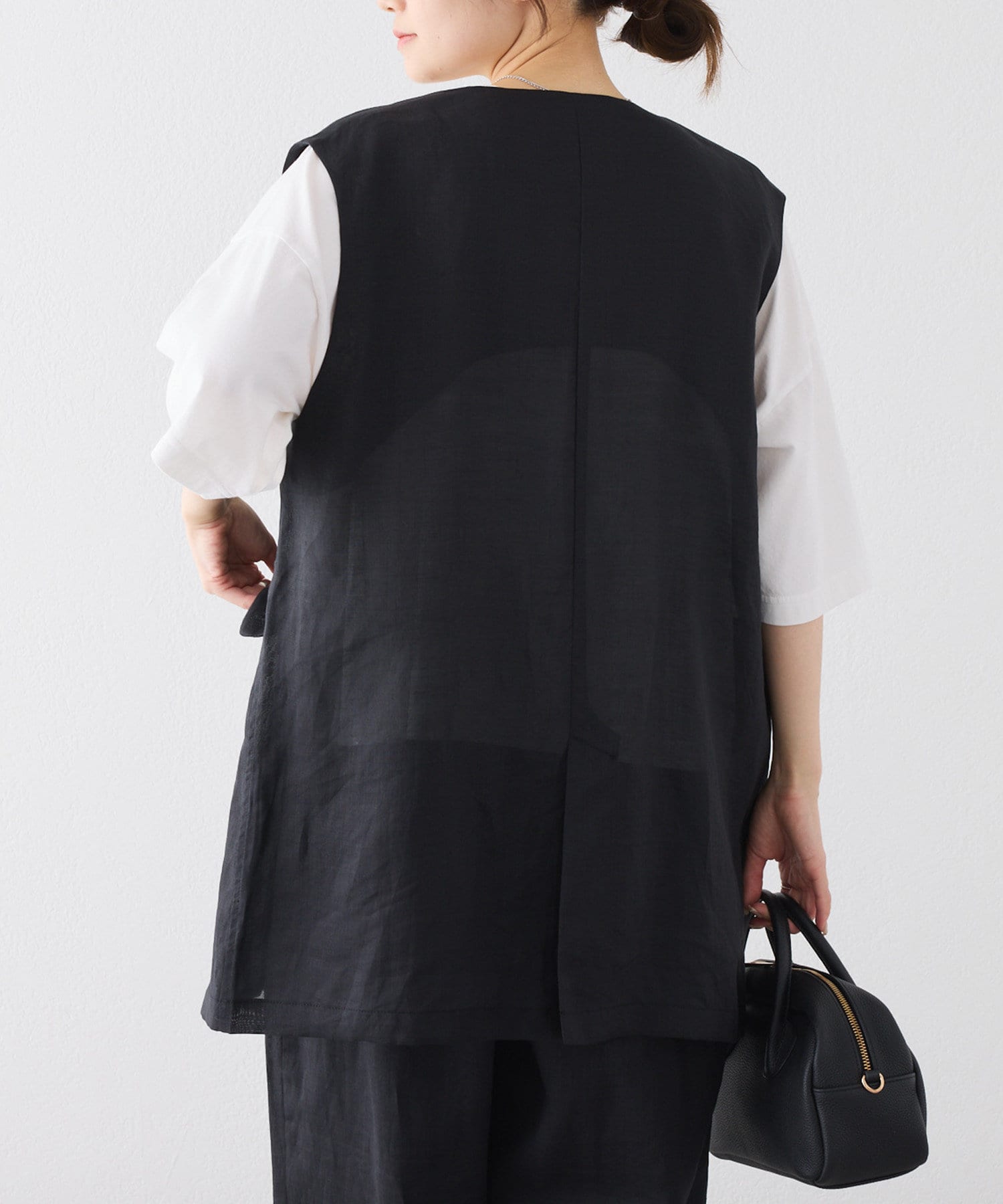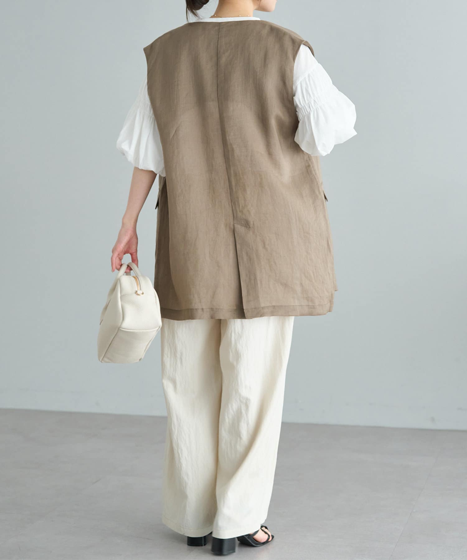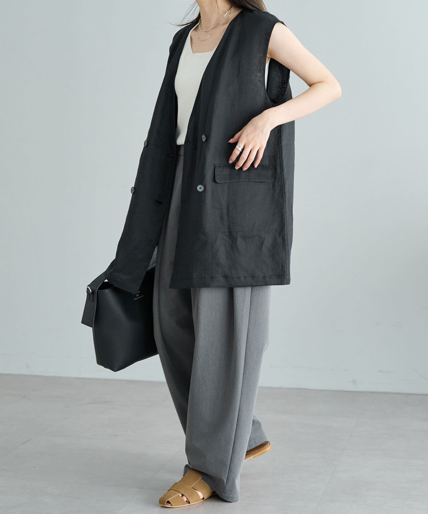 ほのかな光沢感のあるラミー生地で、清涼感が漂う軽やかなノーカラージレベスト。