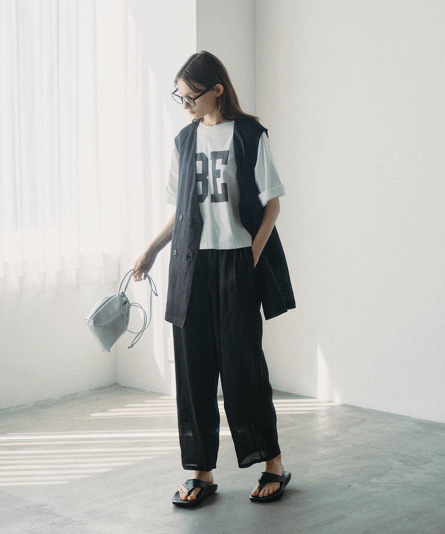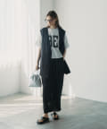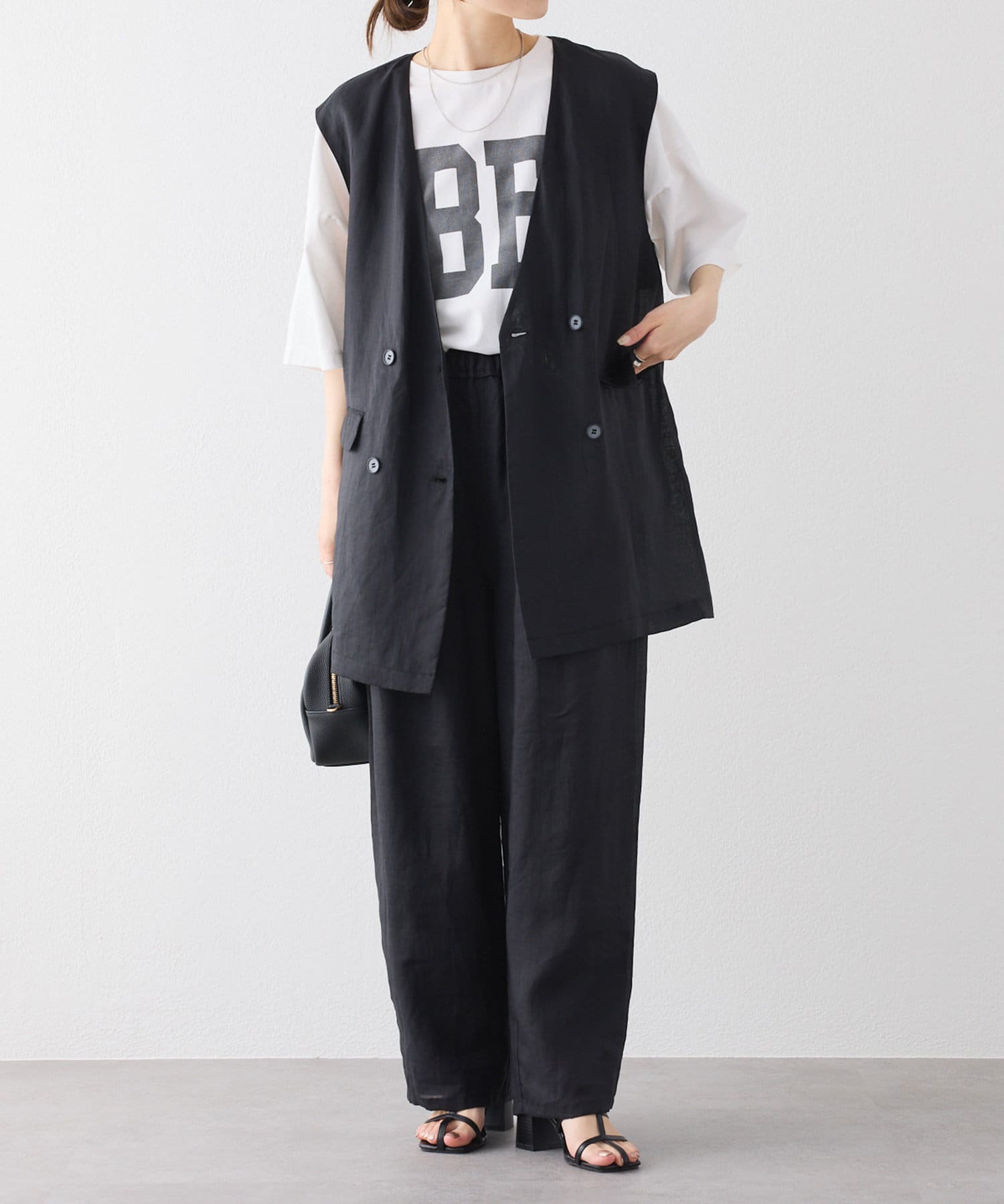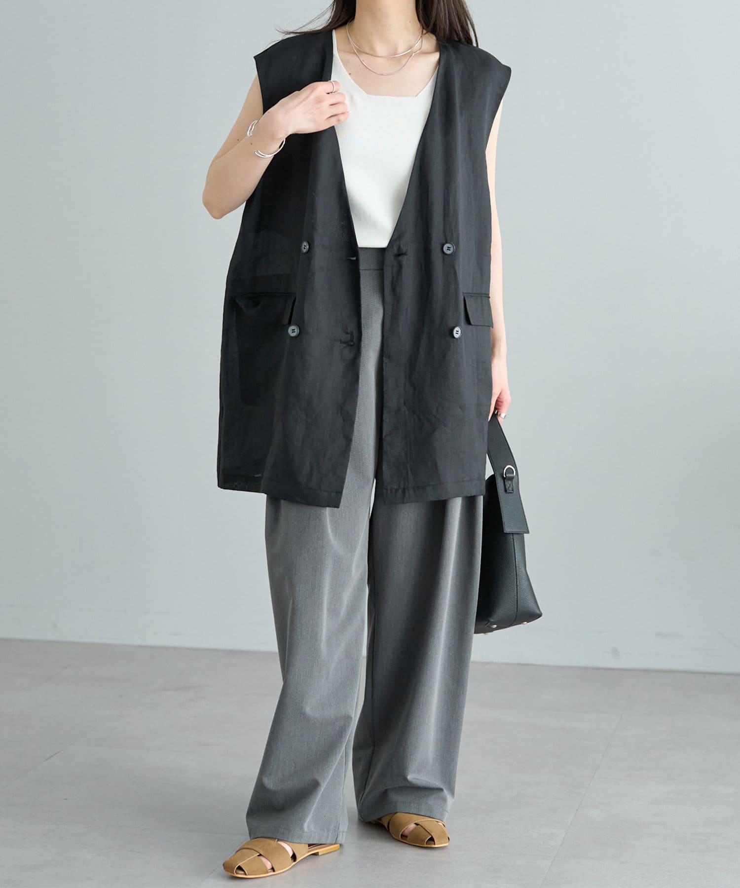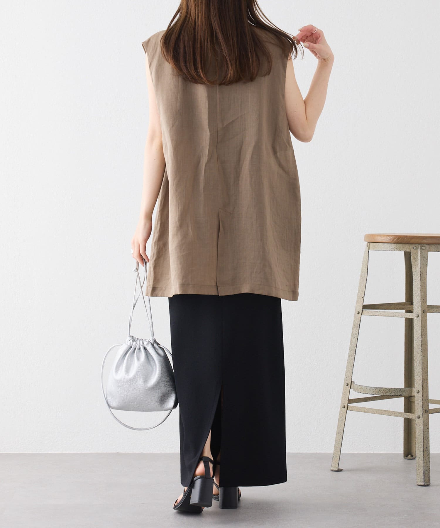 ほのかな光沢感のあるラミー生地で、清涼感が漂う軽やかなノーカラージレベスト。