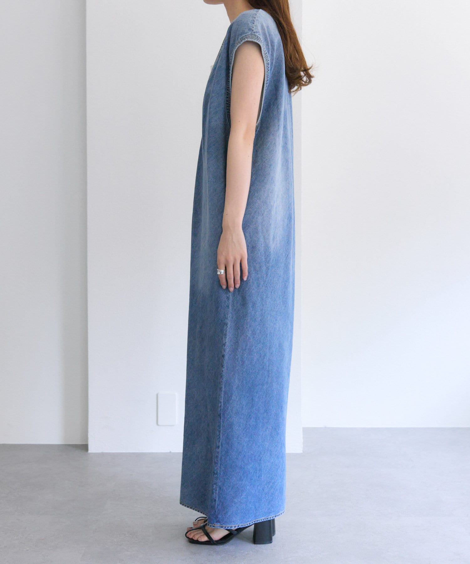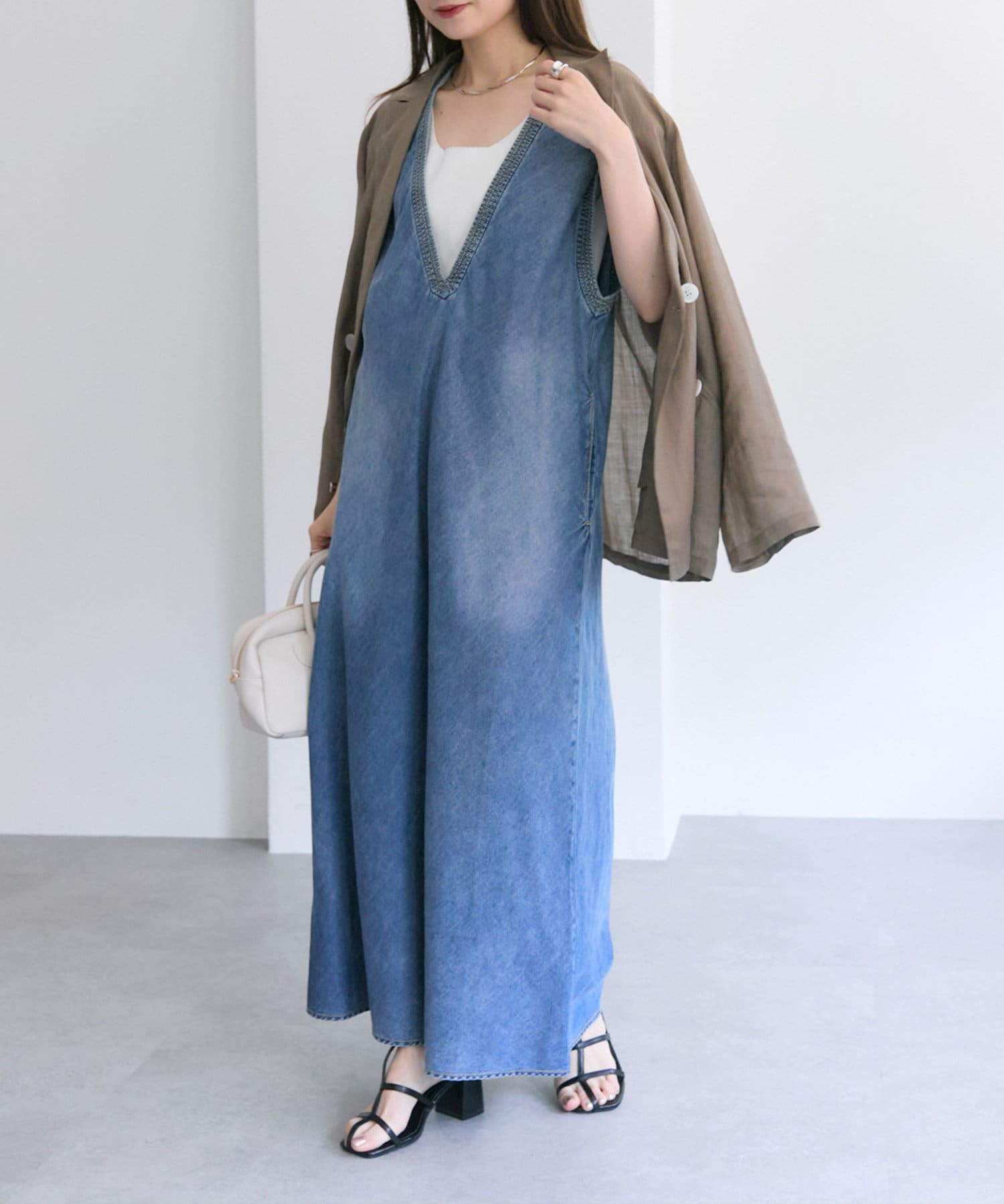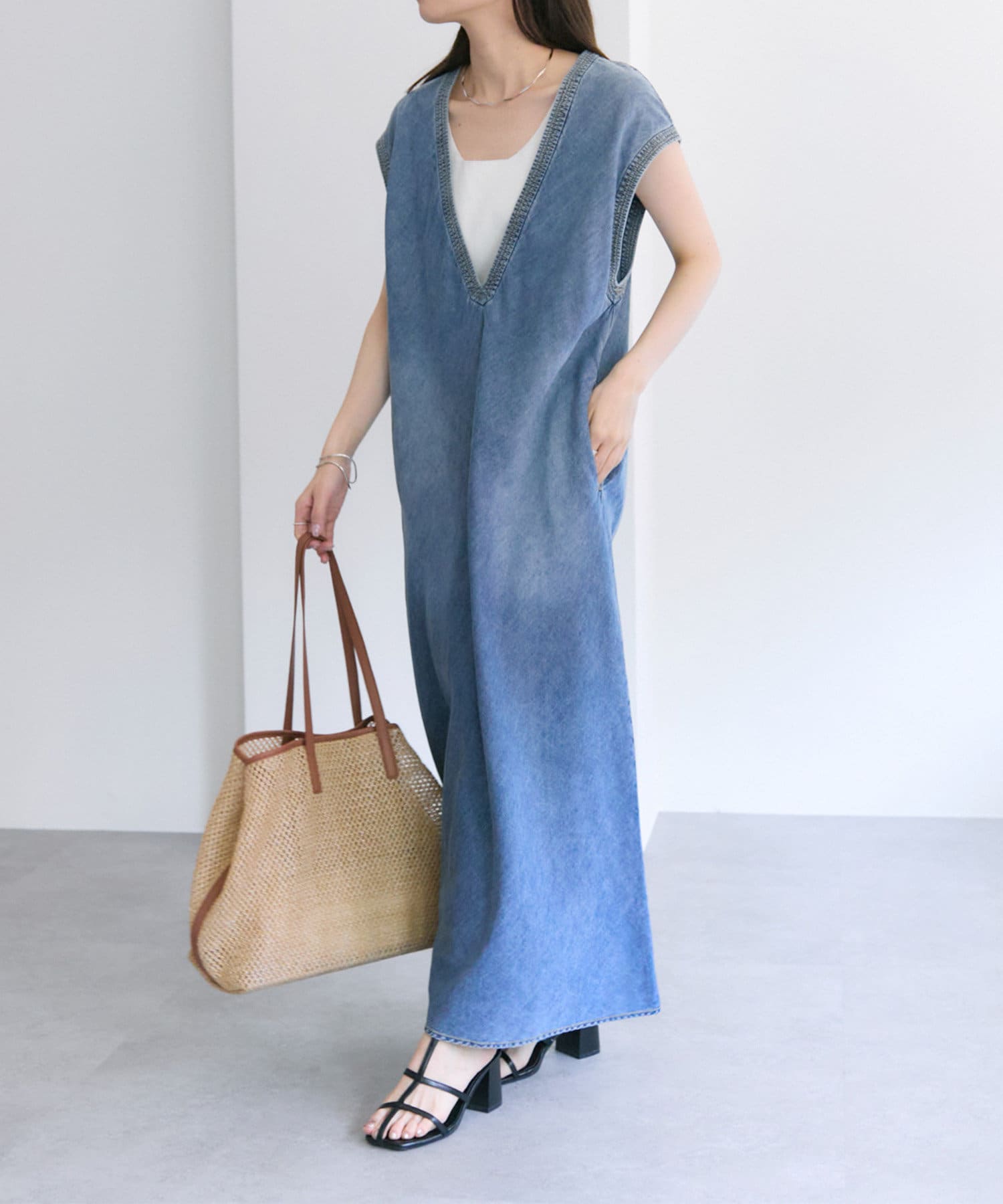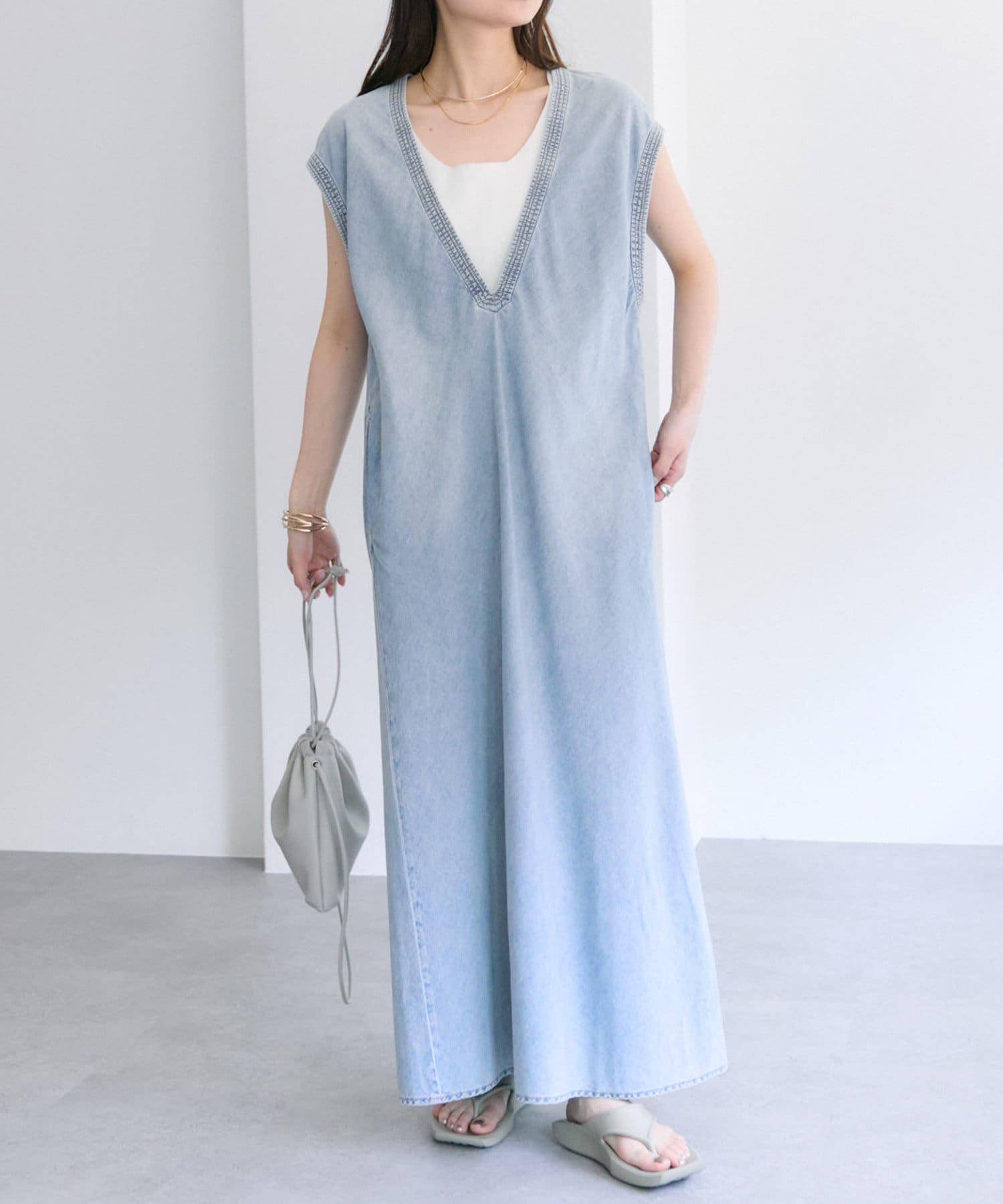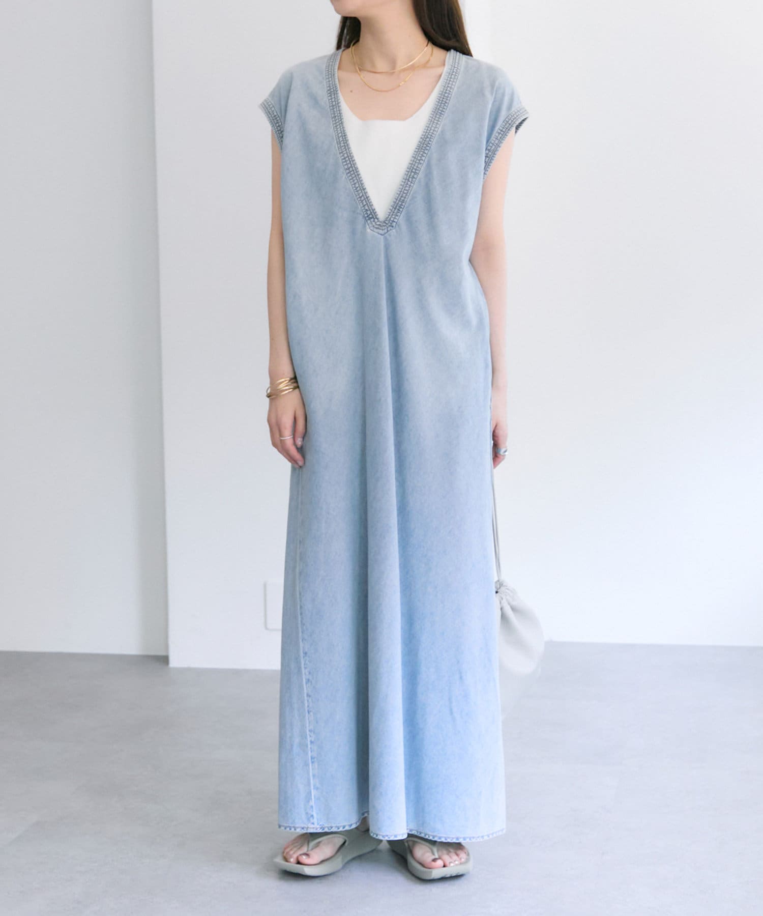 深いVネックとIラインに近いシルエットがシンプルながら洗練されたデザインのデニムワンピース。