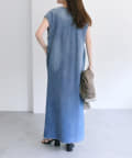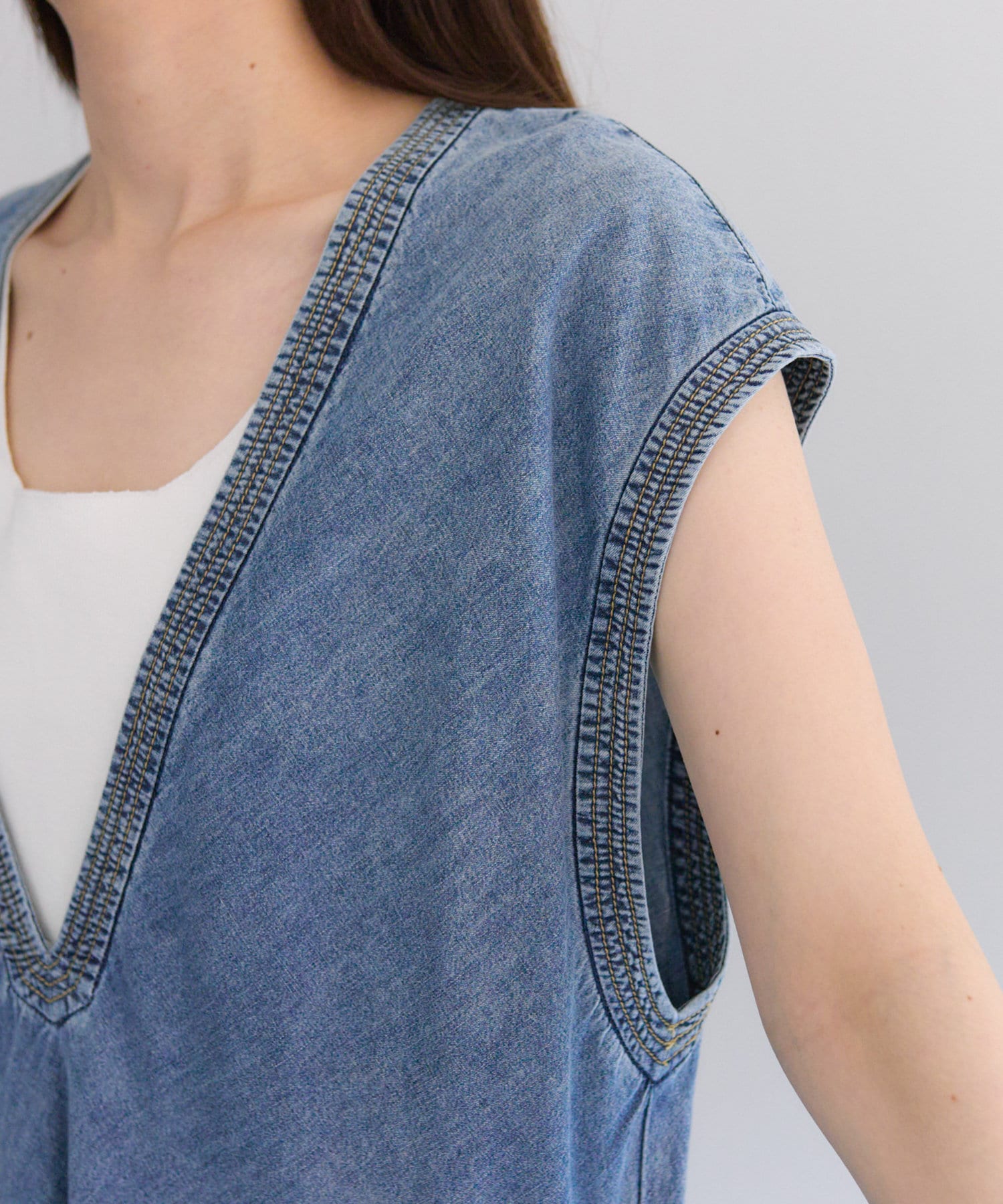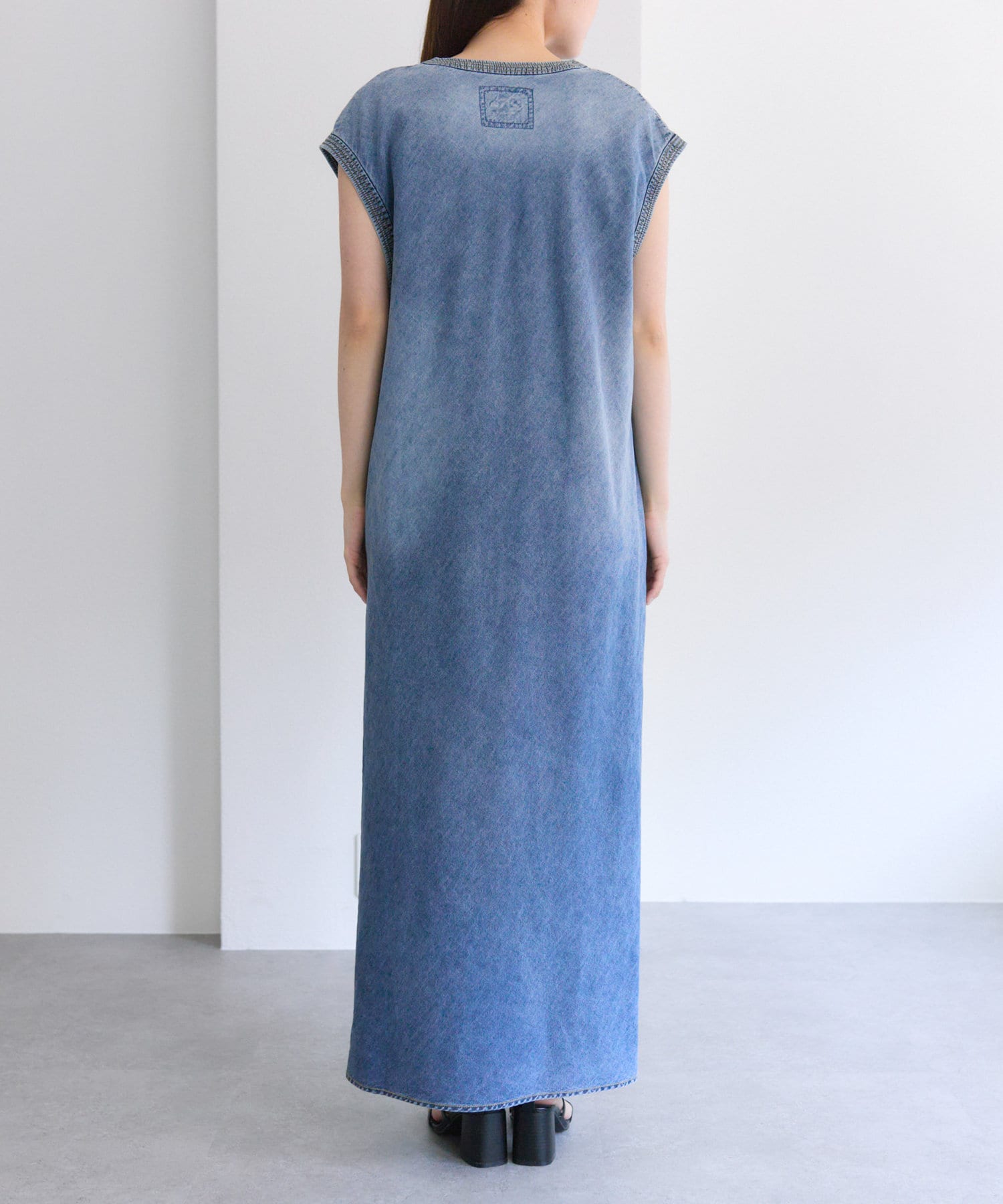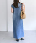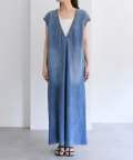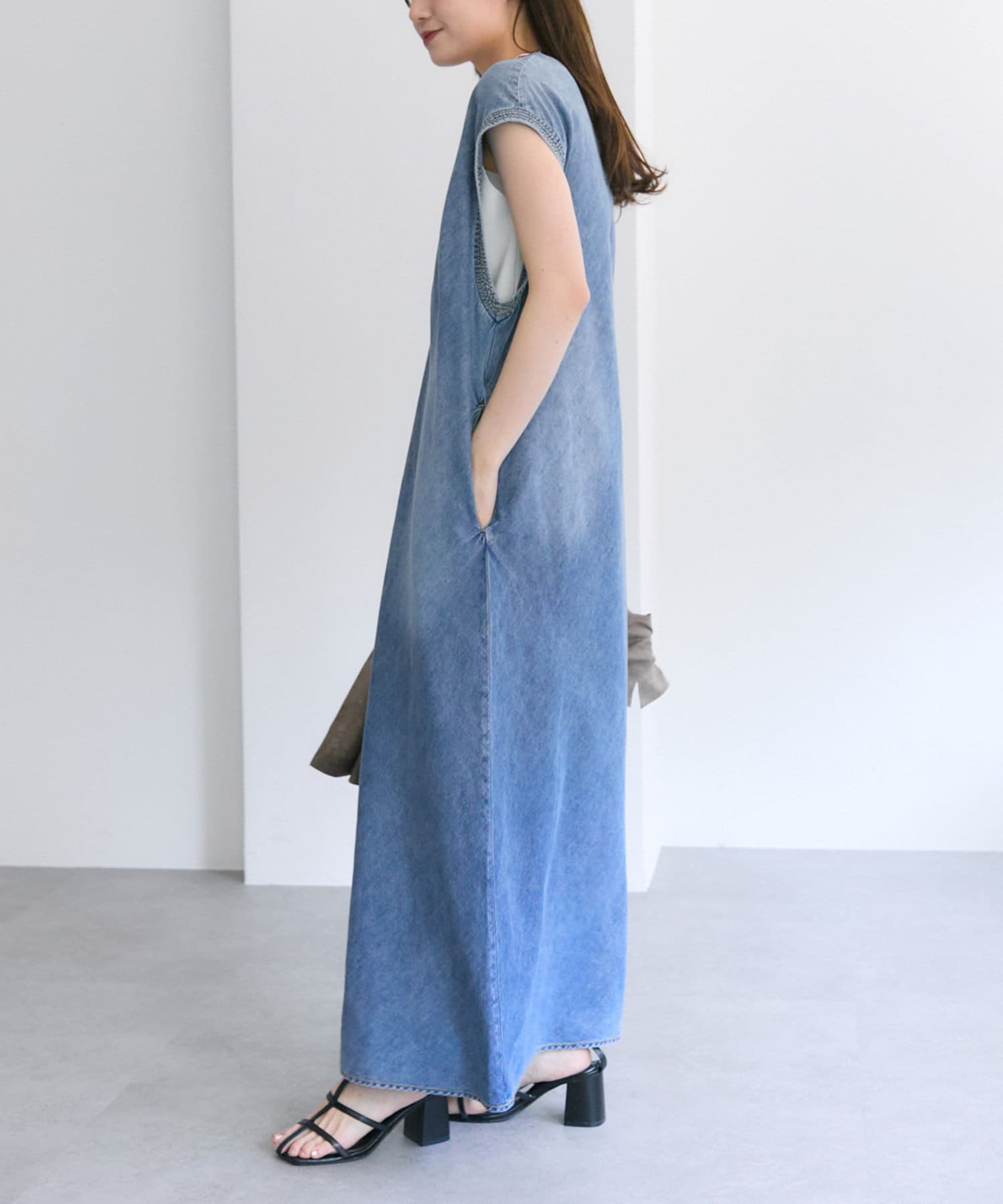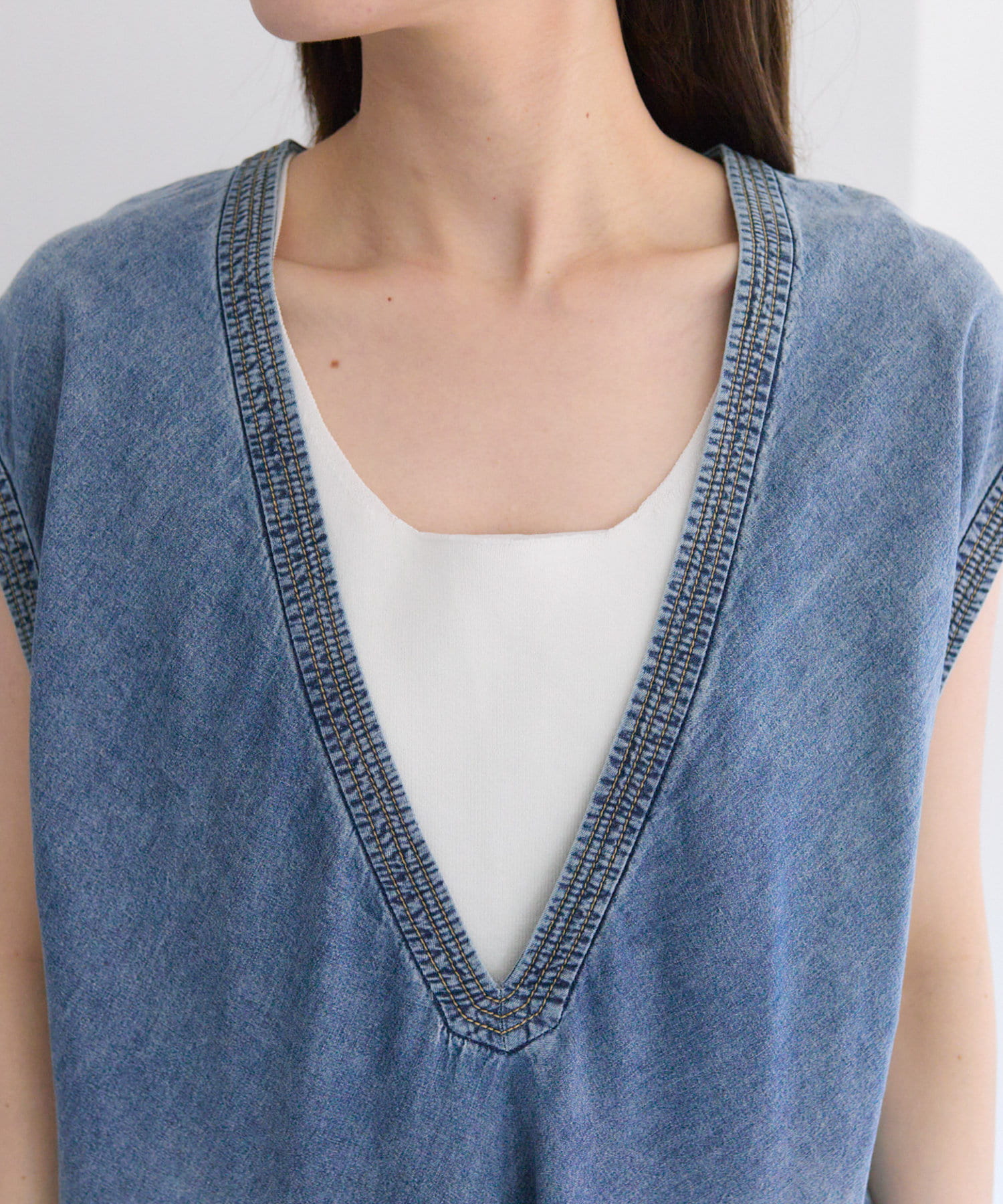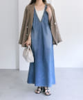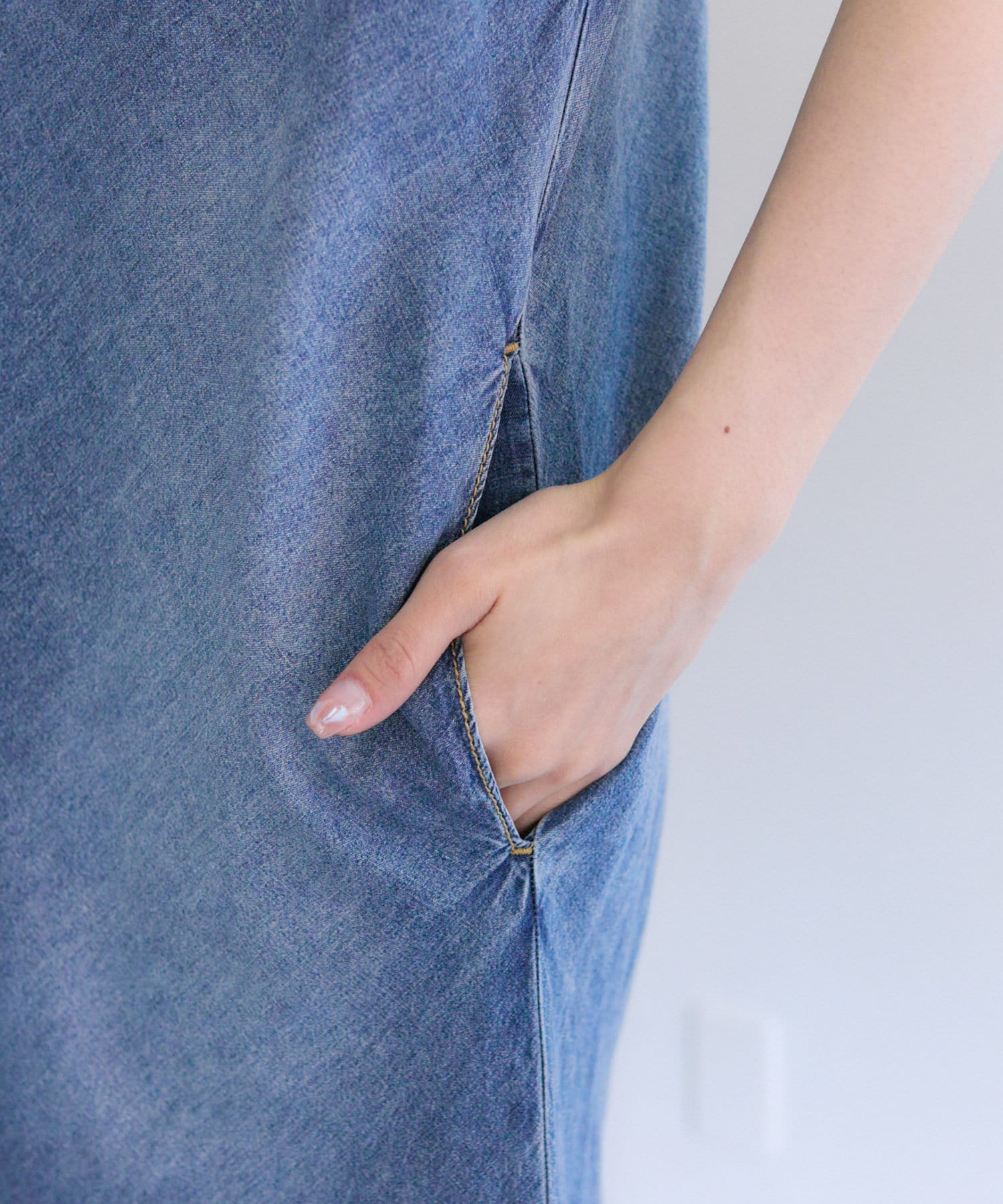 深いVネックとIラインに近いシルエットがシンプルながら洗練されたデザインのデニムワンピース。