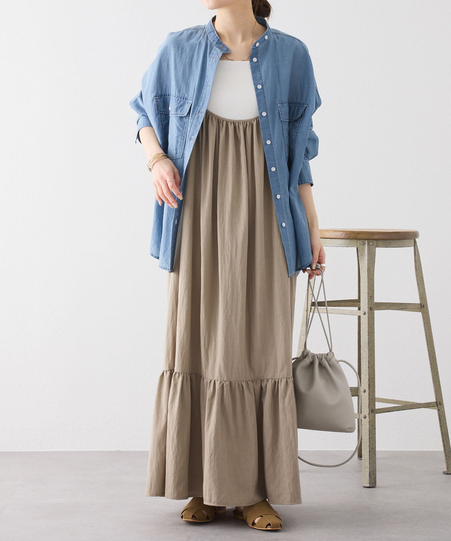 またインナーにタンクトップを合わせ上からシャツをバサッと羽織る