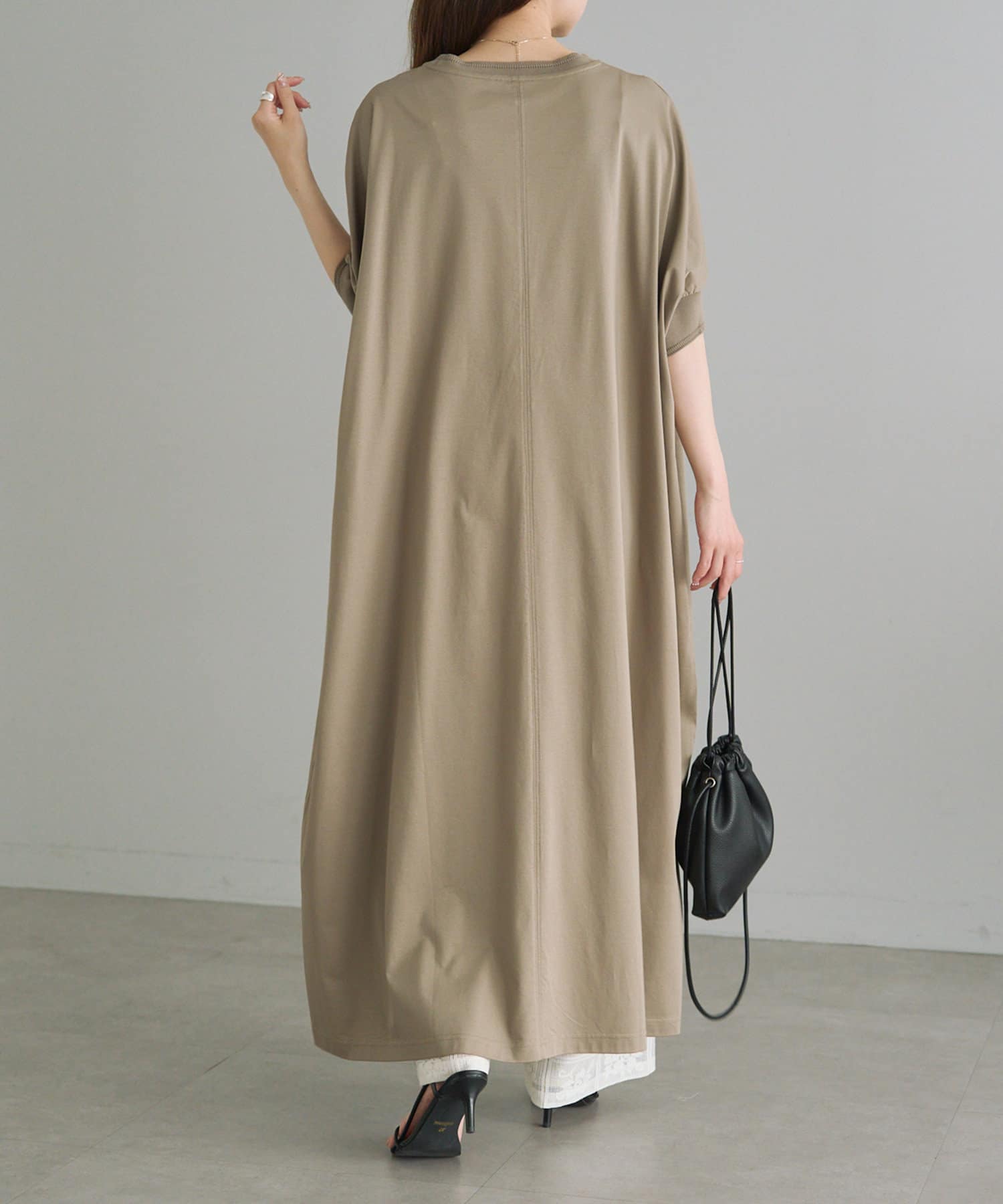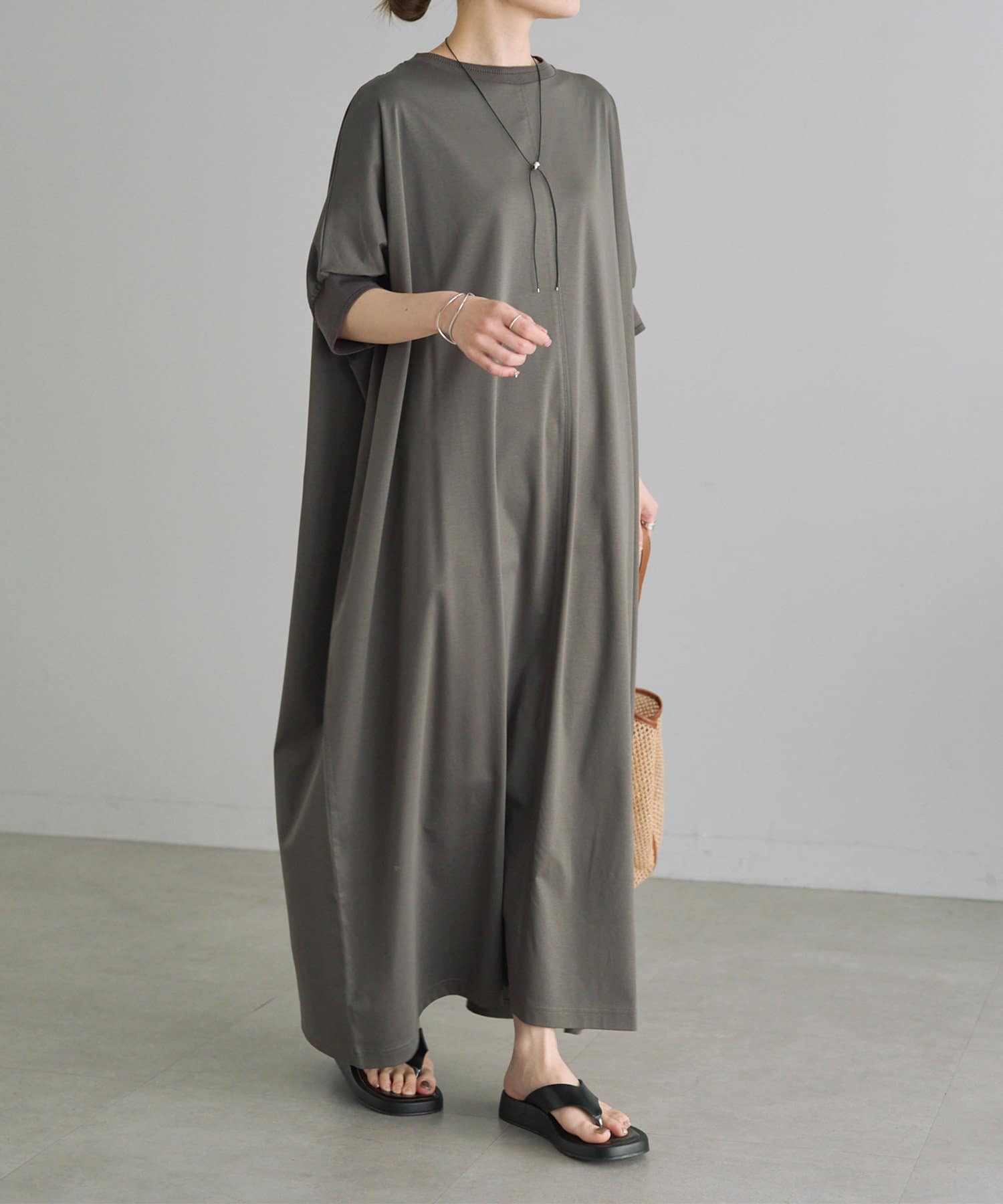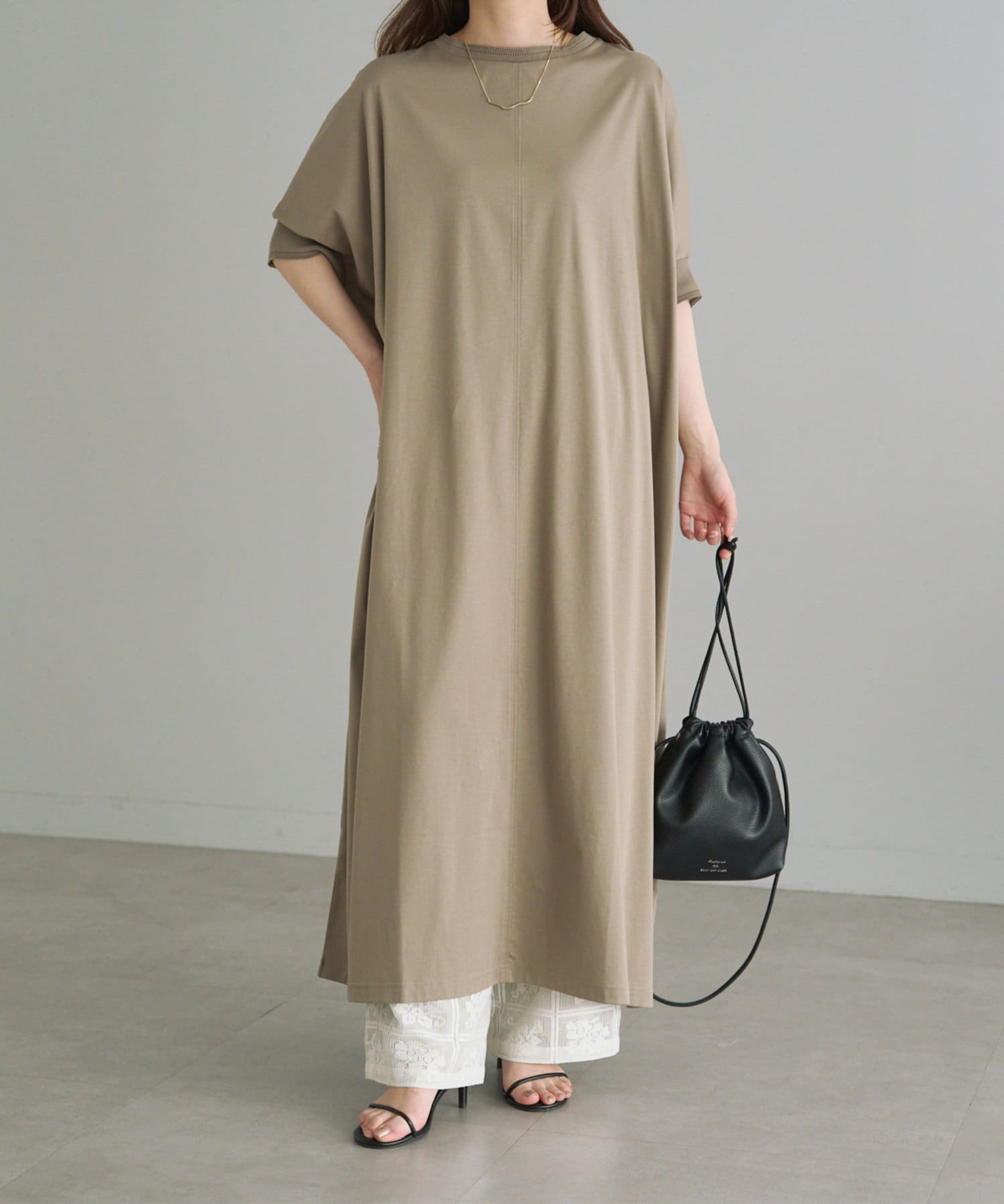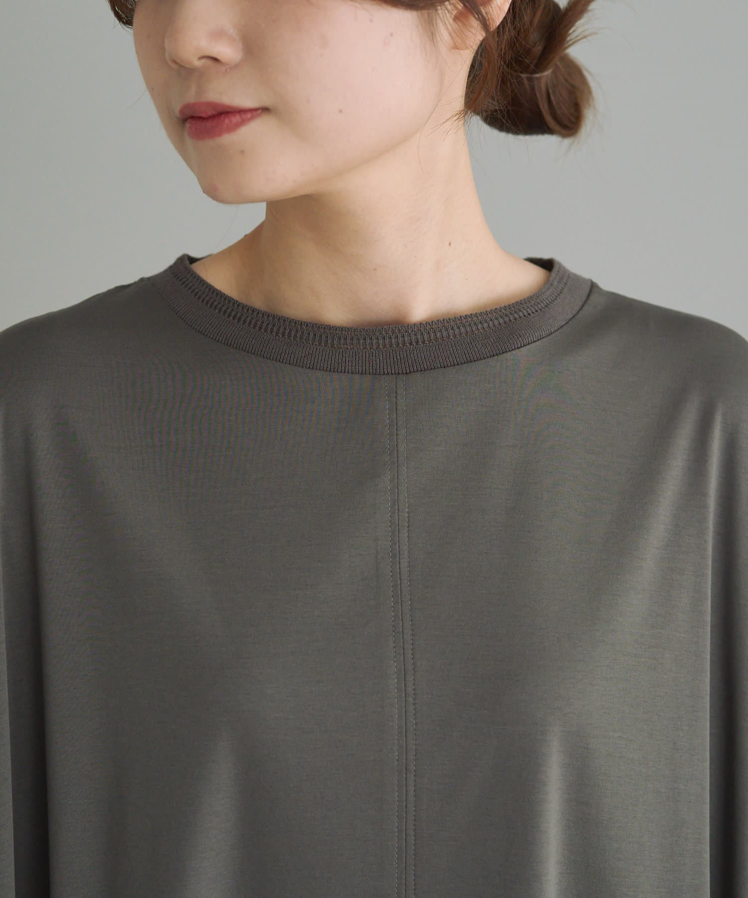 ゆとりを持たせたワイドシルエットでボディラインを拾わないのもうれしいポイント。